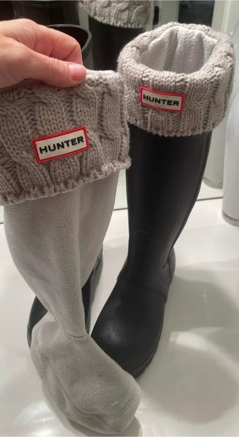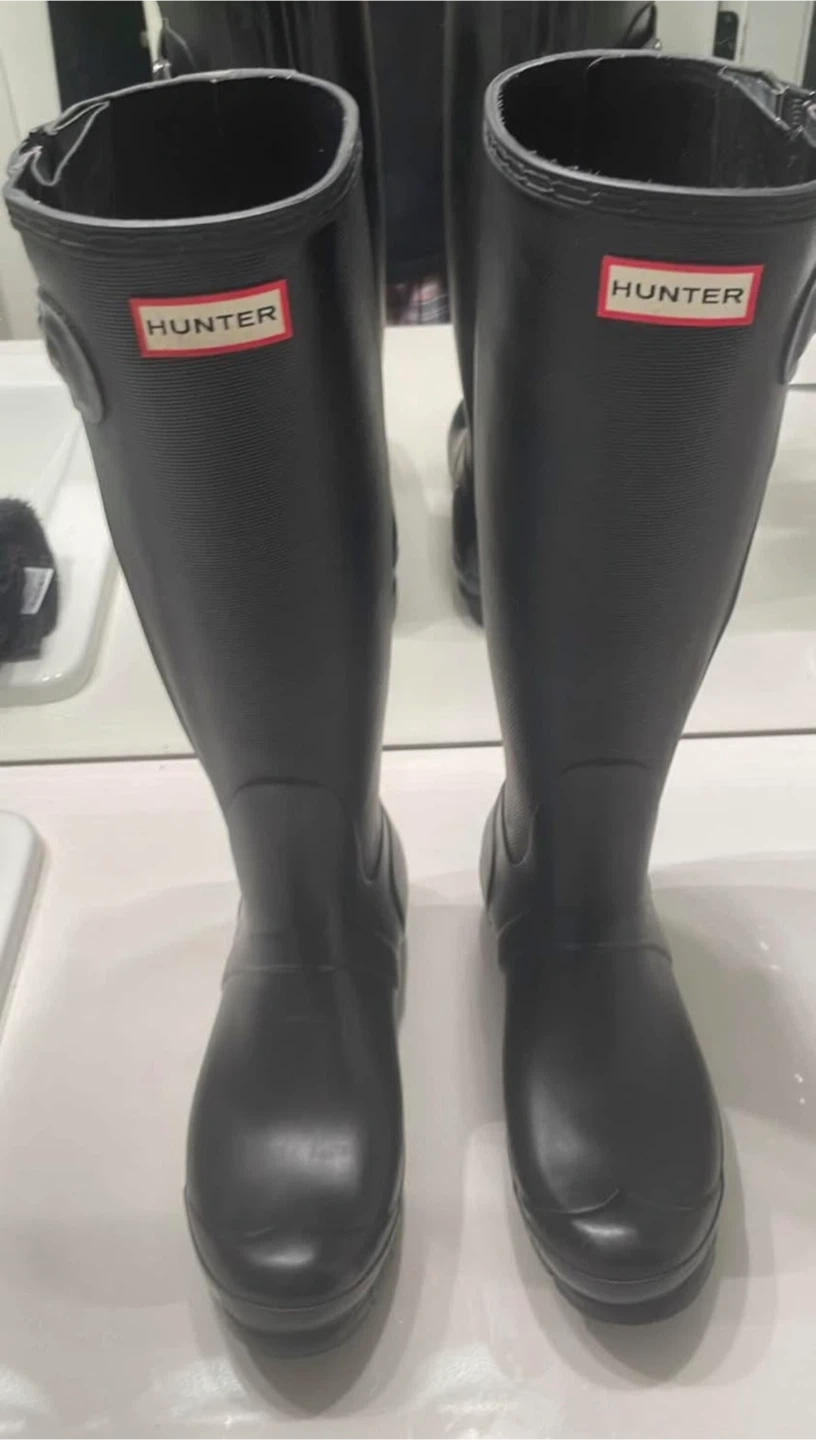 Classic black tall rubber rain boots from Hunter. These boots feature a durable rubber construction and the iconic Hunter logo. They're perfect for staying dry in wet weather, whether you're out for a walk or just running SIZE 7 women’s