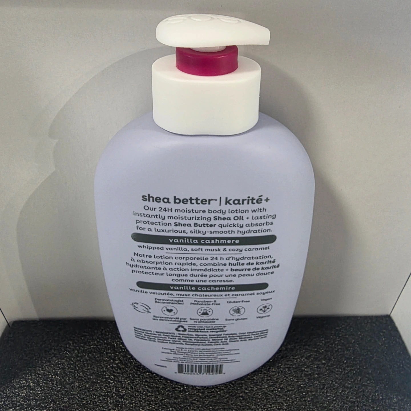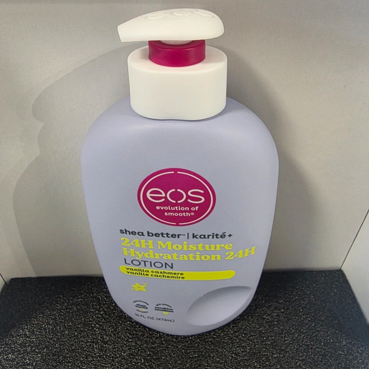 This EOS lotion offers 24-hour moisture with Shea Butter and Karité+. It's a vanilla cashmere scent with whipped vanilla, soft musk & cozy caramel notes. 16 FL OZ (473mL) bottle. It's dermatologically tested and gluten-free.