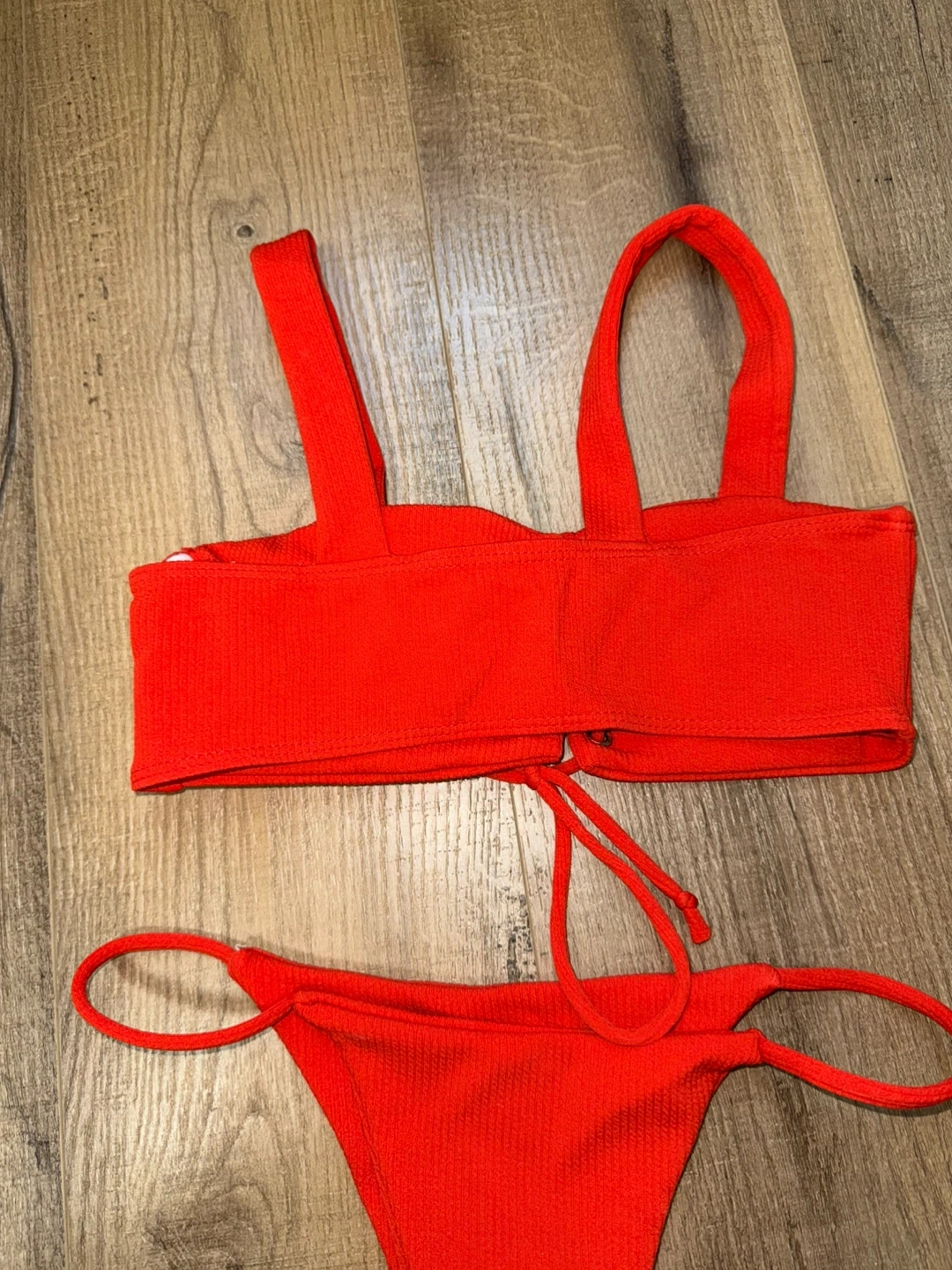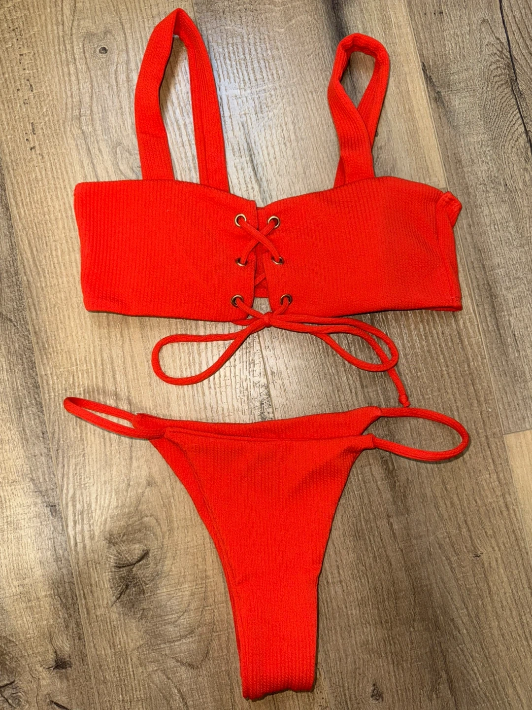 A bright red ribbed bikini set featuring a lace-up front on the top. This two-piece includes a bandeau-style top with adjustable straps and a matching thong bottom. Material is a stretchy ribbed fabric. Purchased from SHEIN. Size small. Worn as seen in last photo!