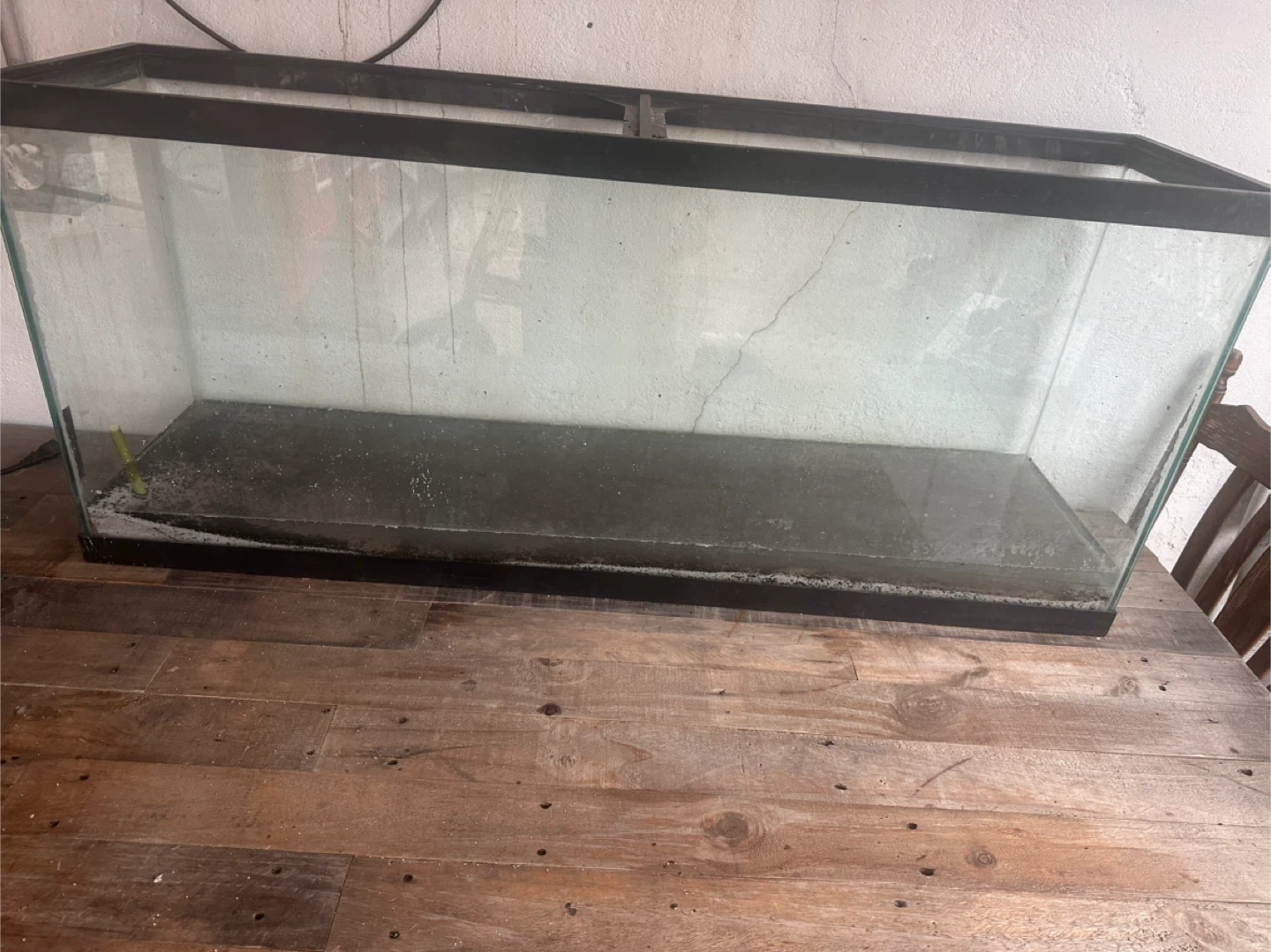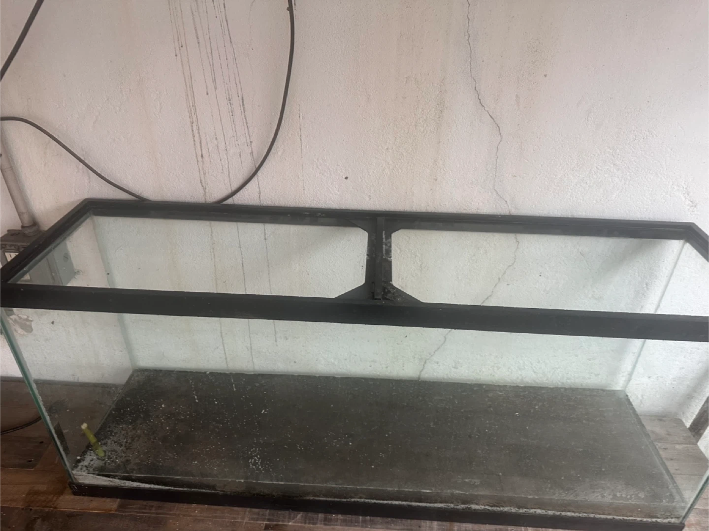 This is a large glass aquarium tank. It's made of glass with a black plastic trim.