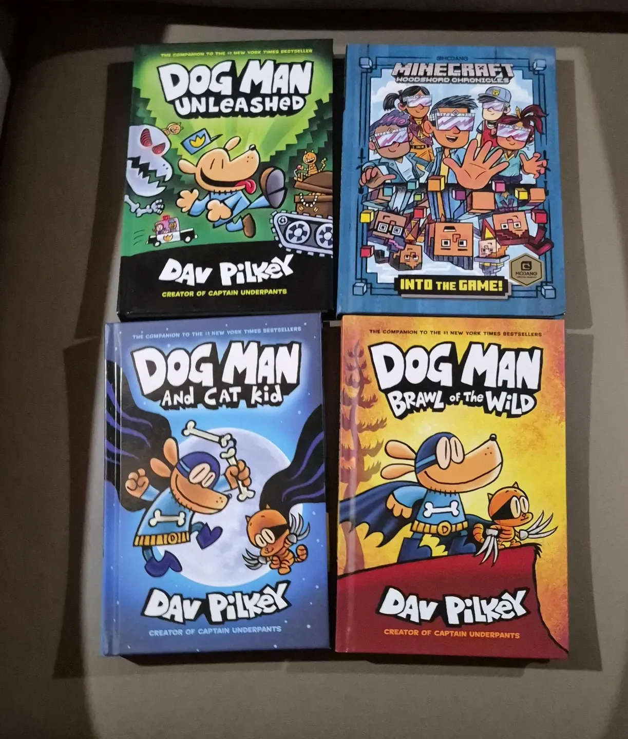 This lot includes four books: Dog Man Unleashed, Dog Man and Cat Kid, Dog Man: Brawl of the Wild, and Minecraft: Woodsword Chronicles. They're written by Dav Pilkey and Mojang. These are children's graphic novels. Great for young readers who enjoy humour and adventure!