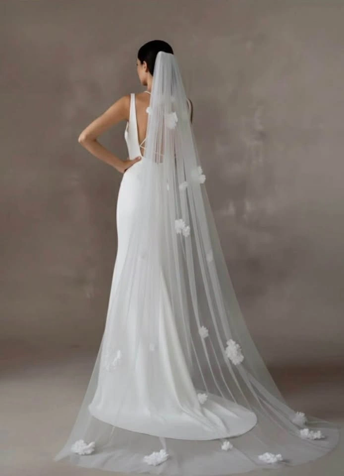 New and flawless. Chiffon flowers sewn on. Extra flowers laid on dress in first photo are no part of it. Off/soft white available, 200cm with comb sewn in. Please respect pricing.