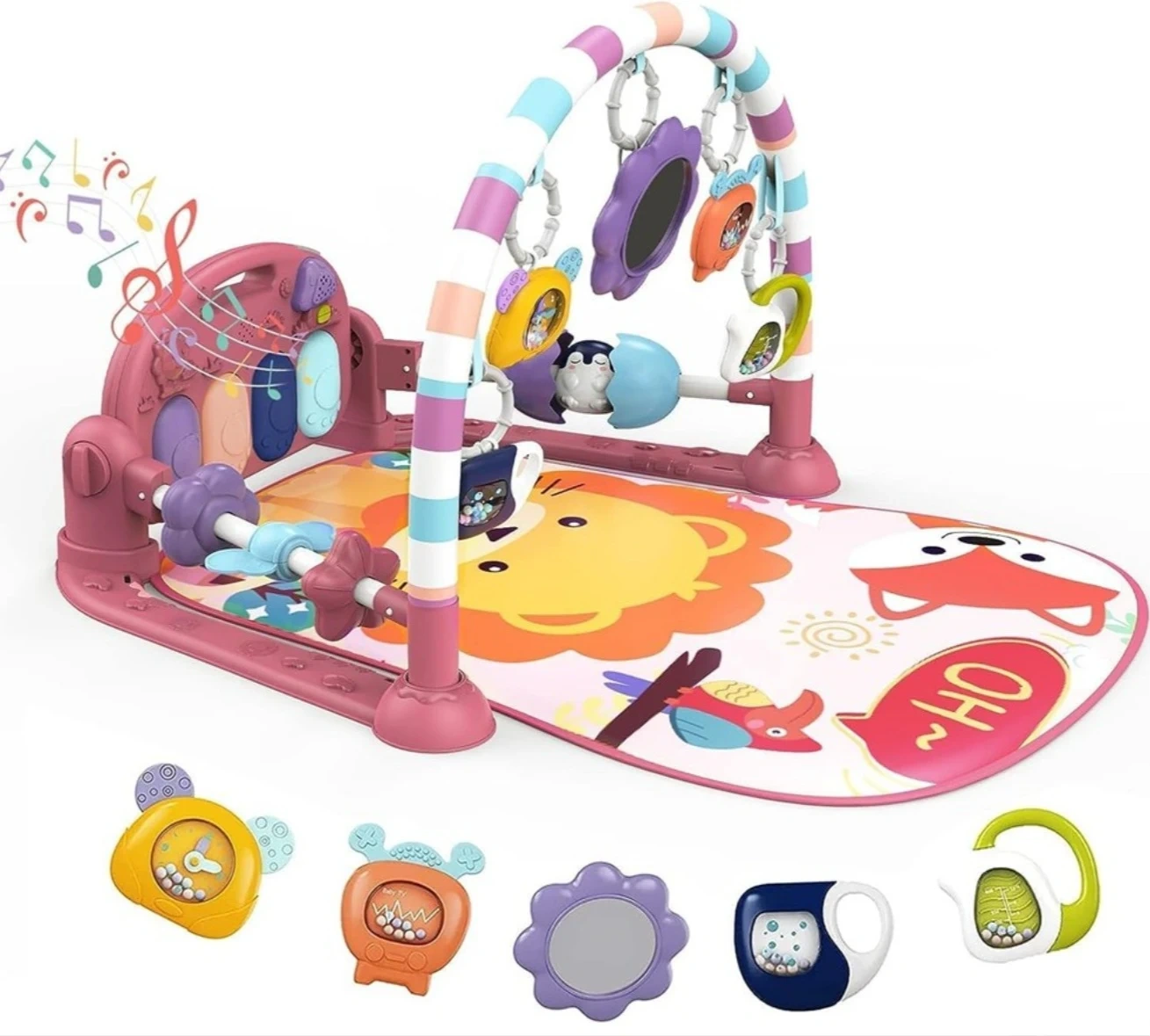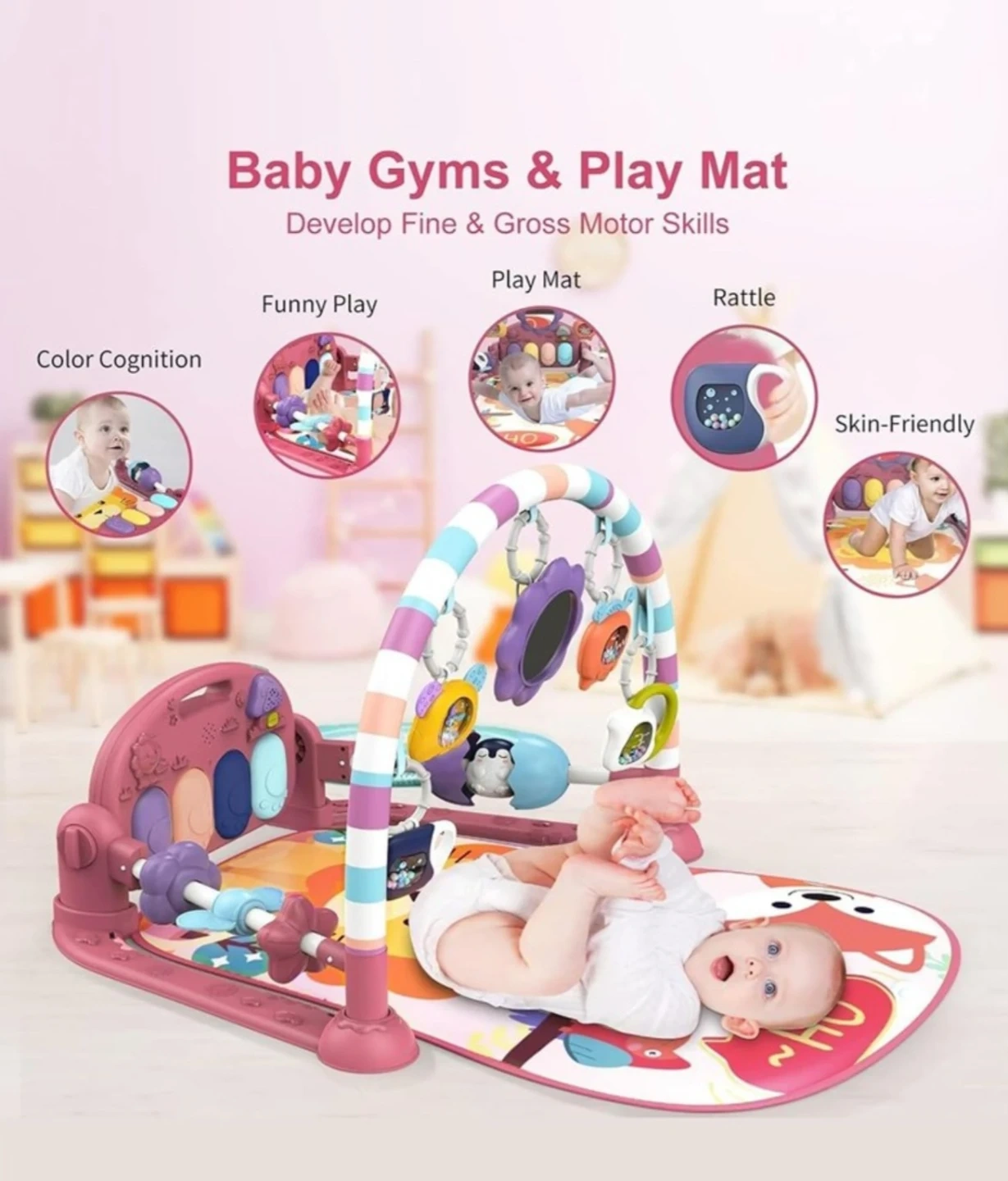 This baby gym and play mat is designed to develop fine and gross motor skills. It features a musical piano with lights and sounds, along with several hanging toys. The mat is skin-friendly and colourful for engaging play. Suitable for babies from birth and up.
