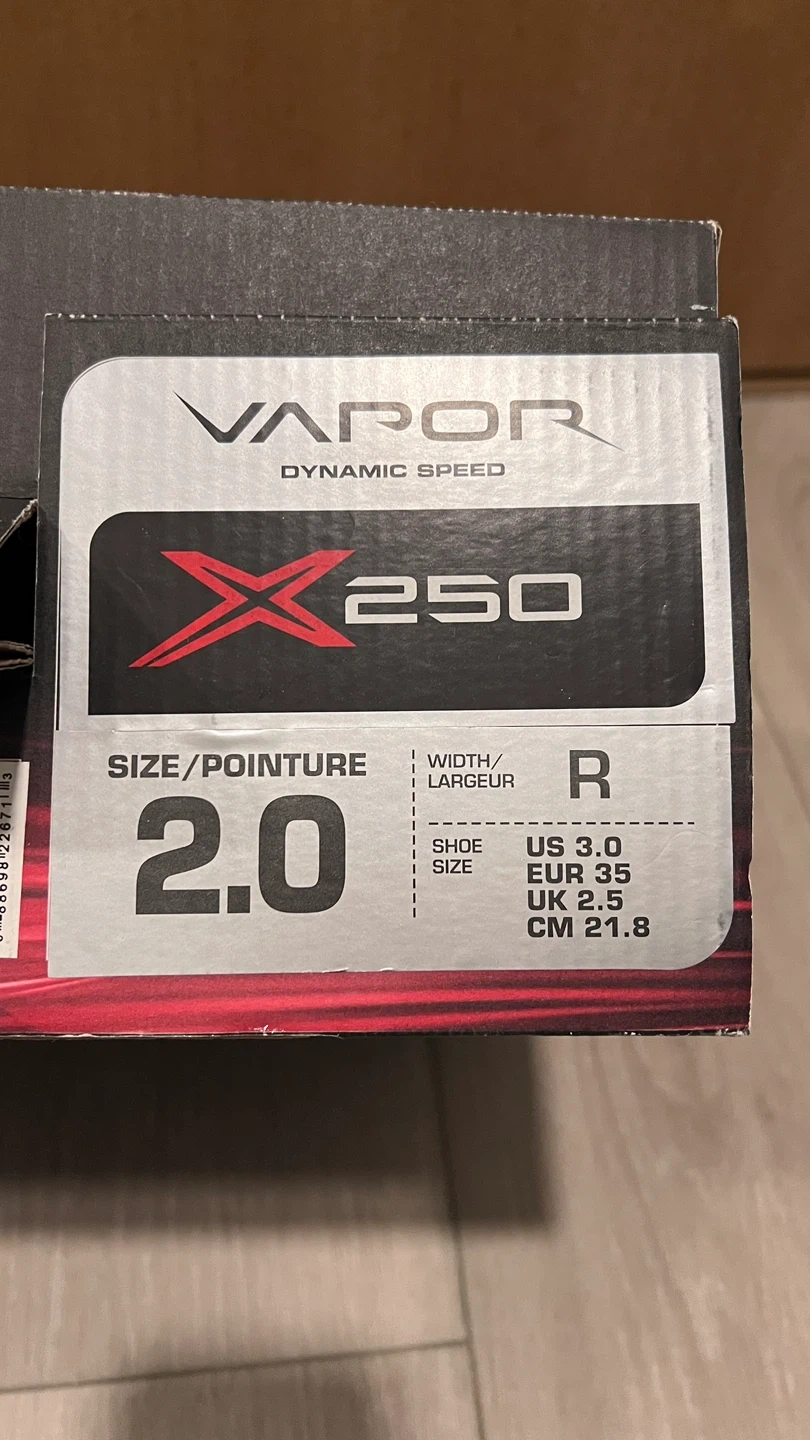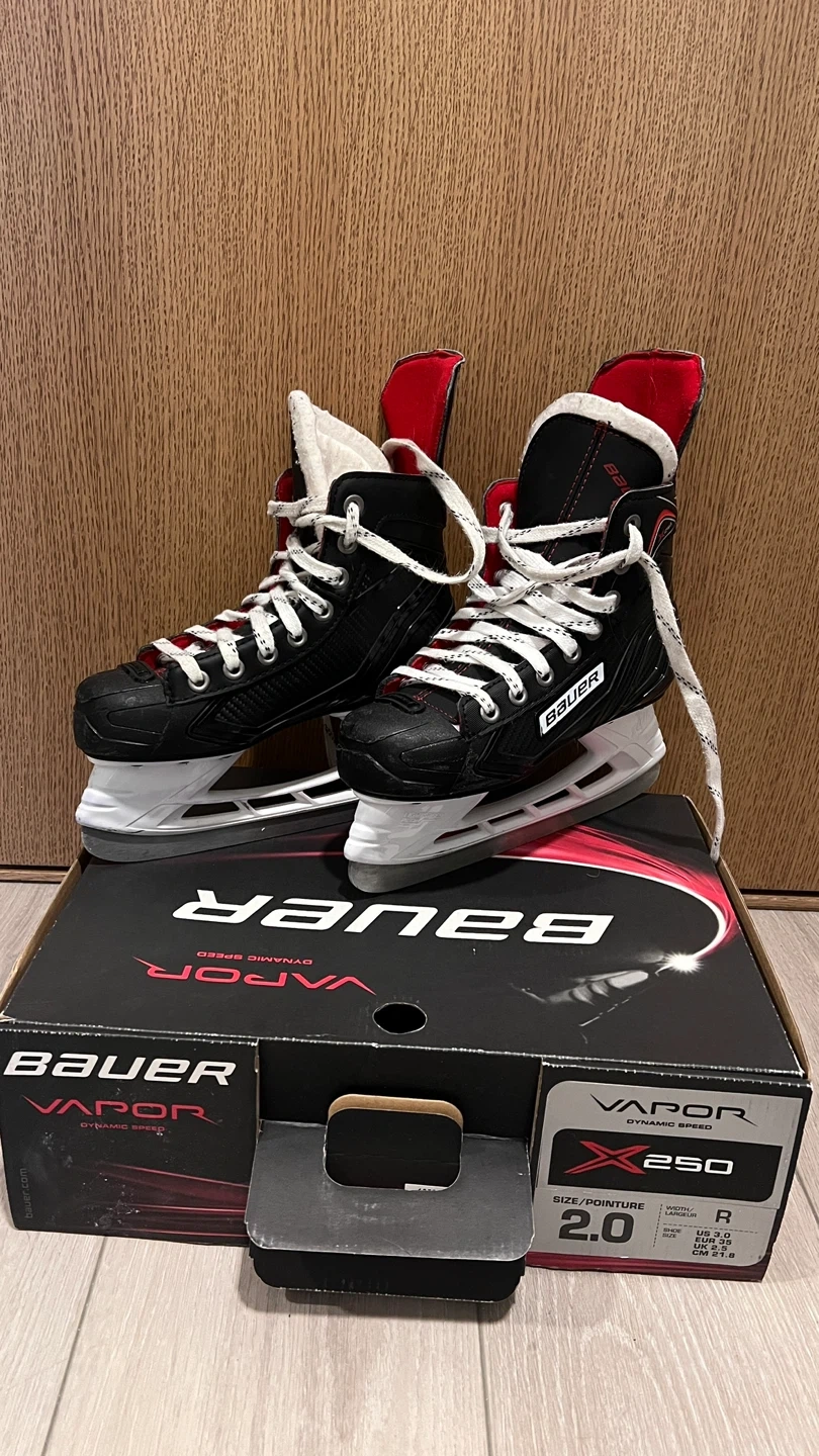 Selling a pair of Bauer Vapor X250 youth ice skates. They are size US 3.0 / EUR 35 / UK 2.5 / CM 21.8. Comes with the original box!