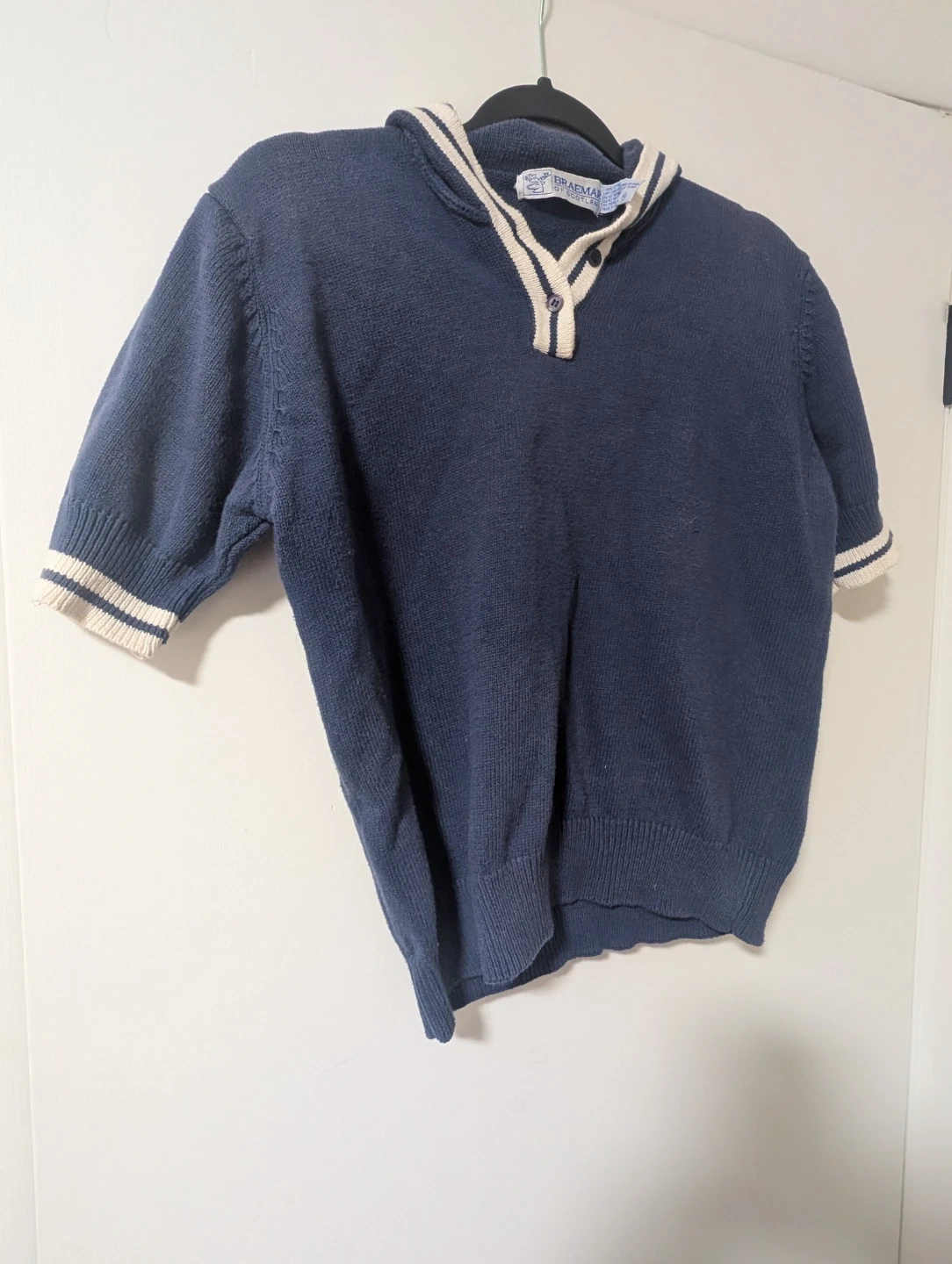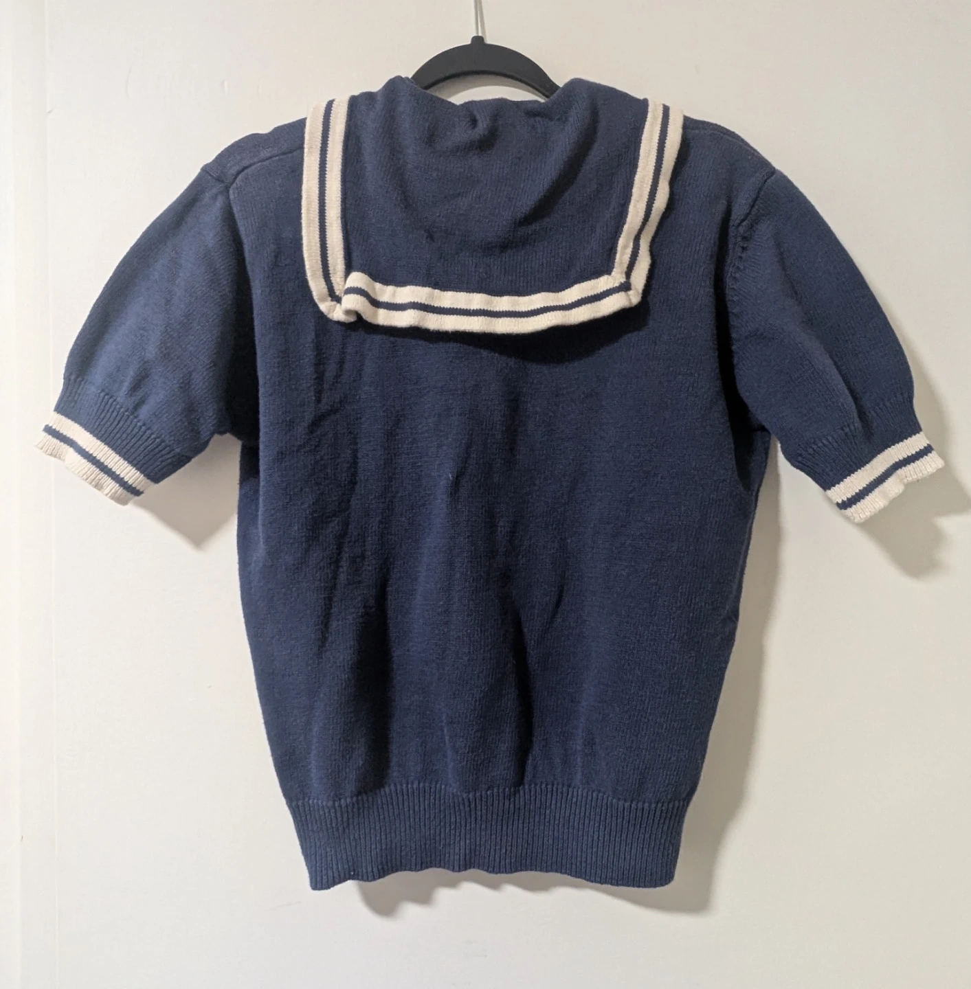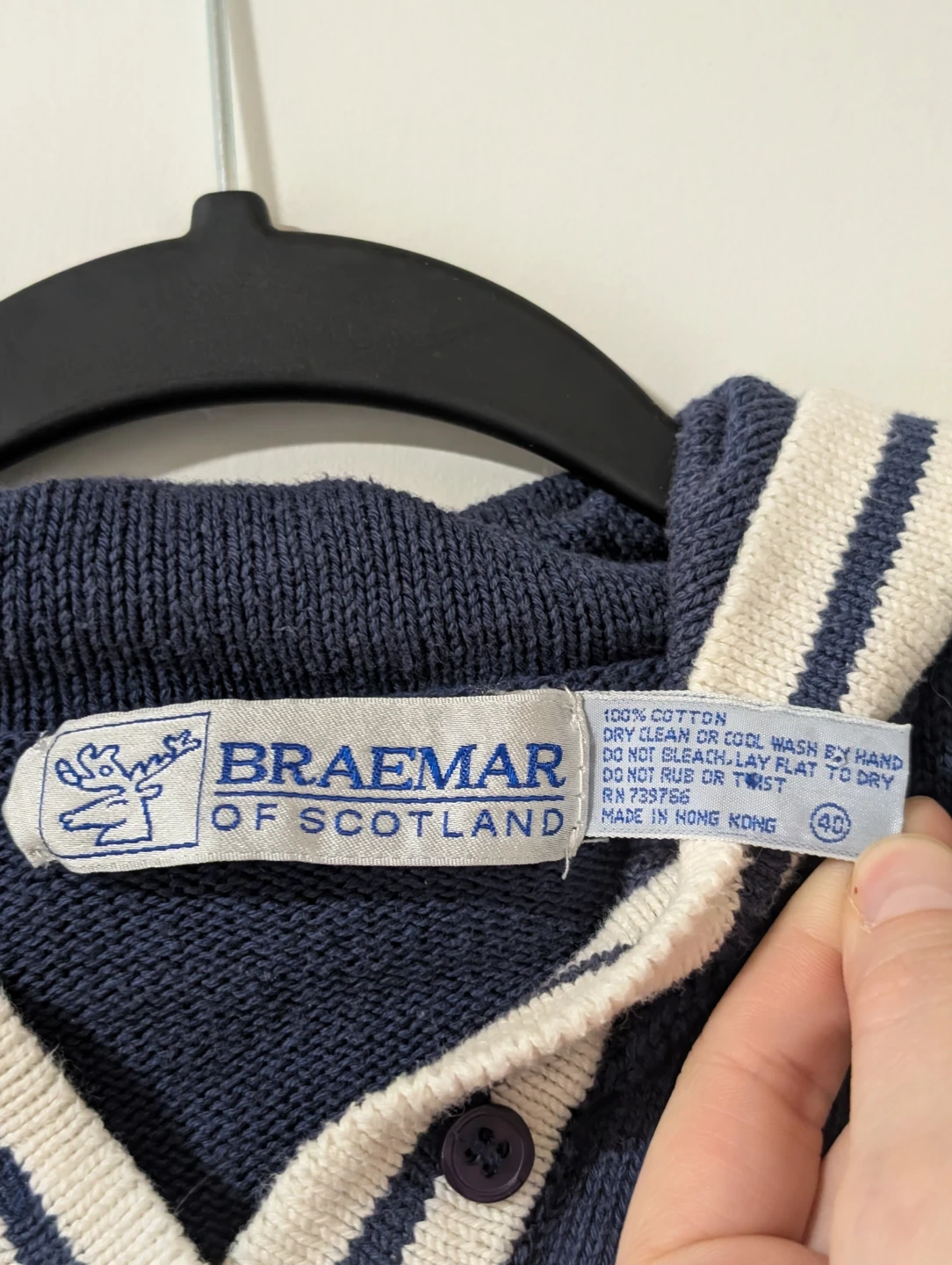 Selling a Braemar of Scotland sailor knit top! It's a beautiful navy blue colour with white detailing. The material is 100% cotton. The size is 40.