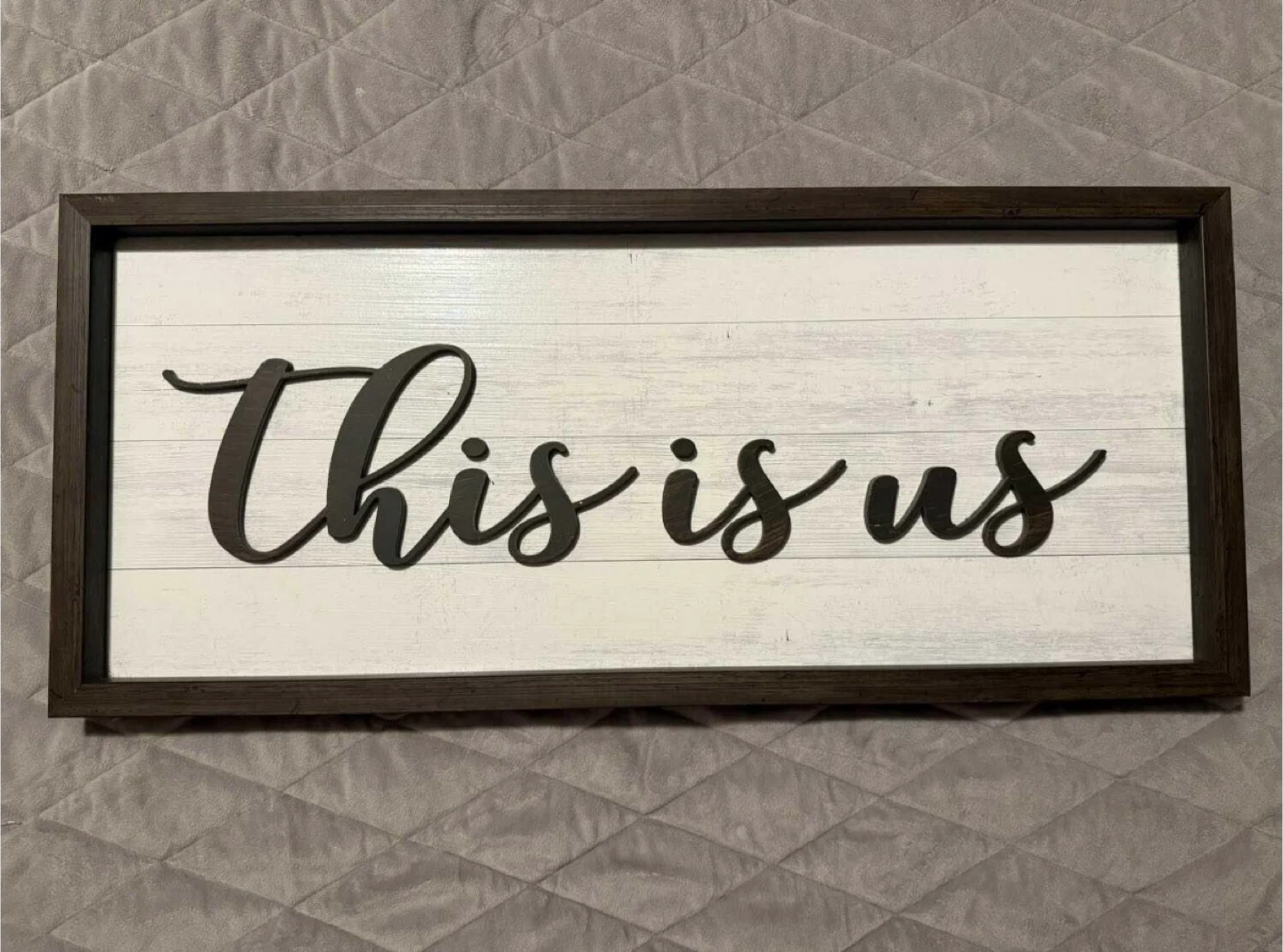 A charming wooden sign featuring the phrase 'This is Us' in a rustic, distressed white wood background with a dark wood frame. It's a lovely piece for home decor.