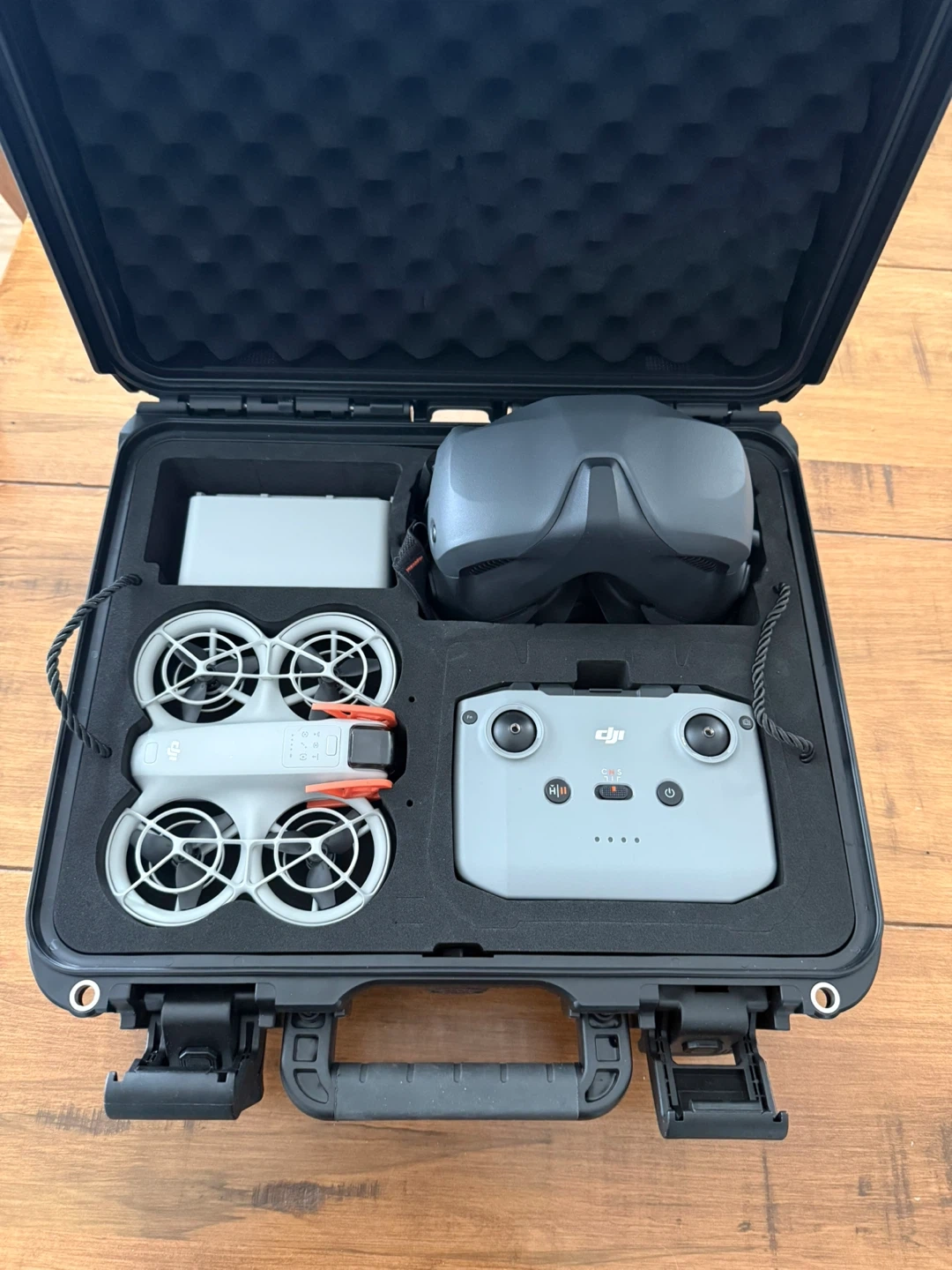 This kit includes the DJI NEO drone, goggles, and an extra controller. It also comes with batteries and charging cables, all stored in a protective hardshell case. This setup is great for immersive FPV flying experiences!