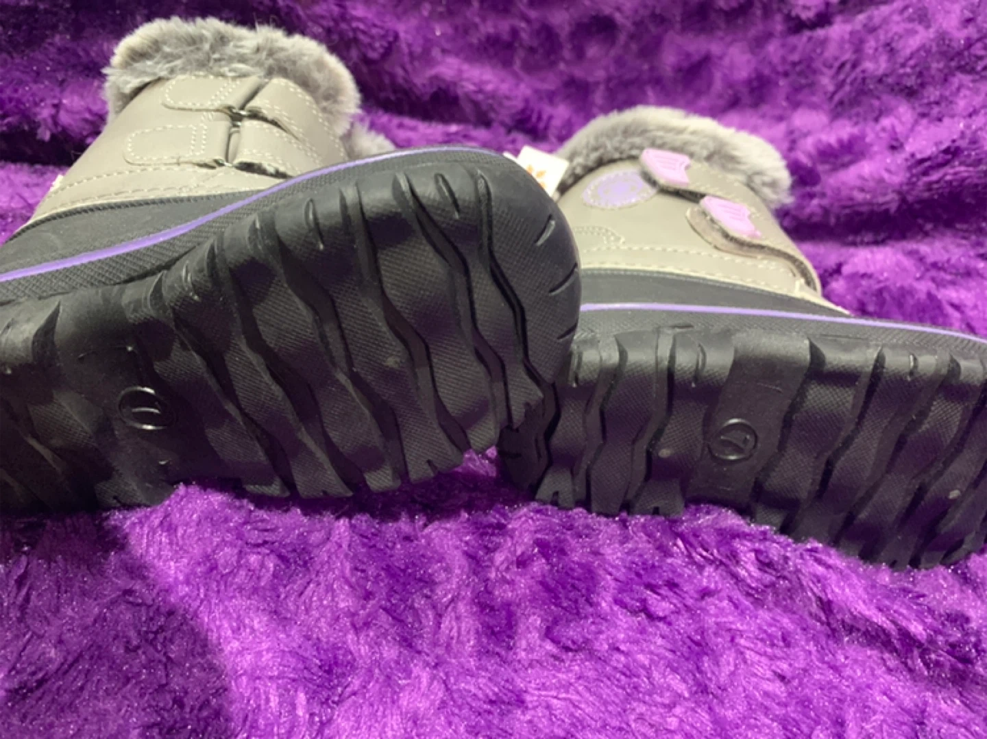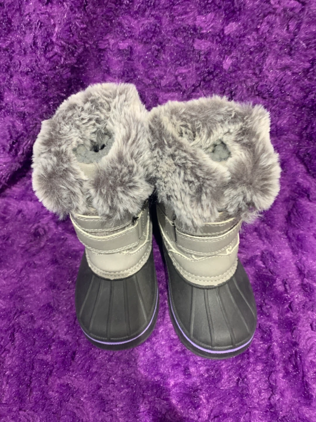 These grey and black snow boots are designed for kids. They're waterproof and insulated, with a cozy faux fur lining. These boots would be useful for keeping little feet warm and dry during winter activities.