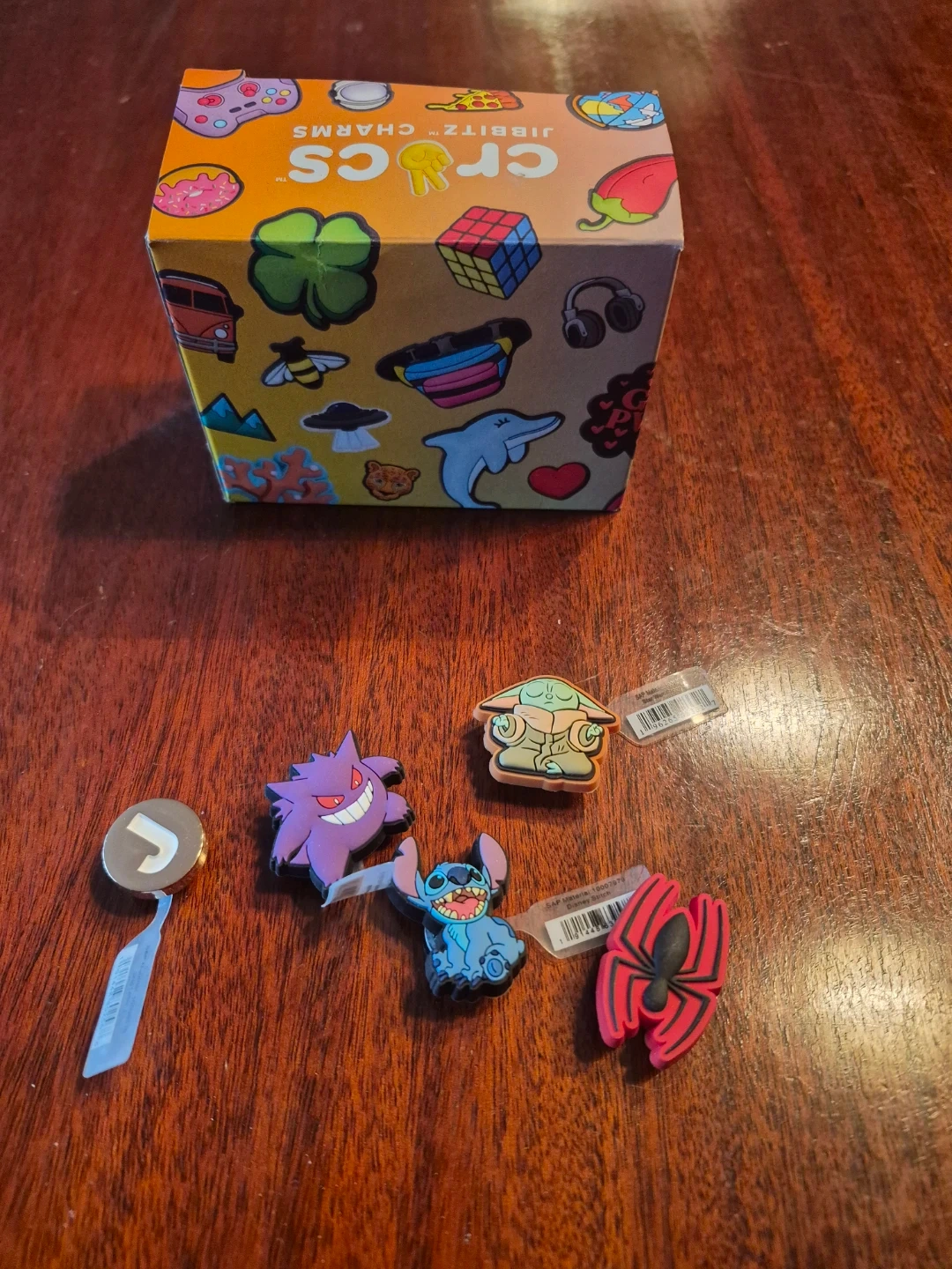 This is a set of Crocs Jibbitz Charms featuring popular characters like Stitch, Spiderman, Gengar, and Baby Yoda. The set also includes a "J" charm and comes with the original Crocs Jibbitz Charms box. They're made of rubber and easily attach to your Crocs shoes.