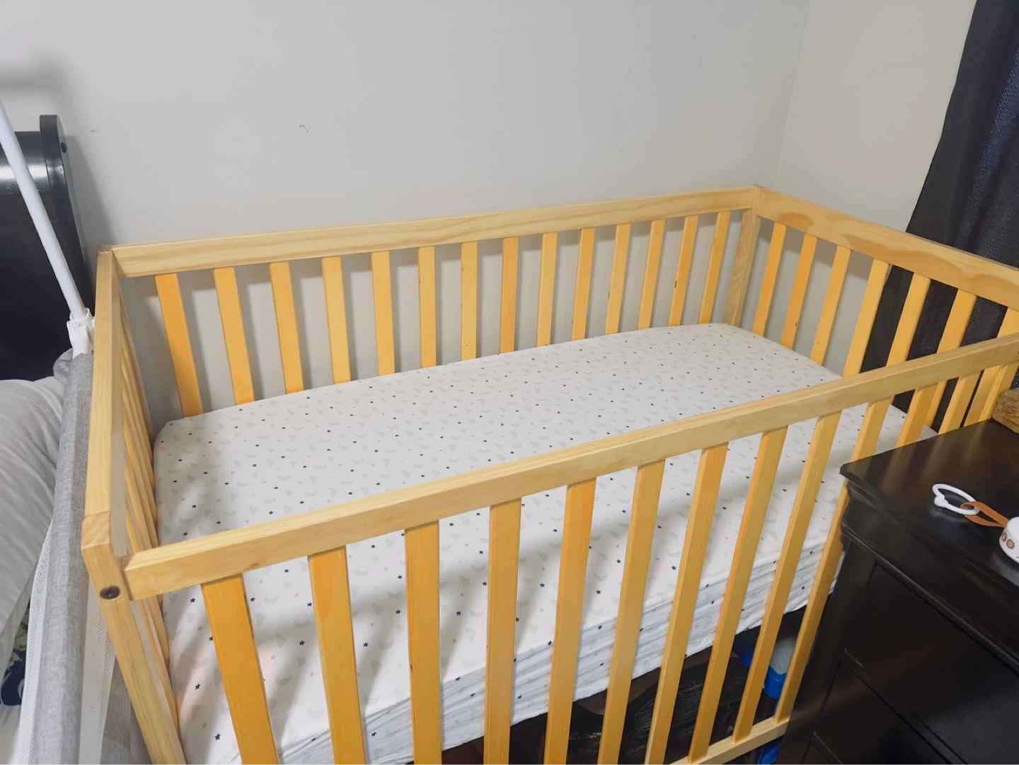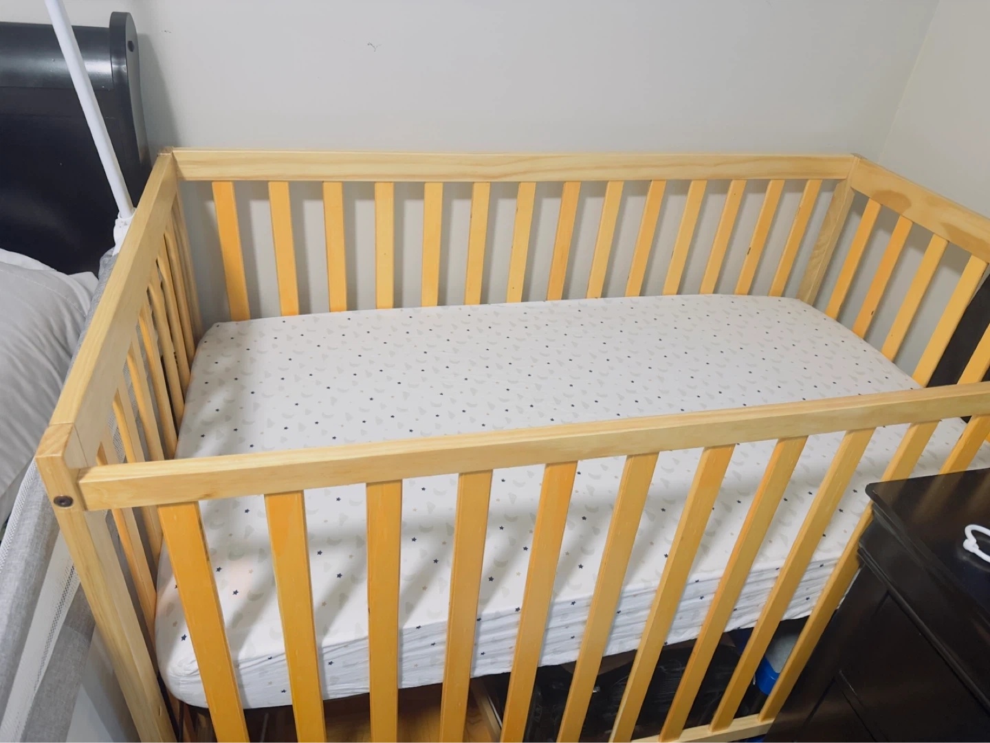 Solid wood crib with a fitted sheet and mattress. Converts to a daybed or toddler bed. Sturdy and eco-friendly design.
