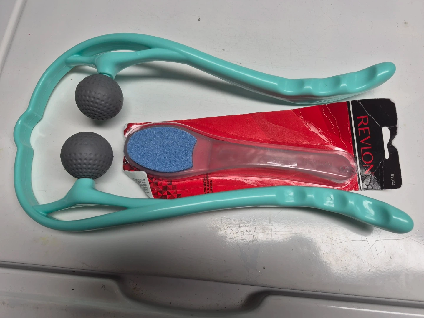 This set includes a Revlon foot file with a blue scrubbing surface. Also comes with a teal-coloured plastic massage tool with two grey textured rollers. Perfect for at-home foot care and relaxation!