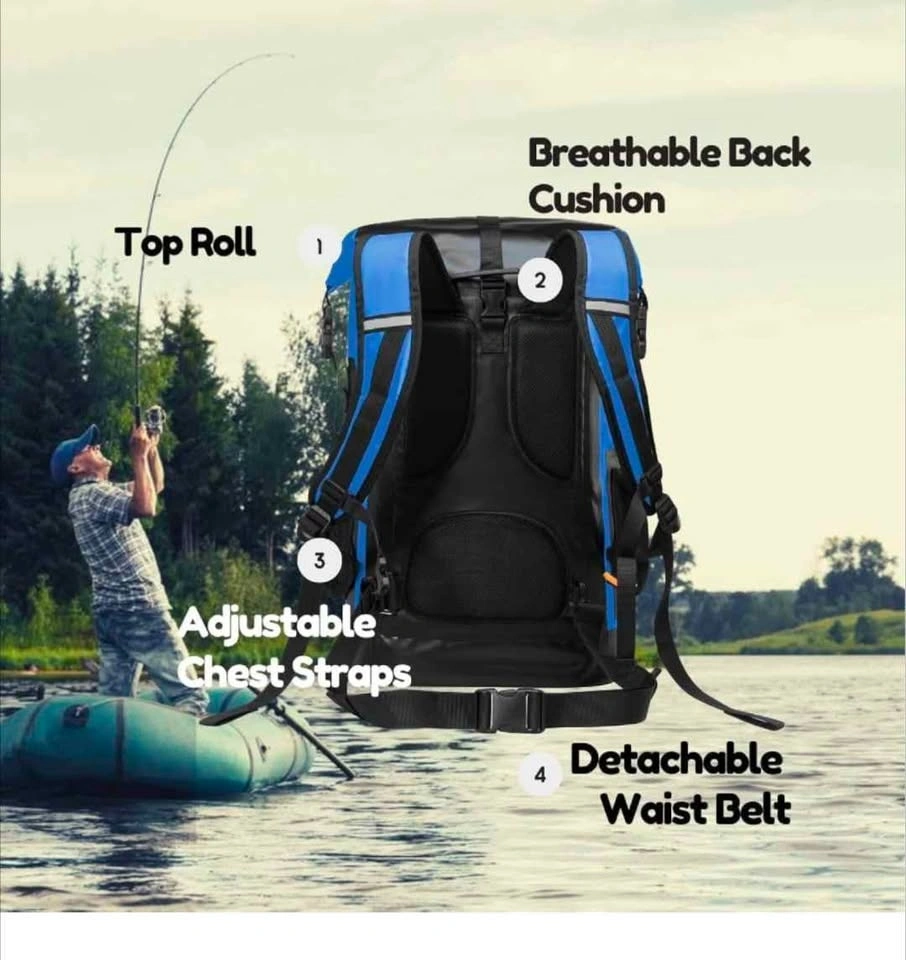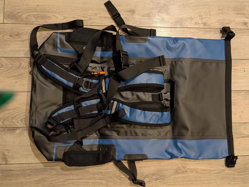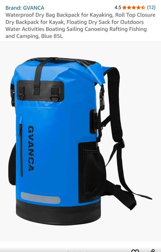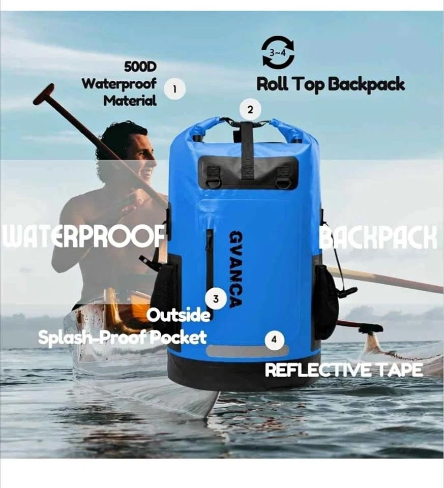 GVANCA blue waterproof dry bag backpack. This is a big 55L size. Has a roll top closure and is made with 500D waterproof material so your stuff stays super dry. Has a splash-proof pocket outside and reflective tape too. Back has a breathable cushion, adjustable chest straps, and a detachable waist belt for comfort. Perfect for kayaking, boating, fishing, camping, or any water activities.