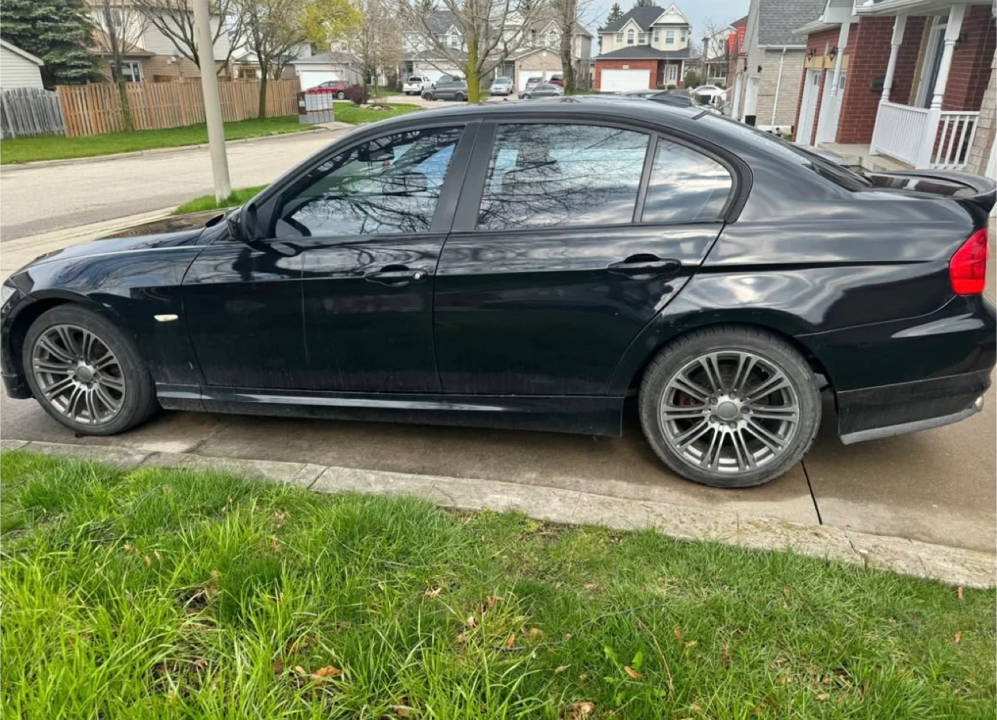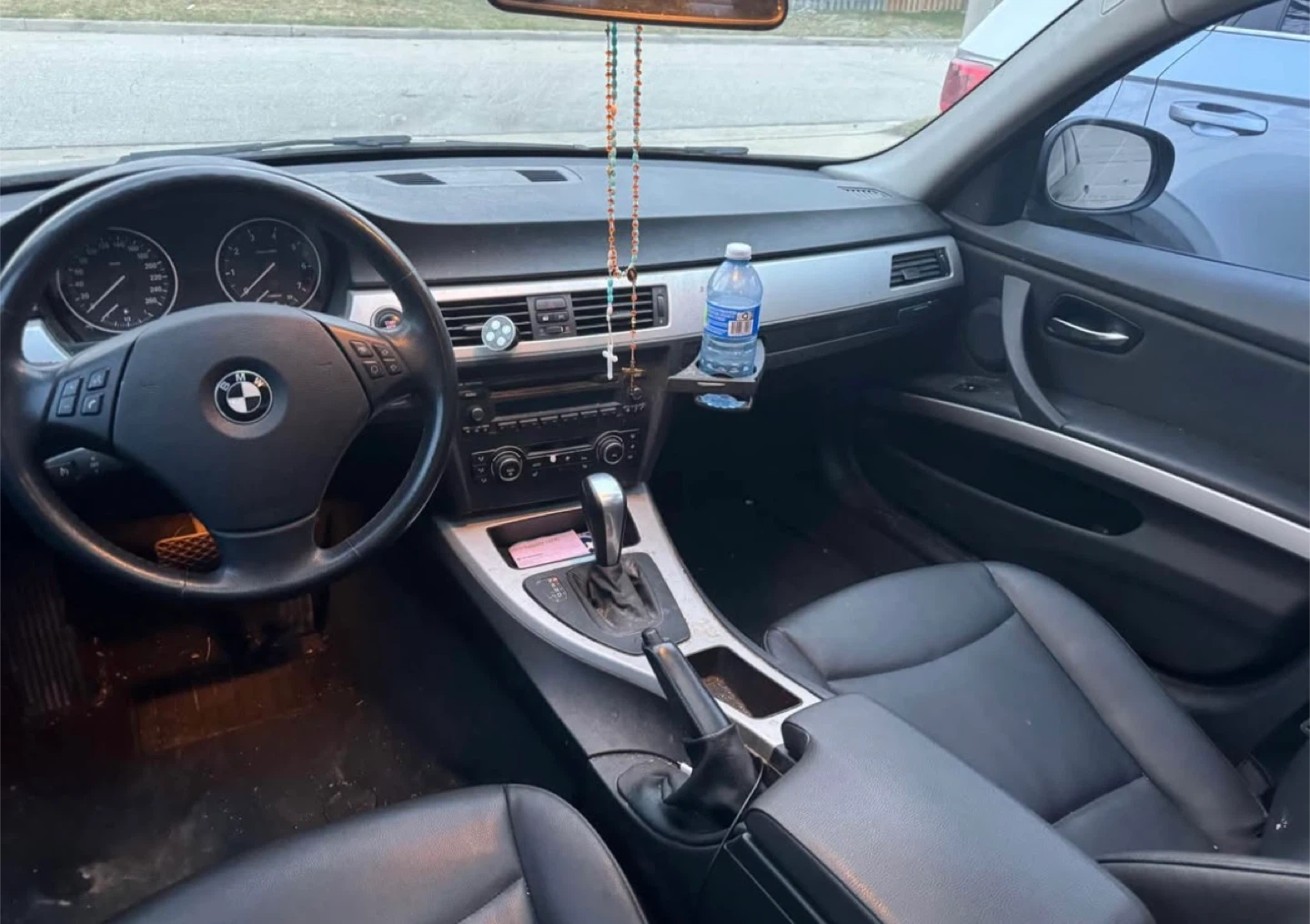 This is a black BMW 3 Series sedan. It's a four-door vehicle with alloy wheels. The interior features black leather seats and a modern dashboard.