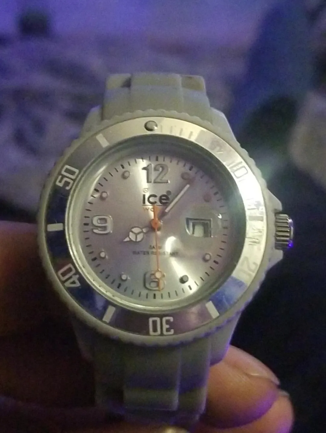 This is an ICE watch with a silver dial and a grey silicone band. It's water resistant up to 10 ATM. This watch is suitable for everyday wear or outdoor activities.