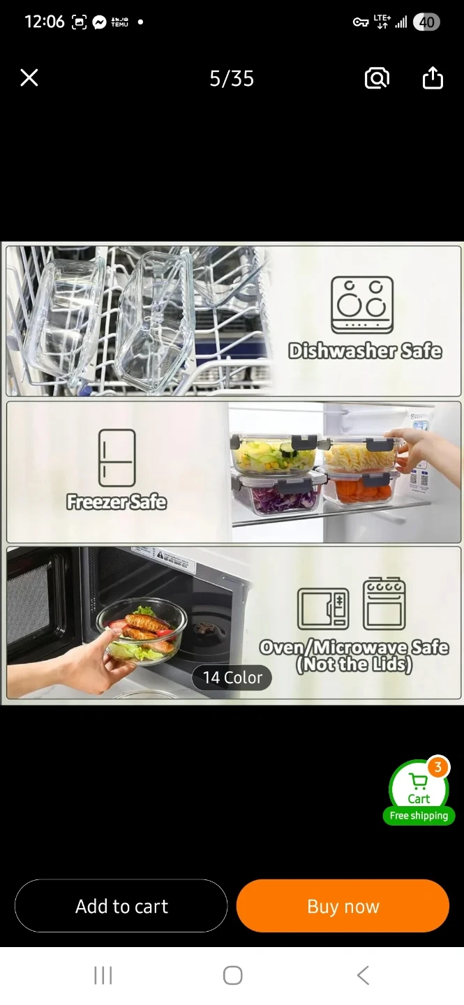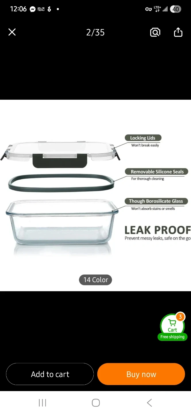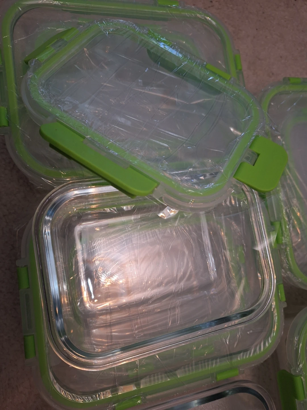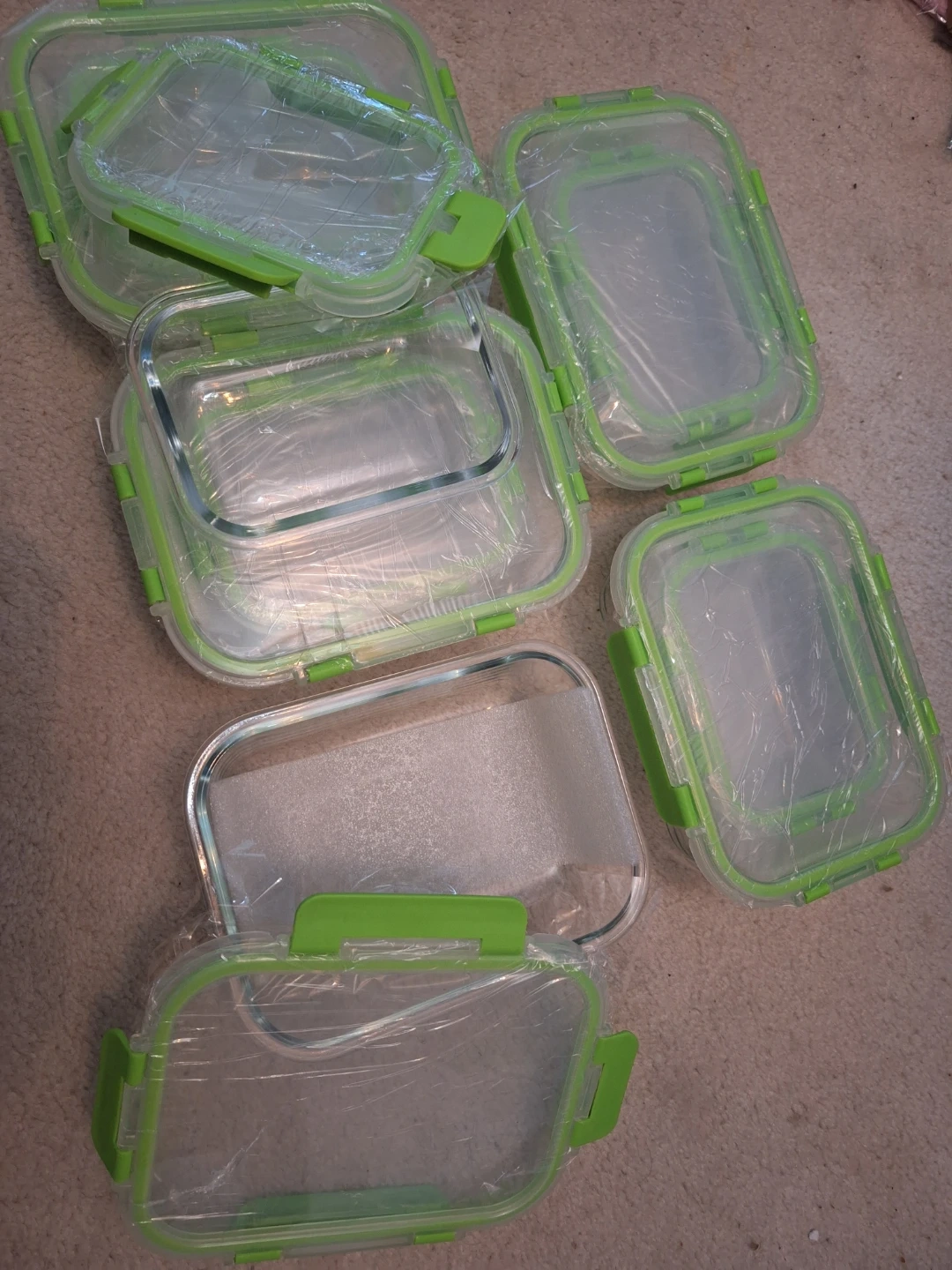 Set of glass food storage containers with green locking lids. These containers are made from durable borosilicate glass. They're dishwasher, freezer, and oven safe (not the lids). They offer a leak-proof seal for convenient food transport.
