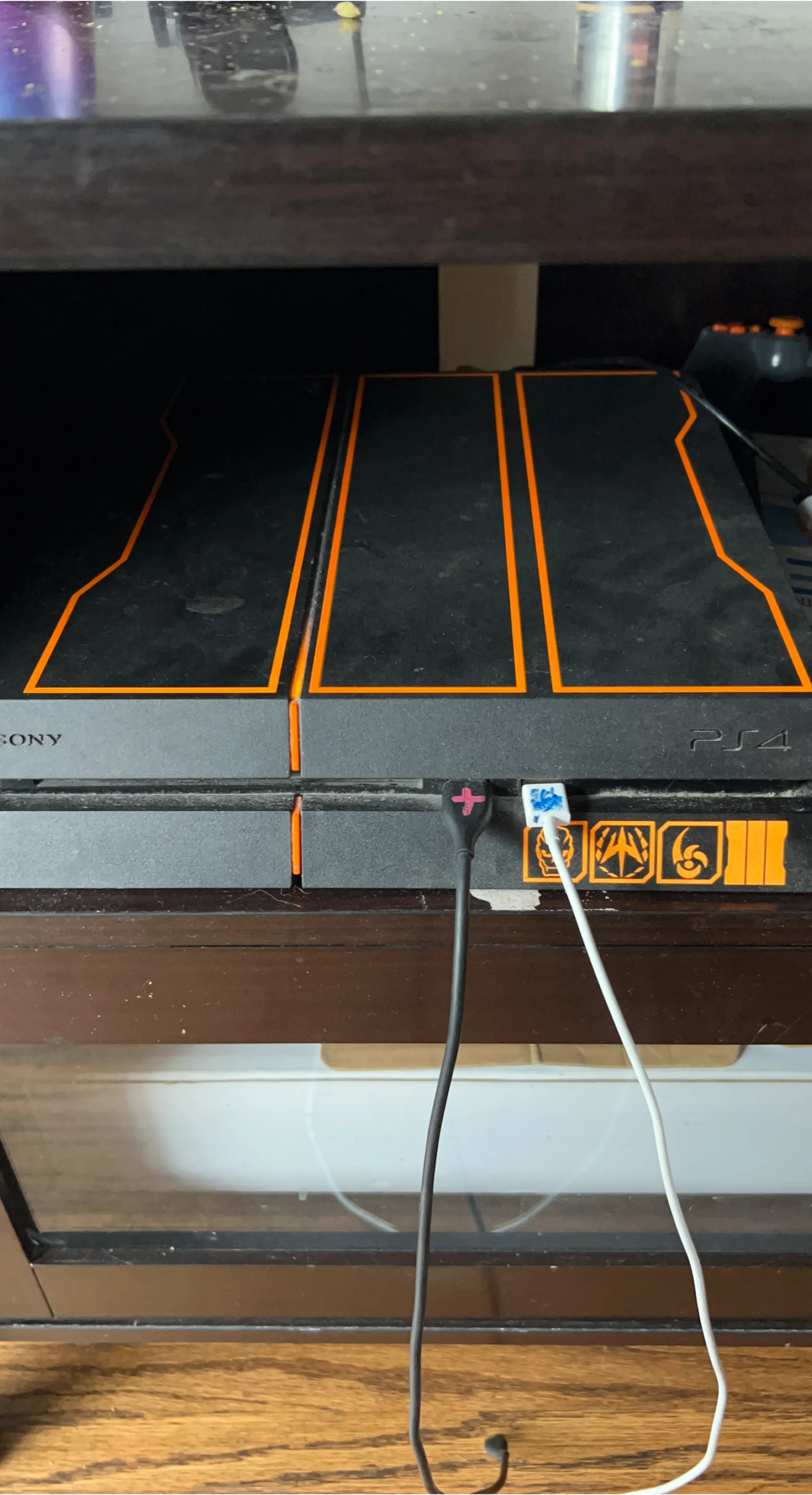 Selling a black Sony PlayStation 4 console with orange accents. It's a standard PS4 model. Power cables are included. Great for gaming! Good condition comes with 1-2 controllers and a few games asking 225$obo