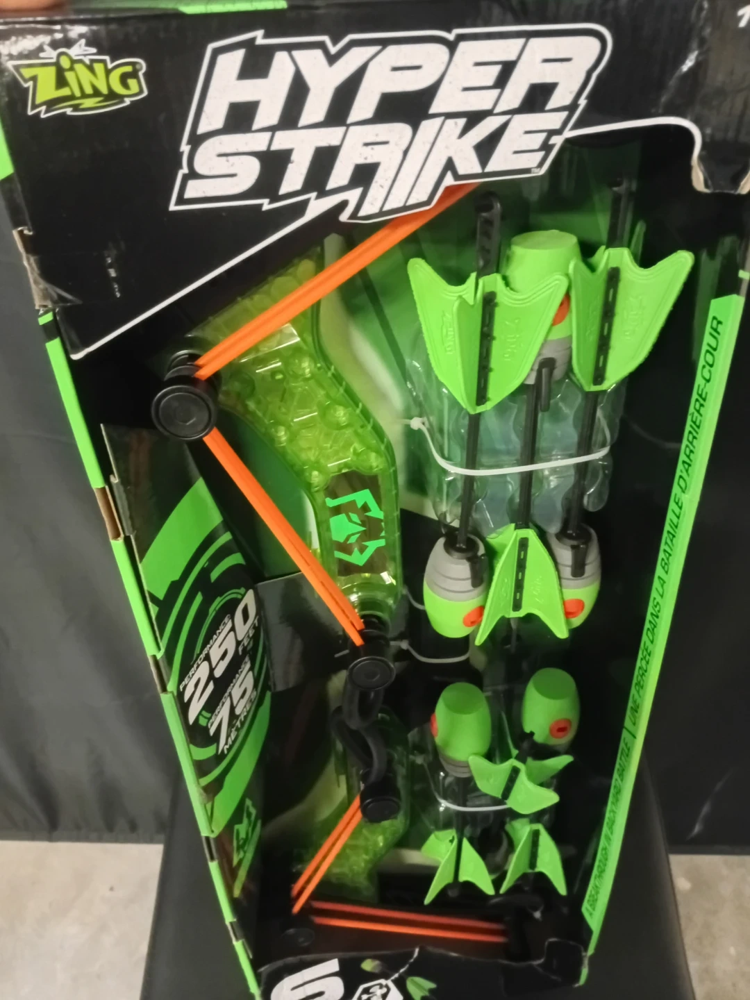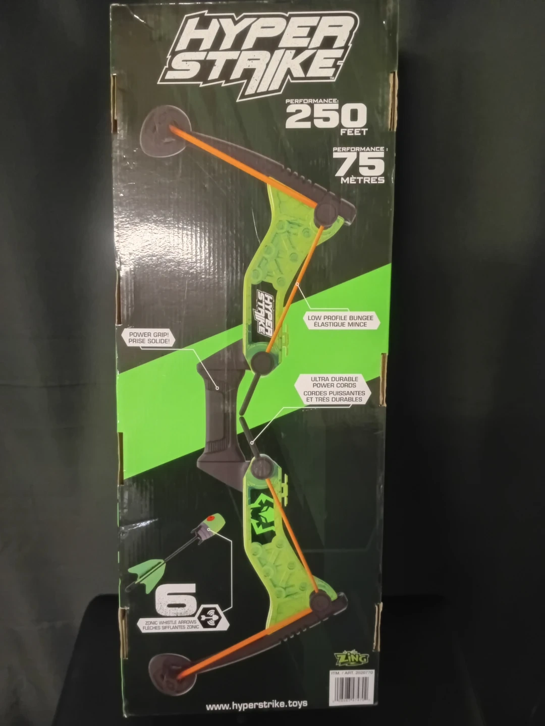 This Zing Hyper Strike bow has a low profile bungee and ultra durable power cords. It's designed for performance up to 75 metres. Comes with 6 Zing arrows that whistle through the air when shot. Has never been opened or used