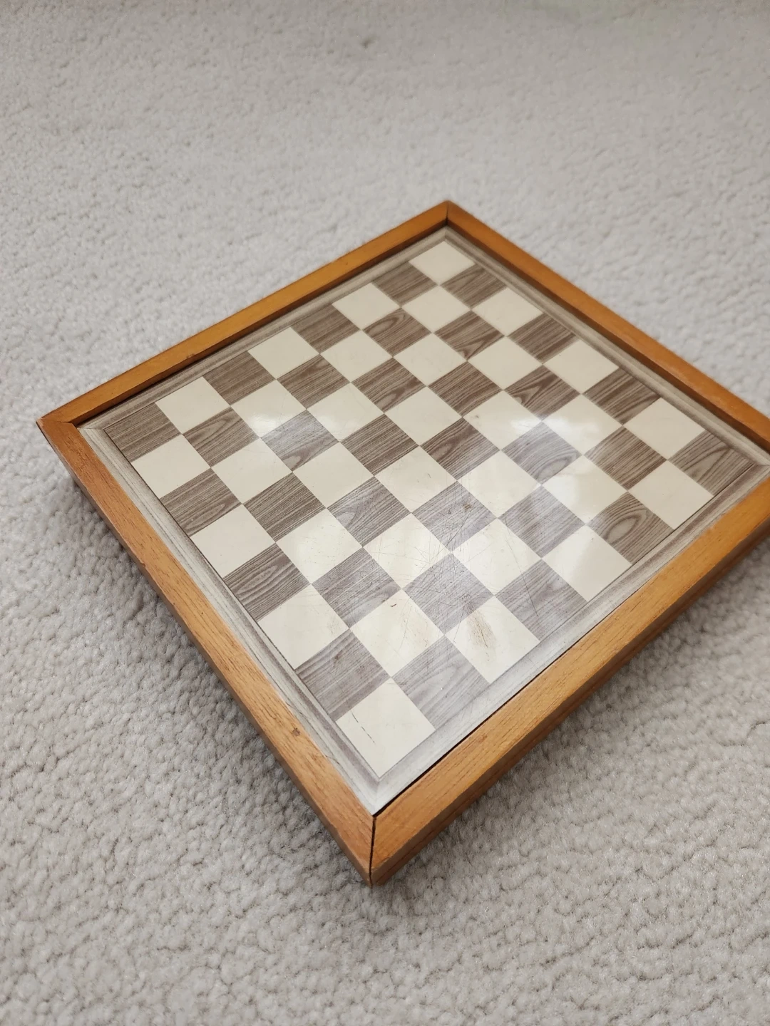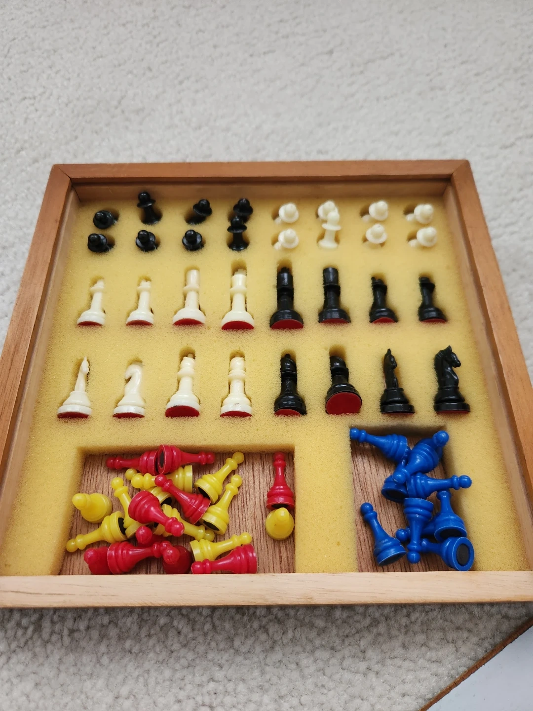 This set includes a wooden chess board and pieces in black and white. It also comes with checkers pieces in red, yellow, and blue. It's a great set for family game nights or for anyone looking for a classic board game experience!