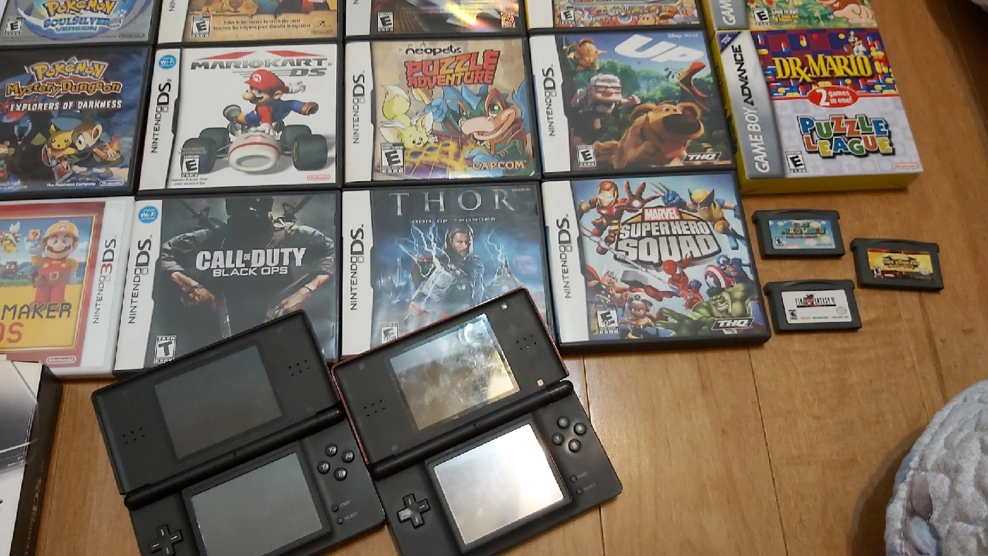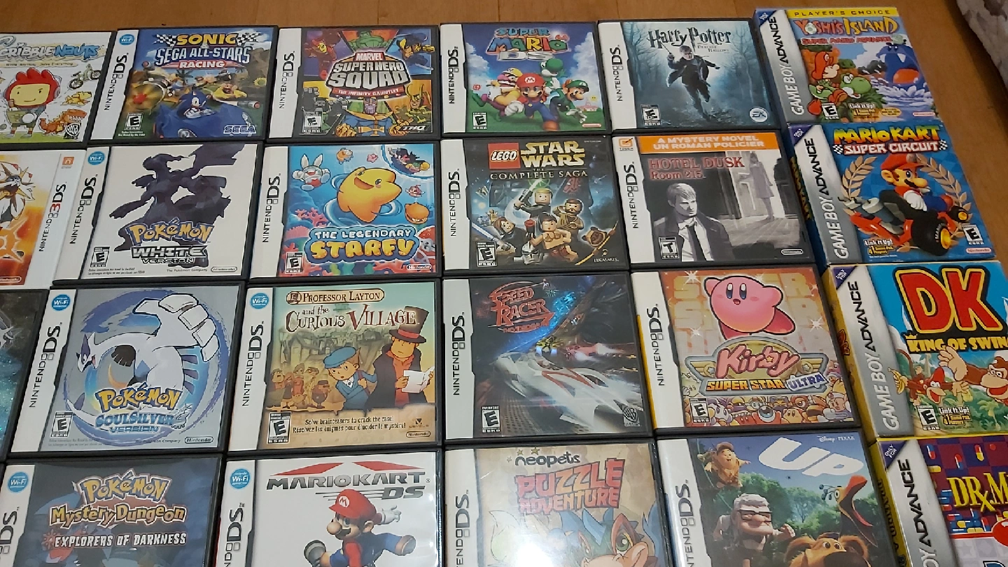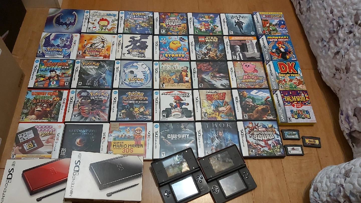 Collection of GBA 3DS and DS Games including Pokemon sun and moon with steelbook, Pokemon Platinum, Soulsilver, first print Resident Evil Revelations, Mario maker and Cross words still sealed, Donkey Kong King of Swing, Professor Layton, Hotel Dusk, Kirby, and more. All Games are CIB except for the 3 gba cartridges. Ds consoles work but hinges will not hold position. Selling the DS/3ds games and console as a lot for 1000 Selling the 7 GBA Games for $500 Buy EVERYTHING (gba, ds, 3ds) pictured for $1400 Pickup Midland and ellesmere
