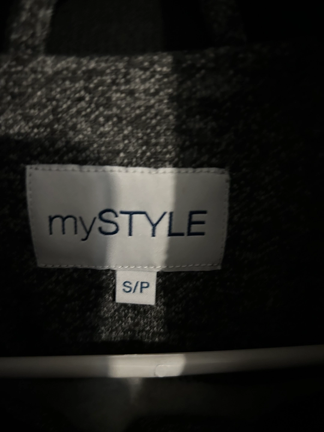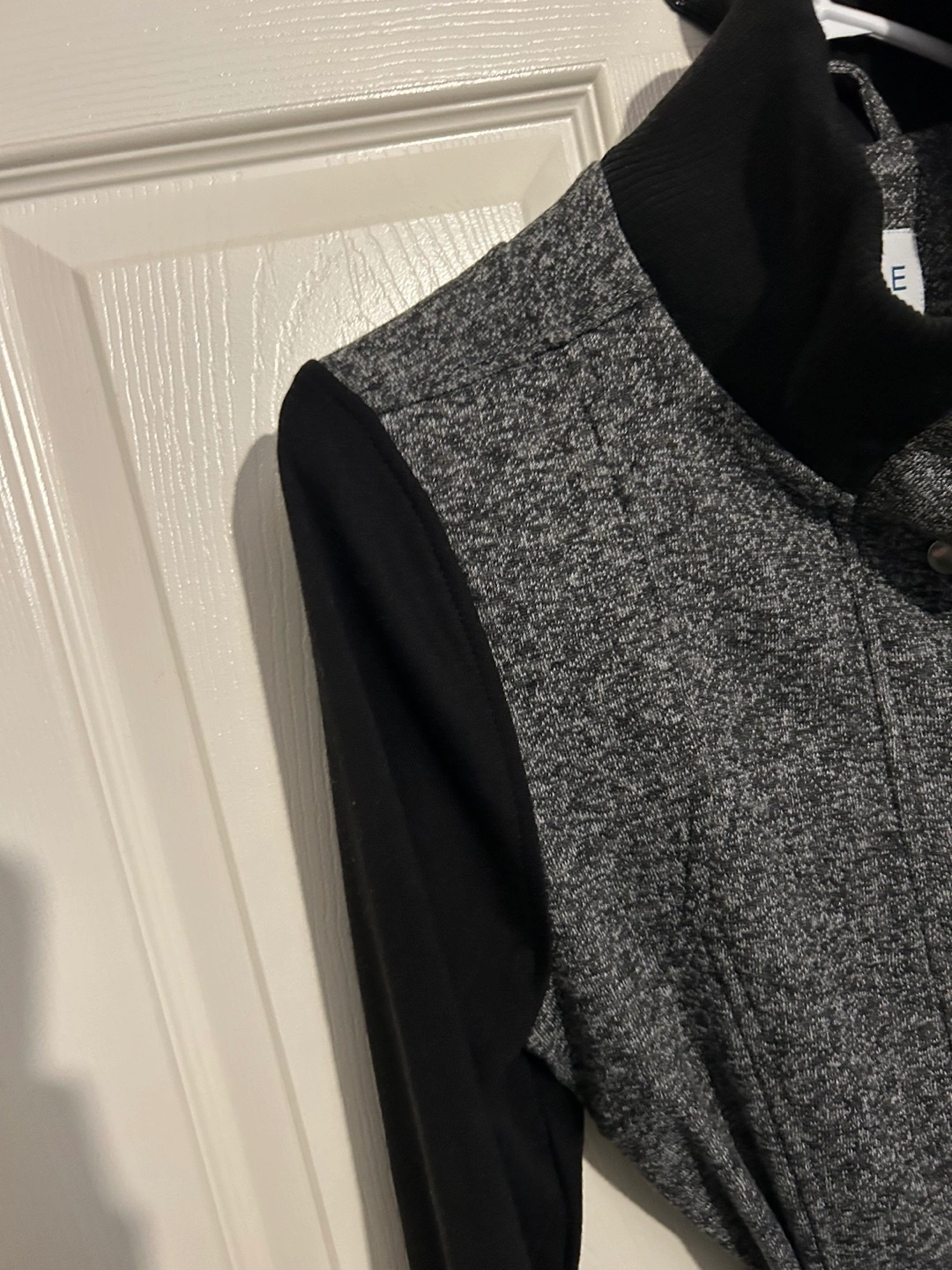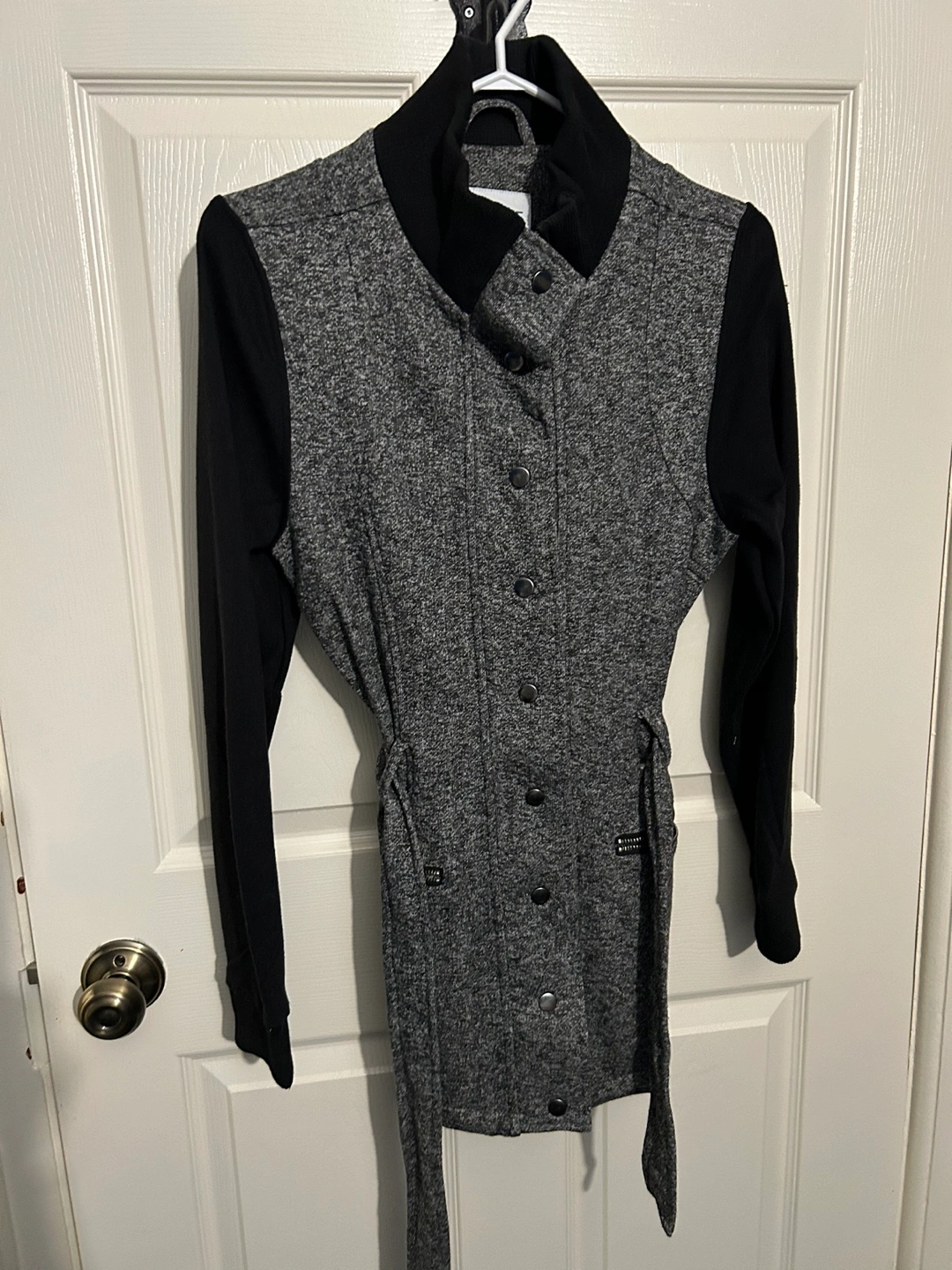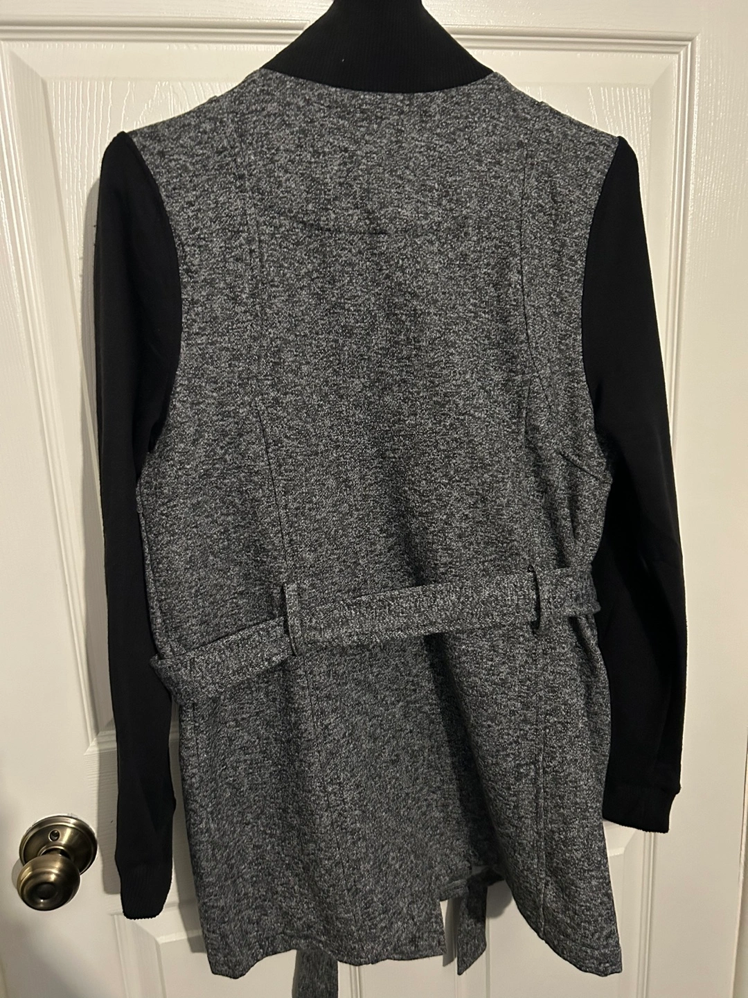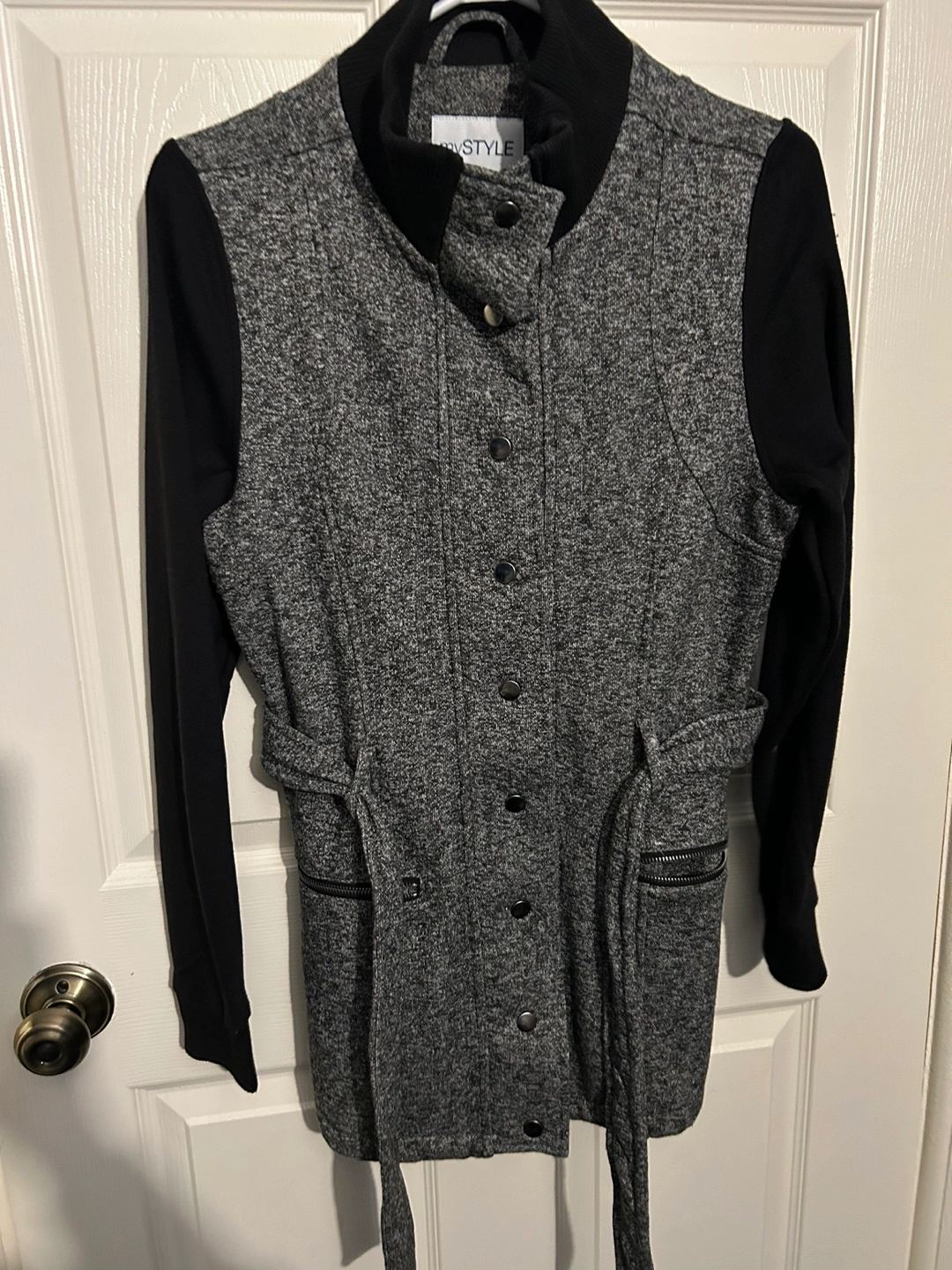 Grey and black jacket with black sleeves, zippered pocket, and button closure. Includes a belt. Brand new never worn Fuzzy inside Asking 10!