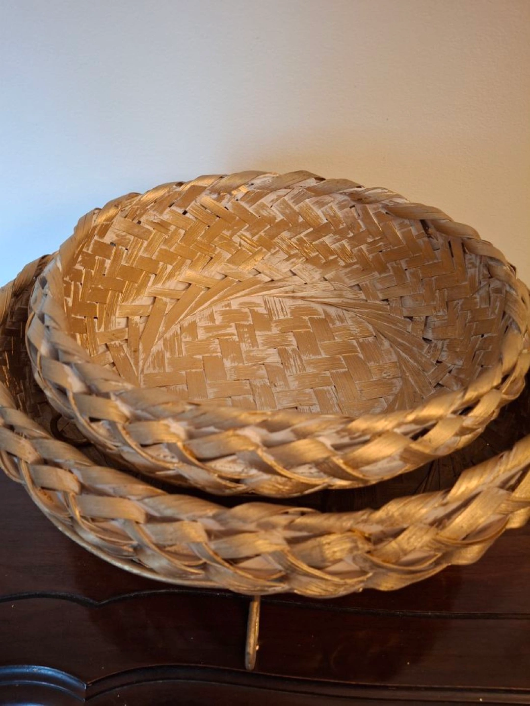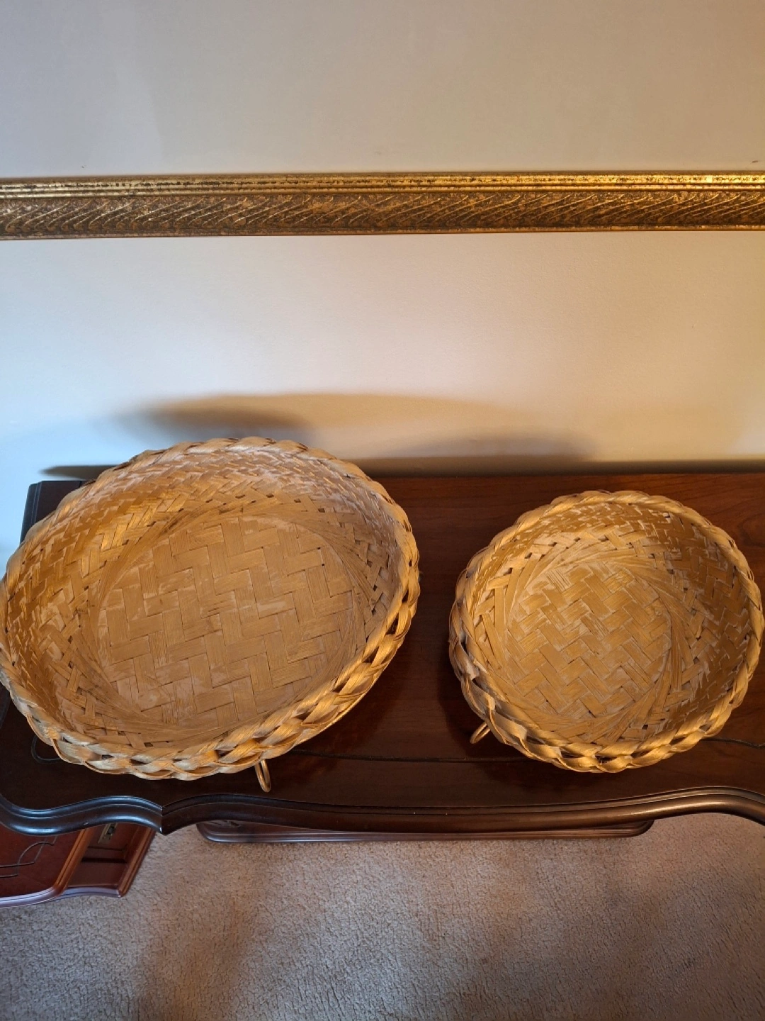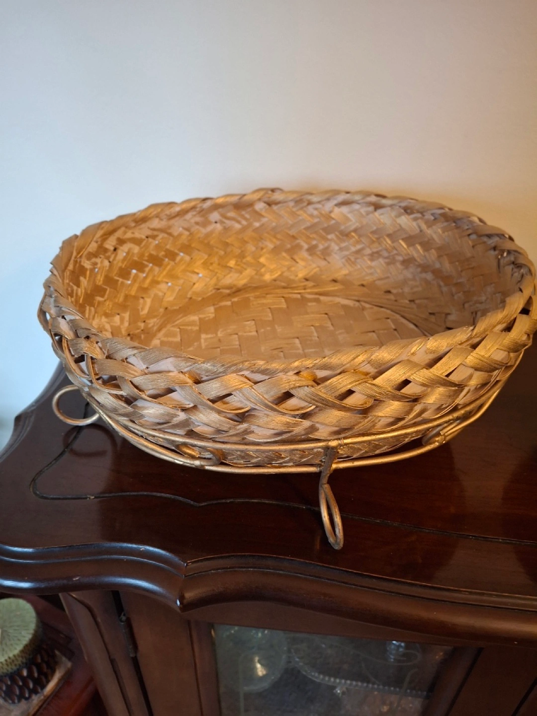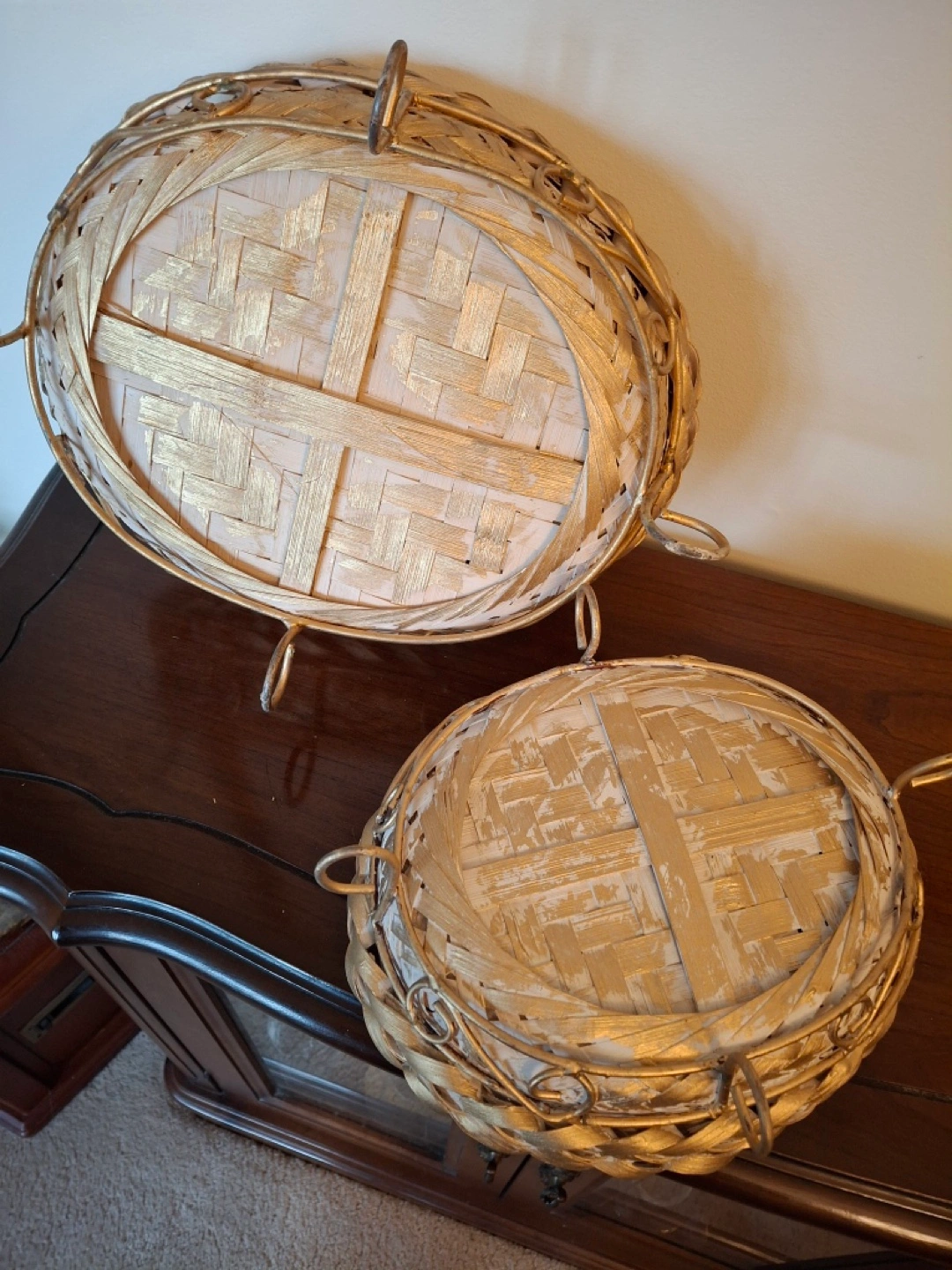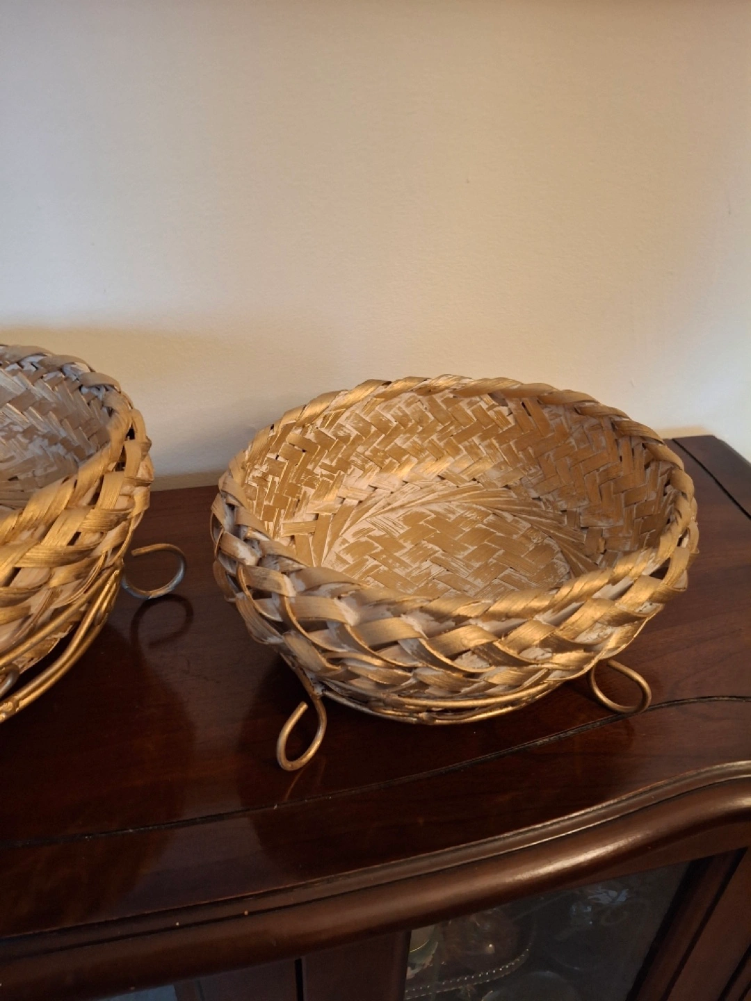Pair of 2 gold and white oval wicker baskets on 4 gold metal feet. Never been used, but metal feet show some wear. Large basket is 11.75” by 9.5” and 4.5” high. Smaller basket is 9” by 7.5” and 3.75” high. Can be used for a variety of items. Price is for both.