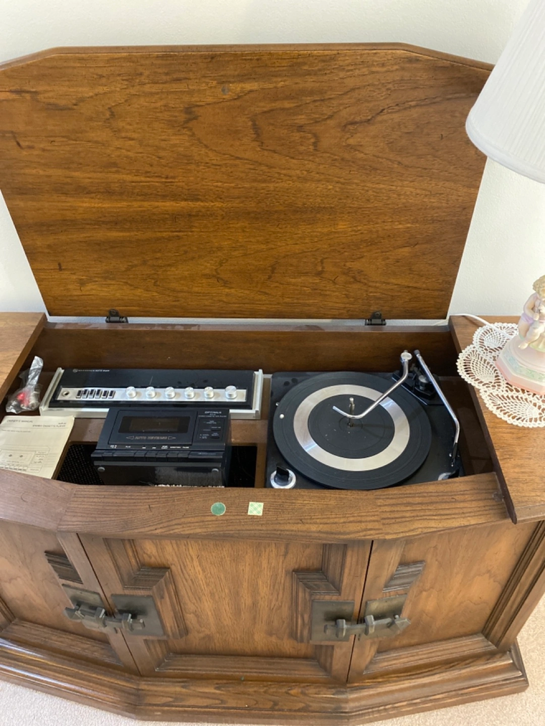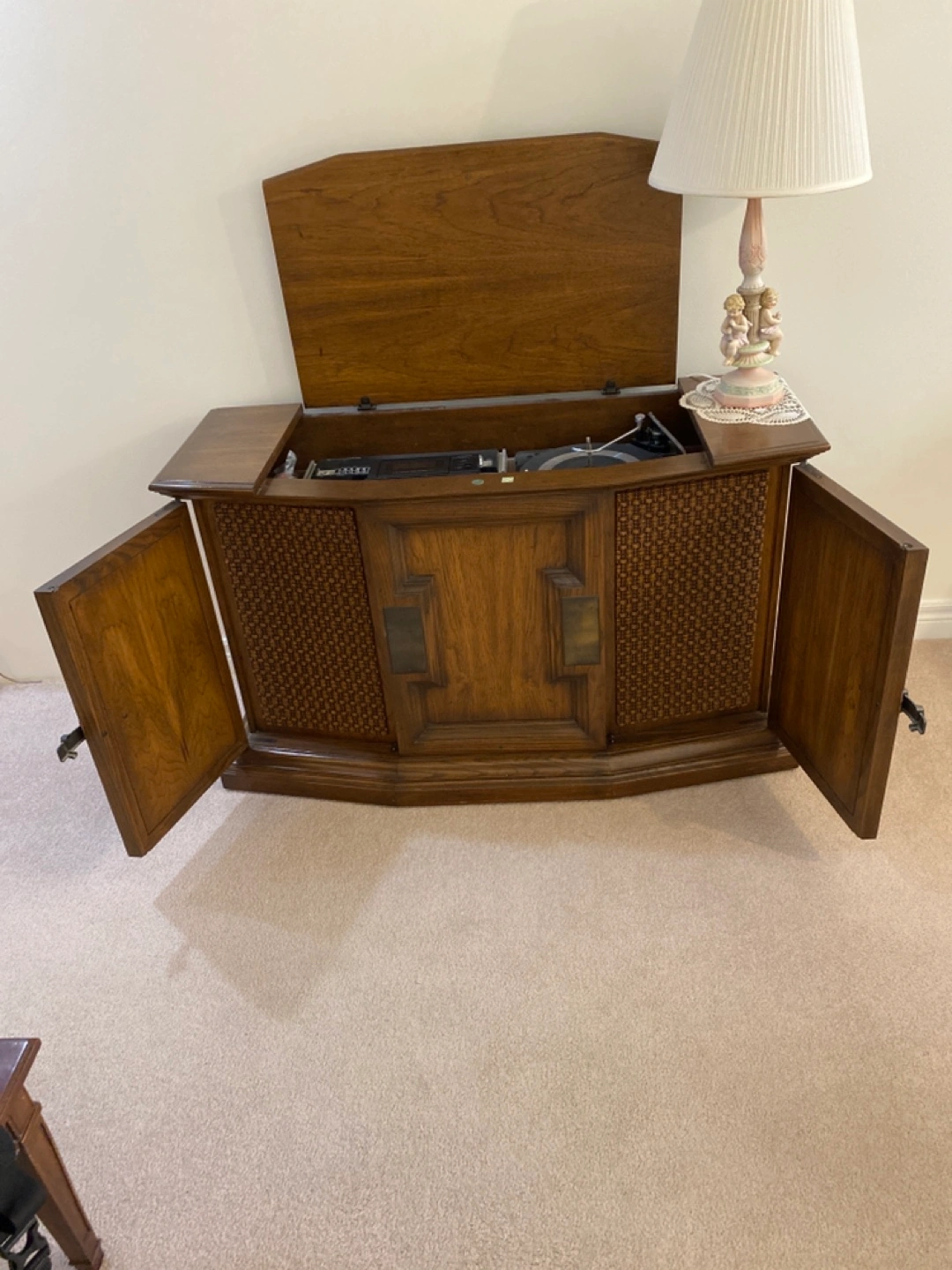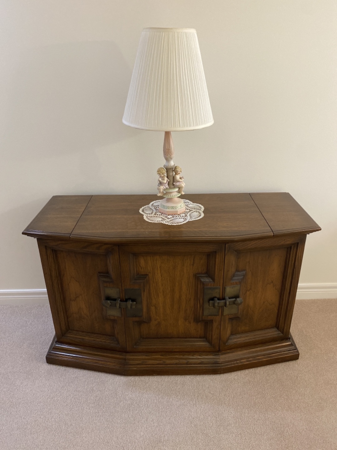 Solid oak wood, vintage piece with speakers that open up and large metal attractive hardware. Top opens up to radio, record player. cassette player. Great piece of furniture in front of a large window. Can hold a massive tv.