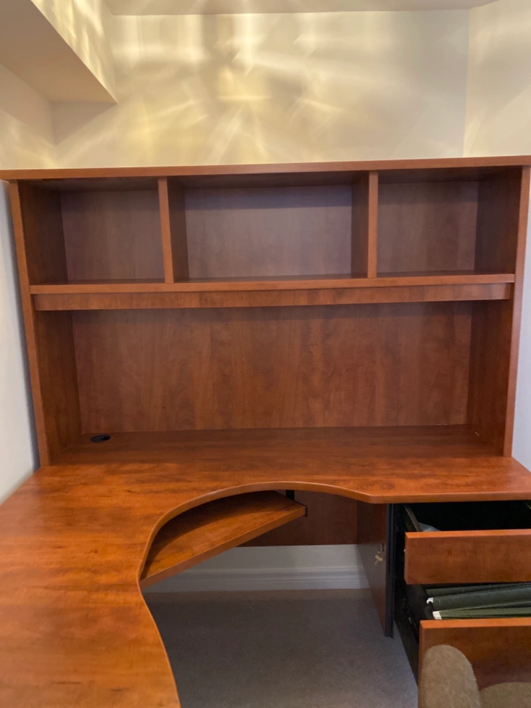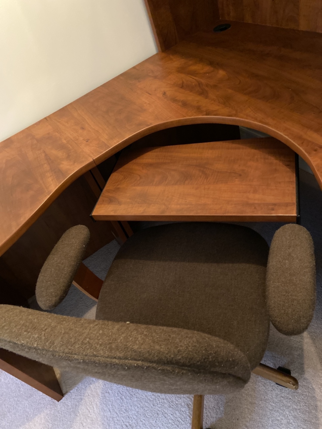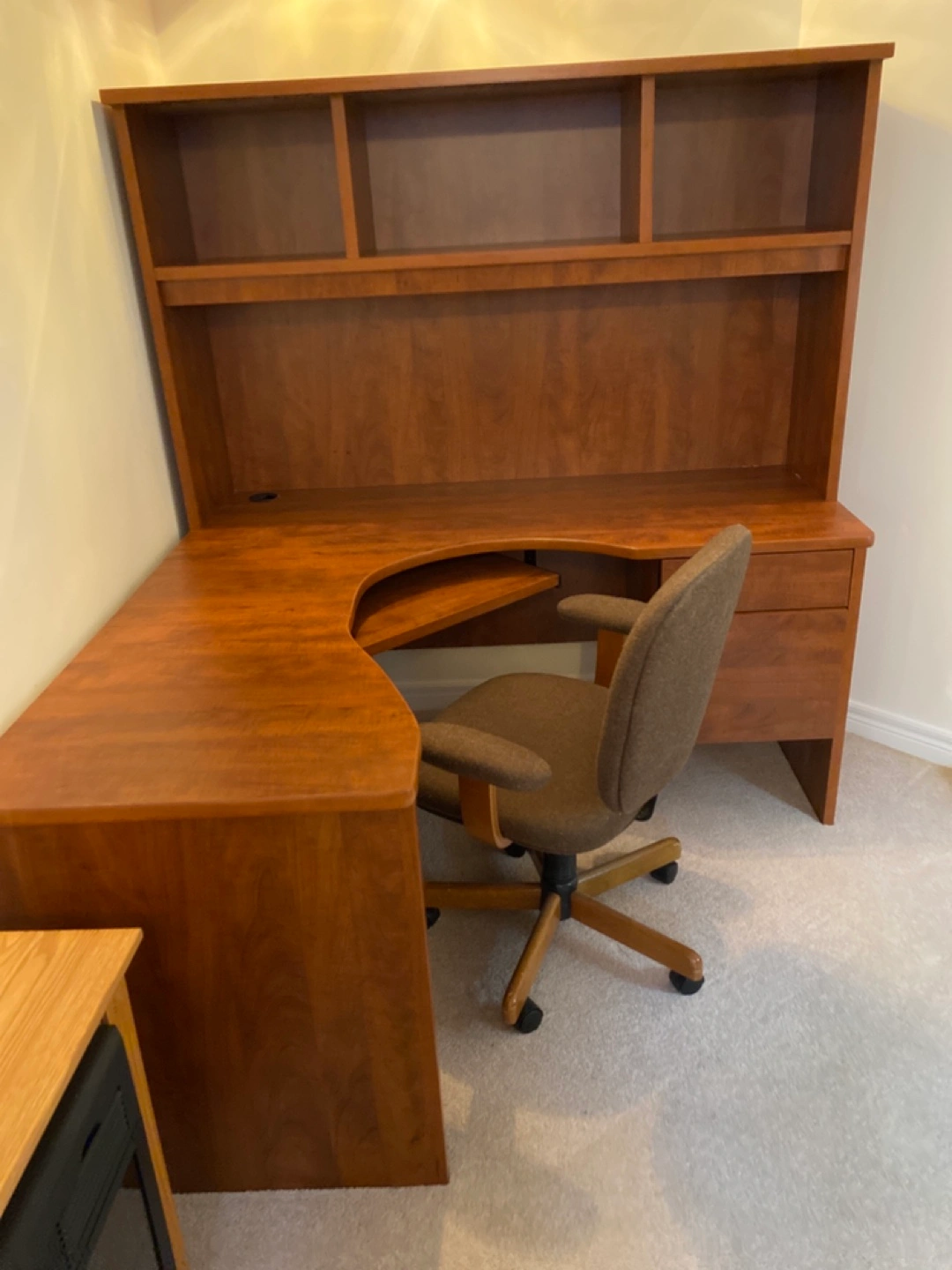 Corner desk with hutch and chair. Two drawers with one file drawer. Keyboard tray included.