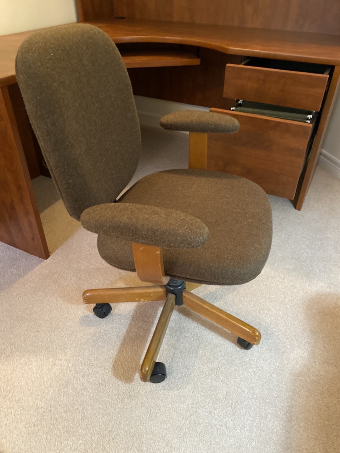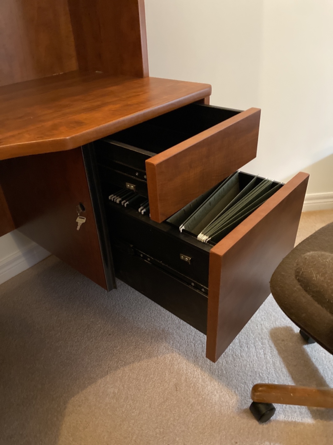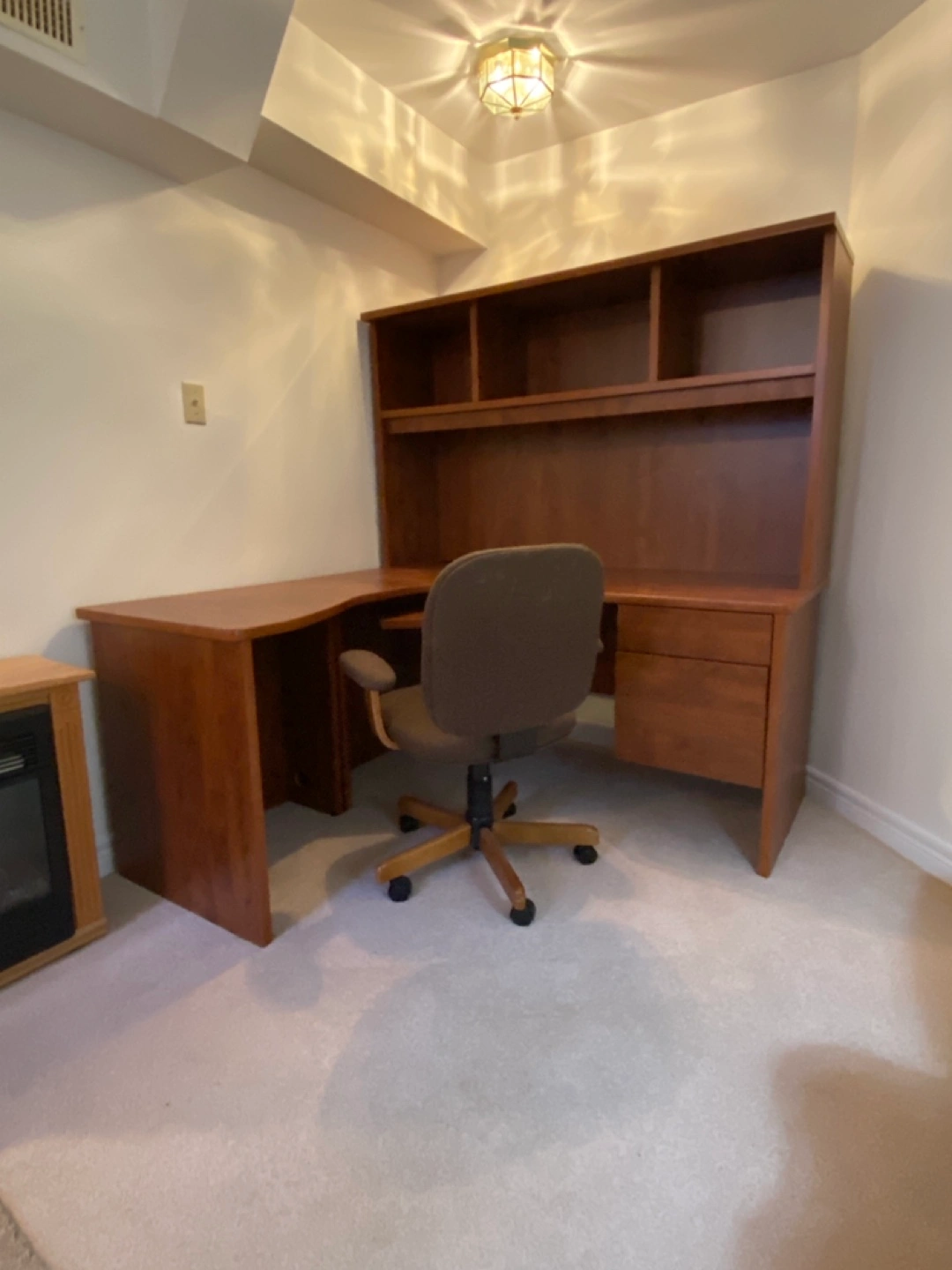 Corner desk with hutch and chair. Two drawers with one file drawer. Keyboard tray included.