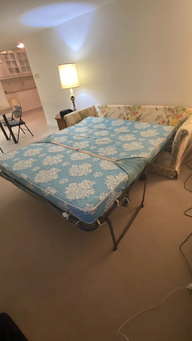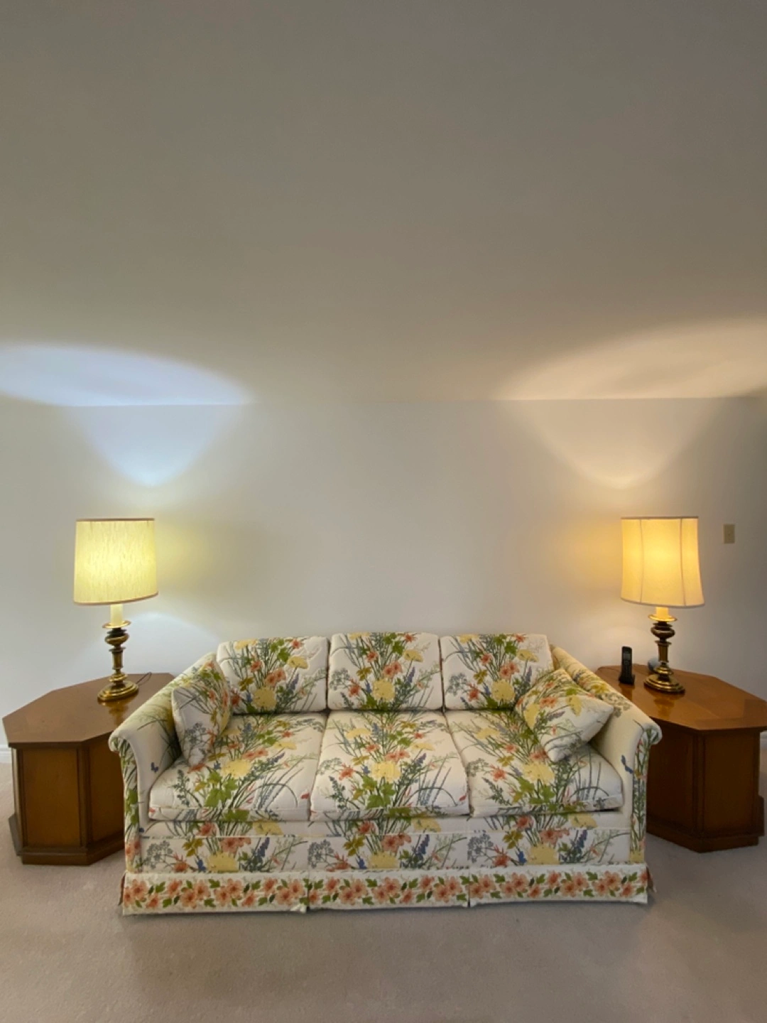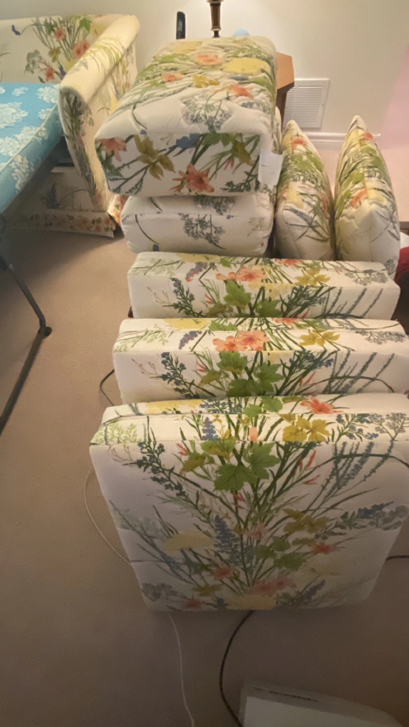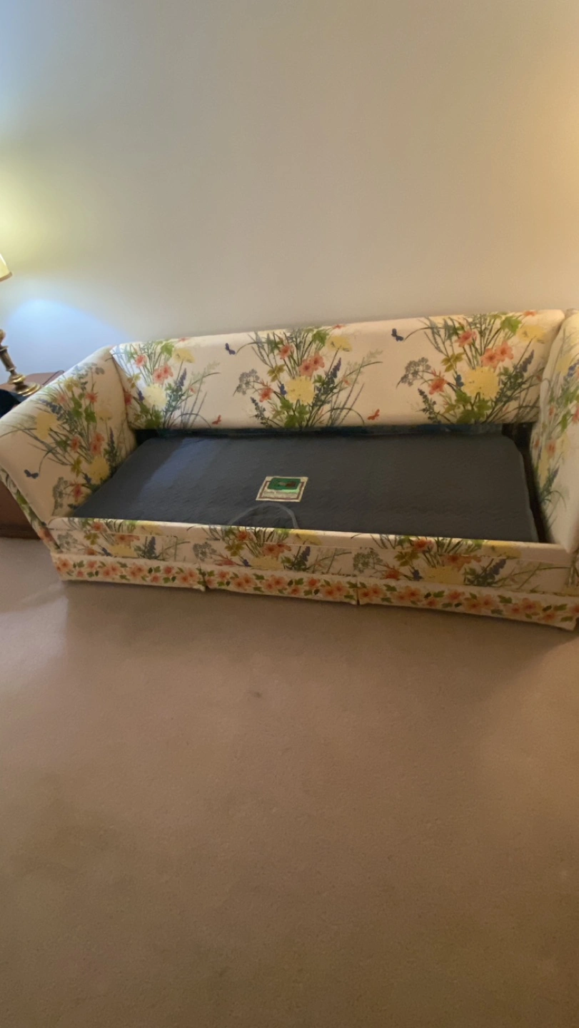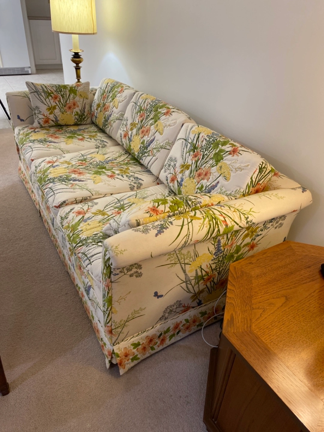 Floral couch with a white background and green, yellow, and blue floral pattern. It has a wood frame and fabric upholstery. 56” wide pull out bed never used. Two throw cushions and three removable back cushions. Very firm and comfortable. Remember if you don’t fancy floral you can purchase complete cover sets of multiple colour choices
