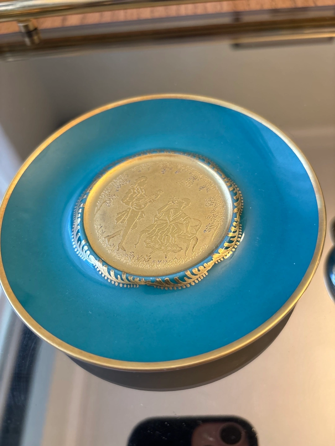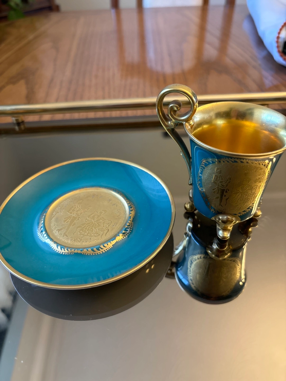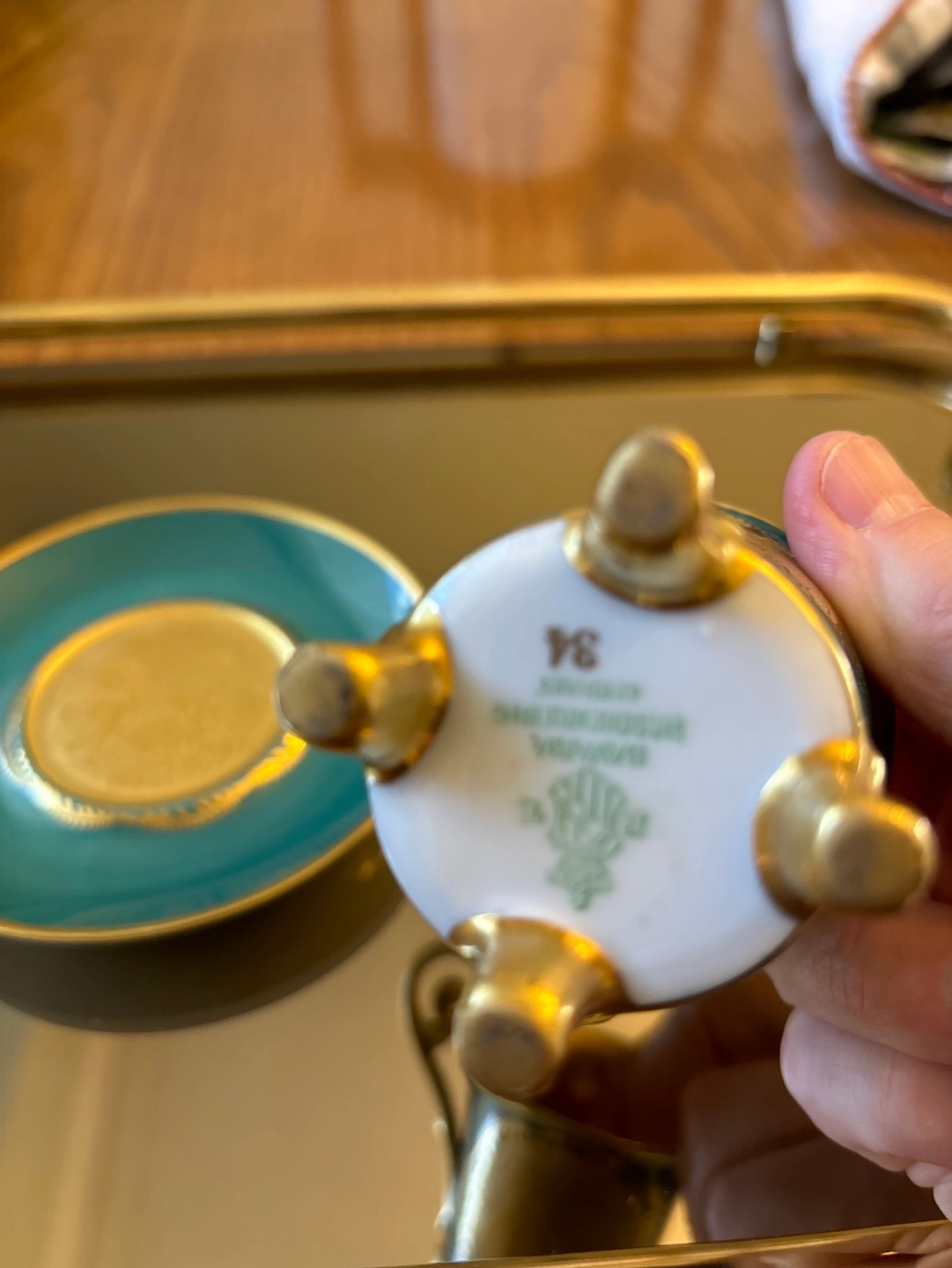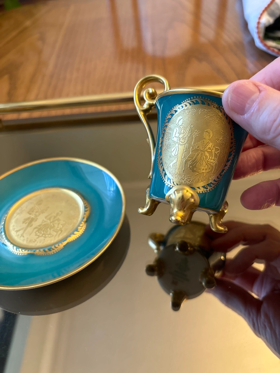Vintage small Green and gold miniature three footed teacup and saucer with gold accents. Features a gold design of people on both the cup and saucer.
