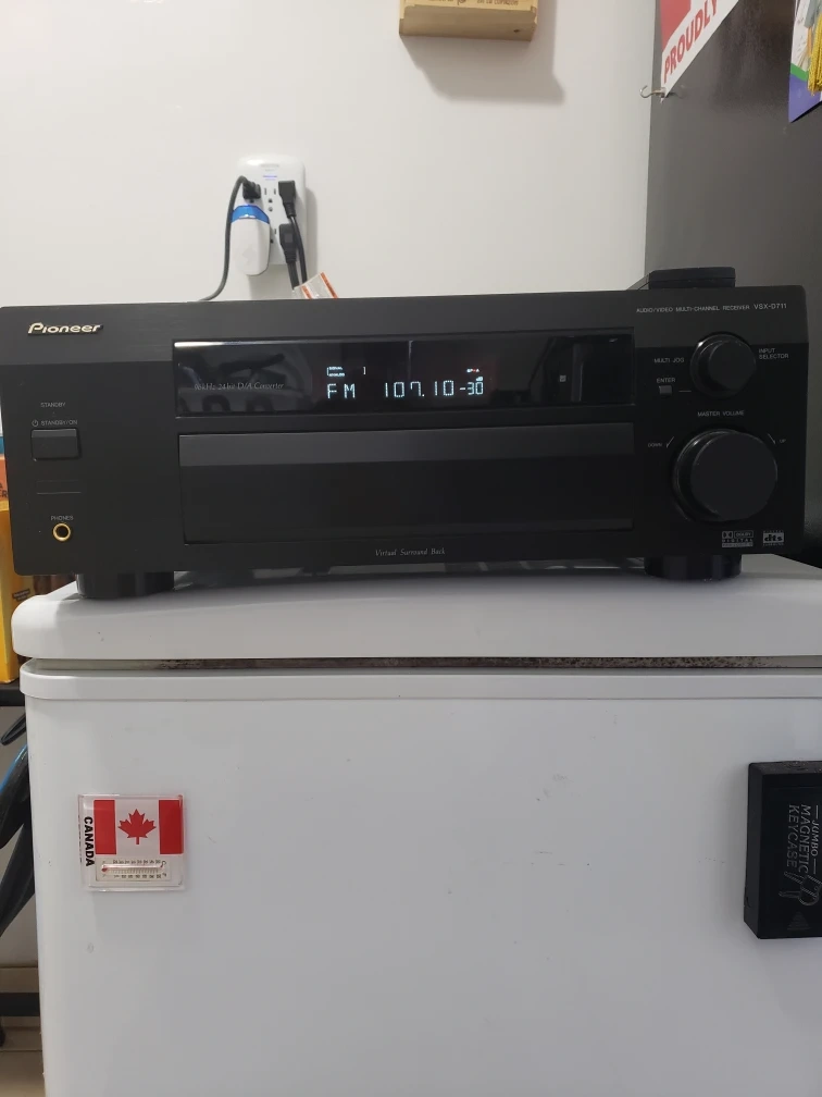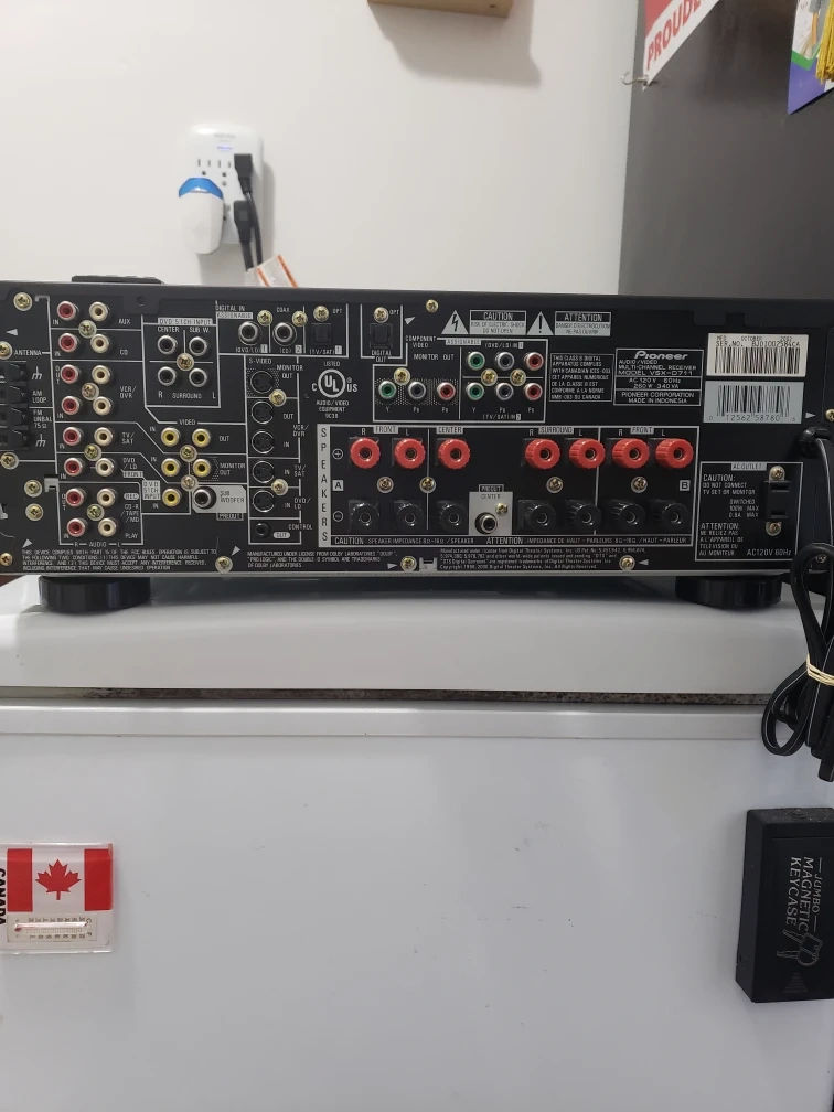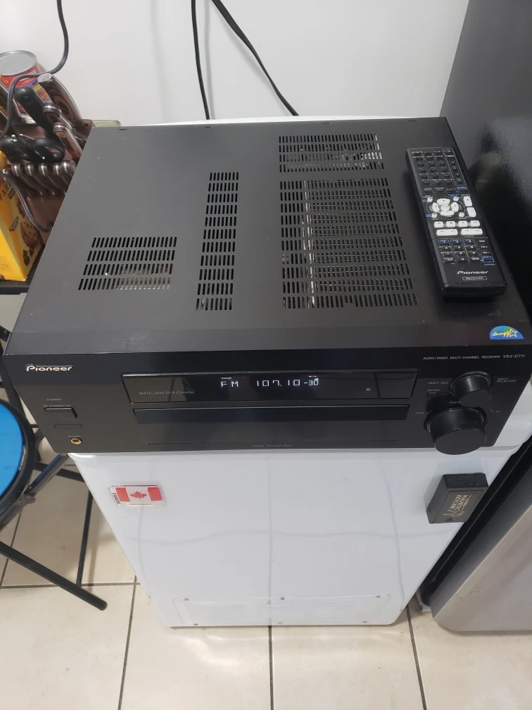 1000+Audio/video receiver with remote. Has multiple inputs and outputs. Includes front and rear speaker outputs and a subwoofer output. very powerful unit, with connections to just about anything you can think of.
