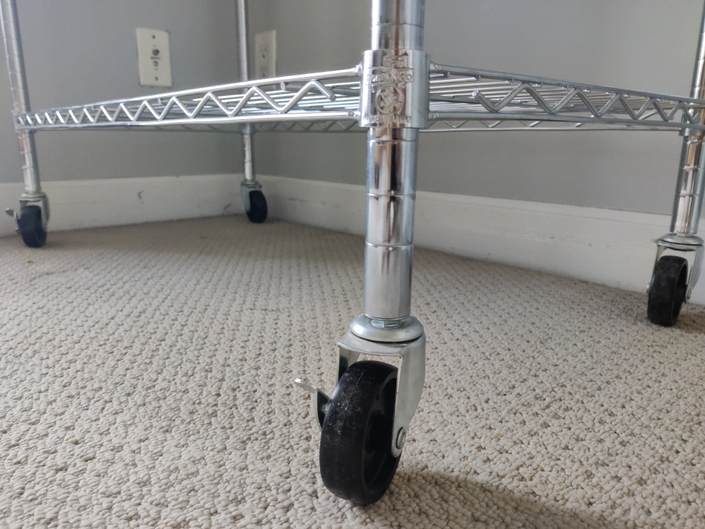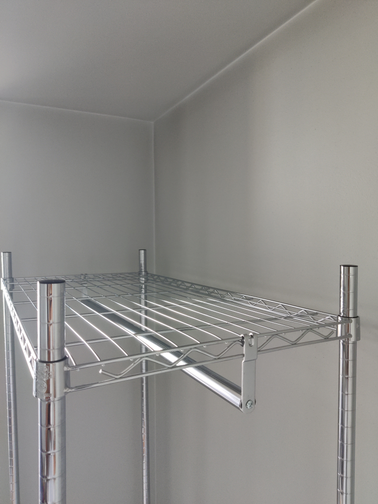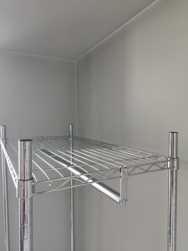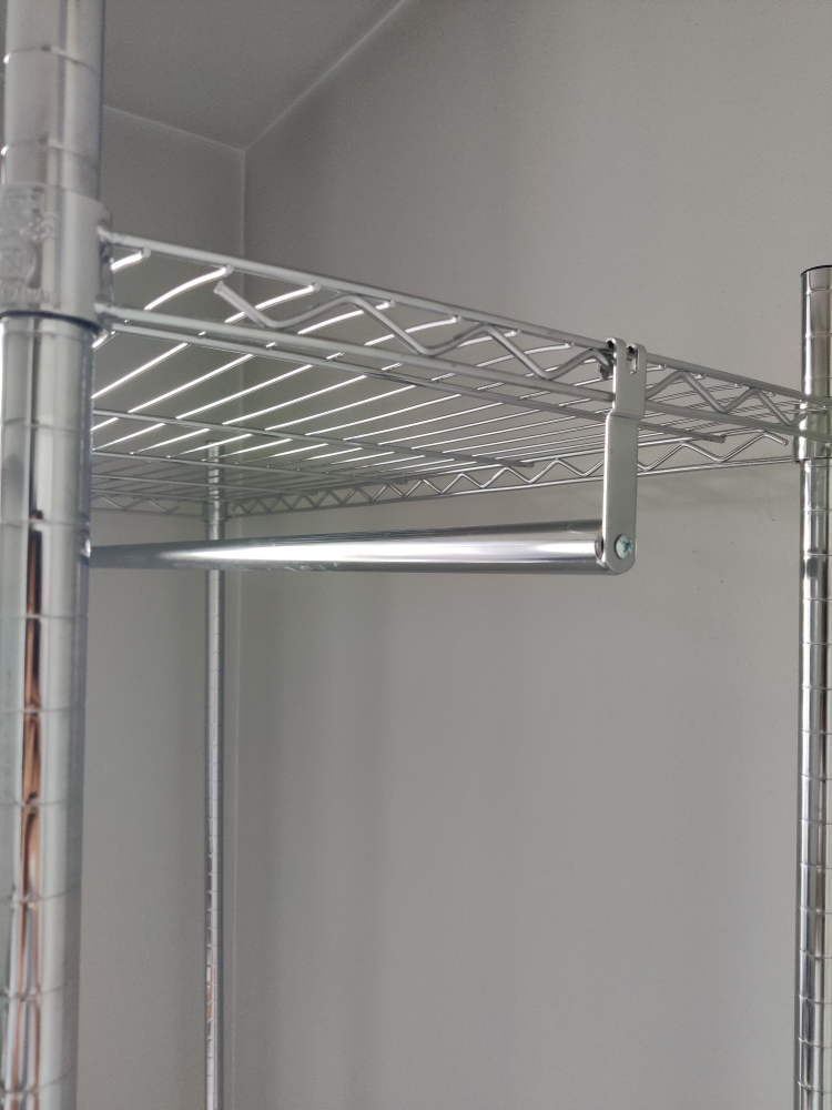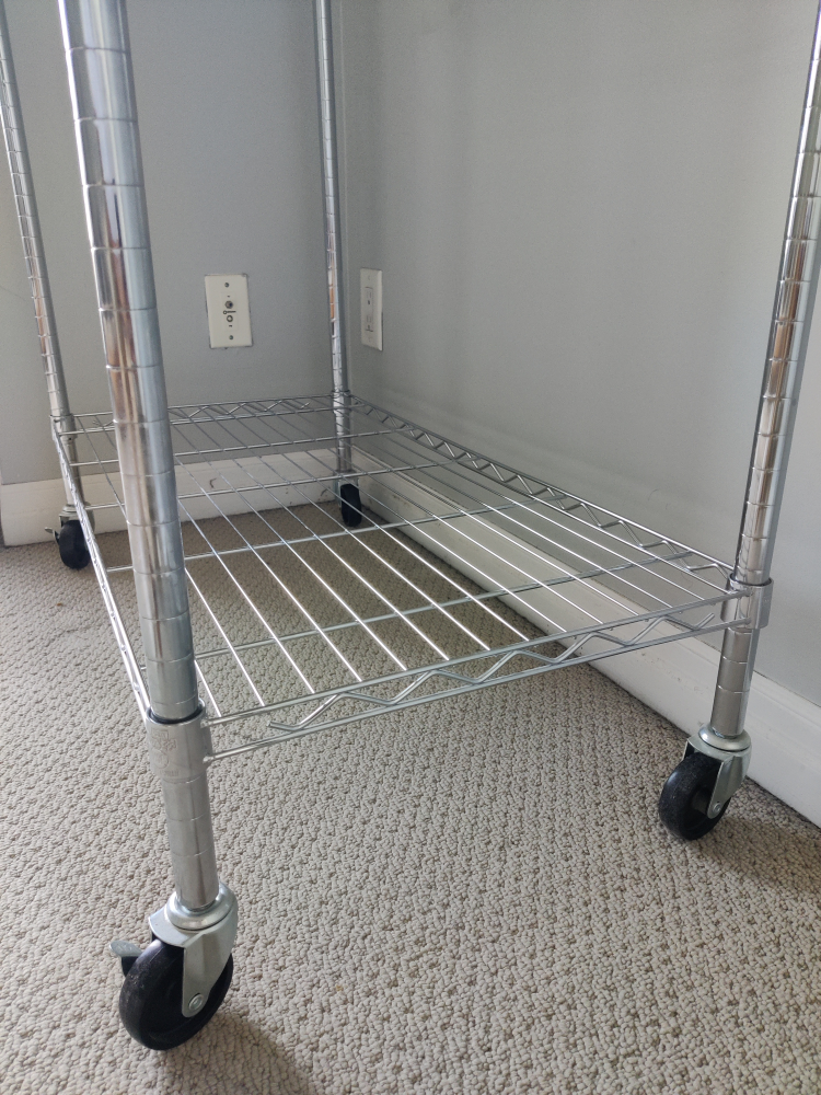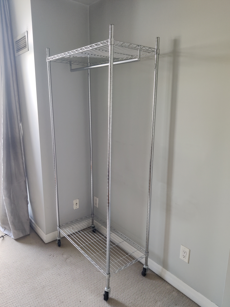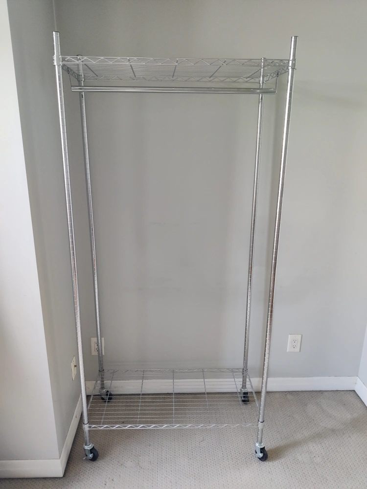 Chrome open closet organizer with a hanging rod and two shelves. Rolling base with four wheels. Good for small spaces or apartments. Im great condition.
