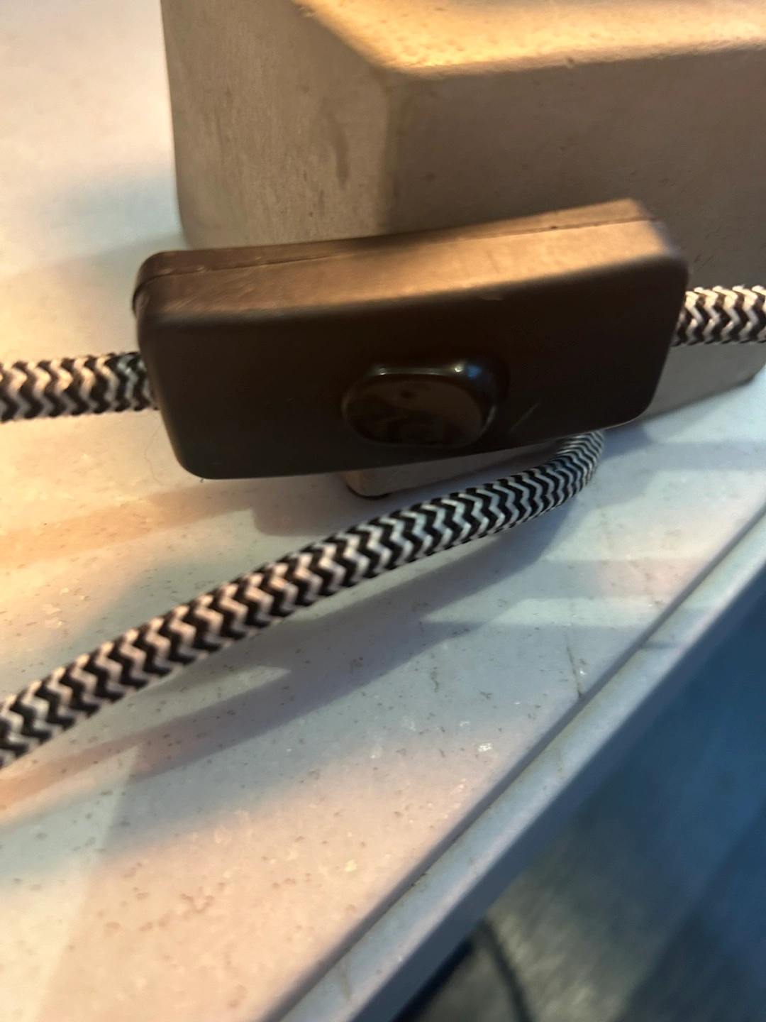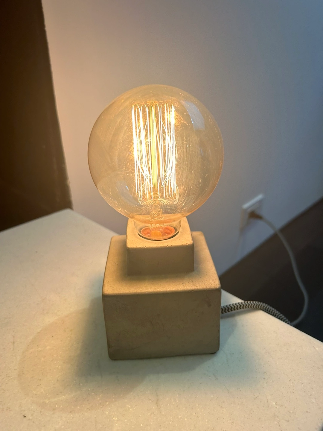 Small concrete lamp with Edison bulb. Has a black and white cord and on off switch. Bulb sits on a concrete block for a cool industrial modern look. Great for nightstand or accent lighting in any room.