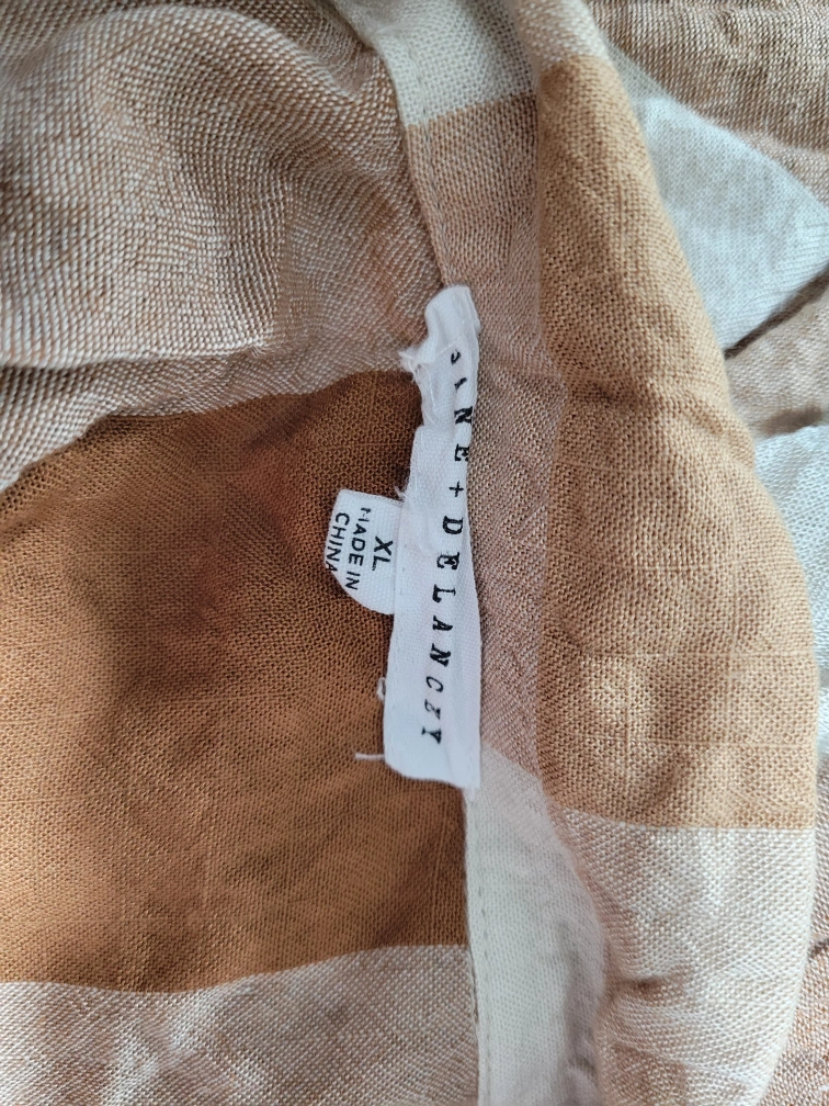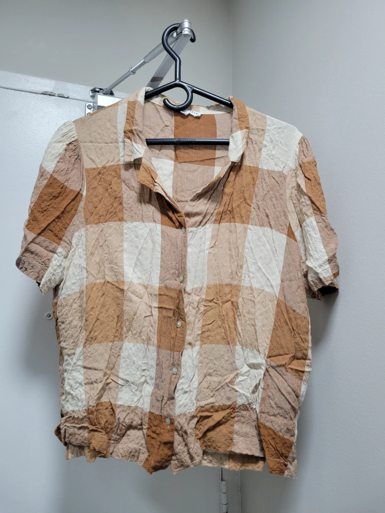 Short-sleeved button up shirt with a plaid pattern in brown and white. Size XL.