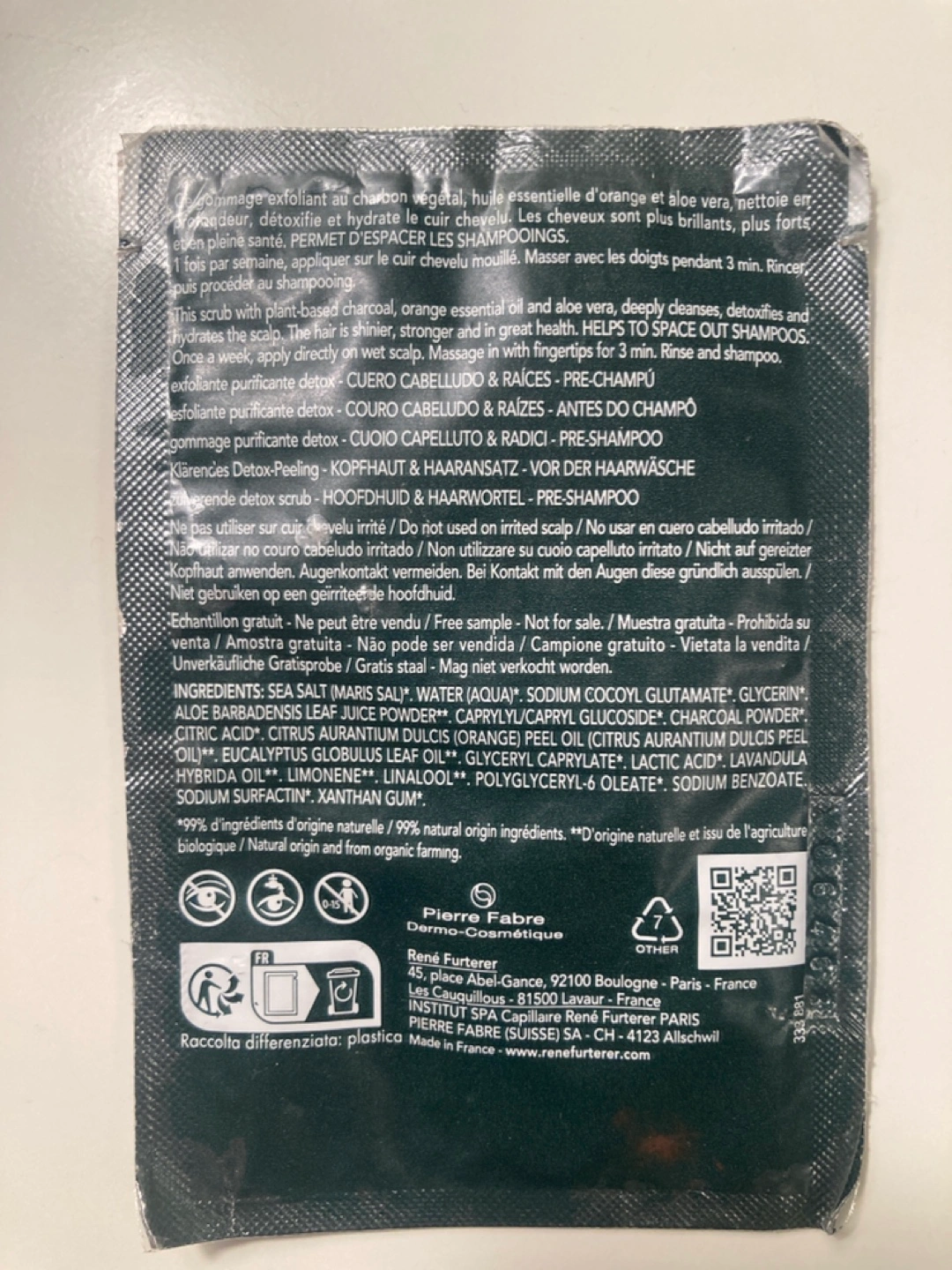 Sample size, 15 ml/0.5 fl oz. Pre-shampoo scalp scrub with charcoal, orange essential oil, and aloe vera. Deeply cleanses, detoxifies, and purifies. Beat up packaging because it was under a few items in my bathroom cupboard but free to anyone who could use this sample for their hair/scalp. Pickup Hurontario and Dundas in Mississauga