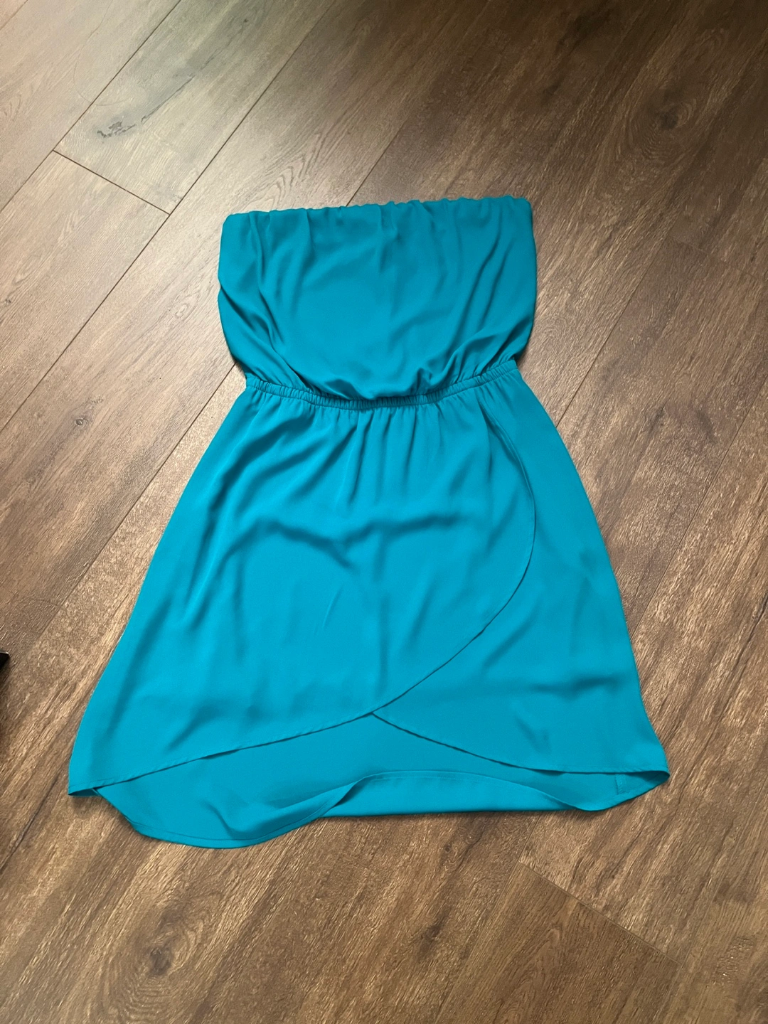Teal strapless dress. Size Medium. Has an elastic band at the waist. Comes from a smoke-free and pet-free home.