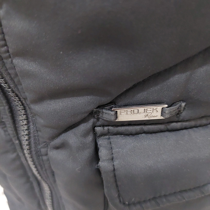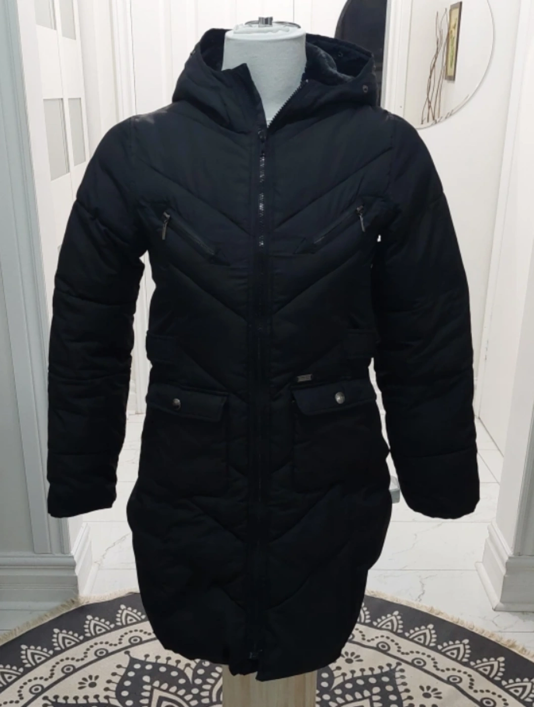 Clean and stylish long black puffer jacket with a hood. Features a zipper closure and pockets.