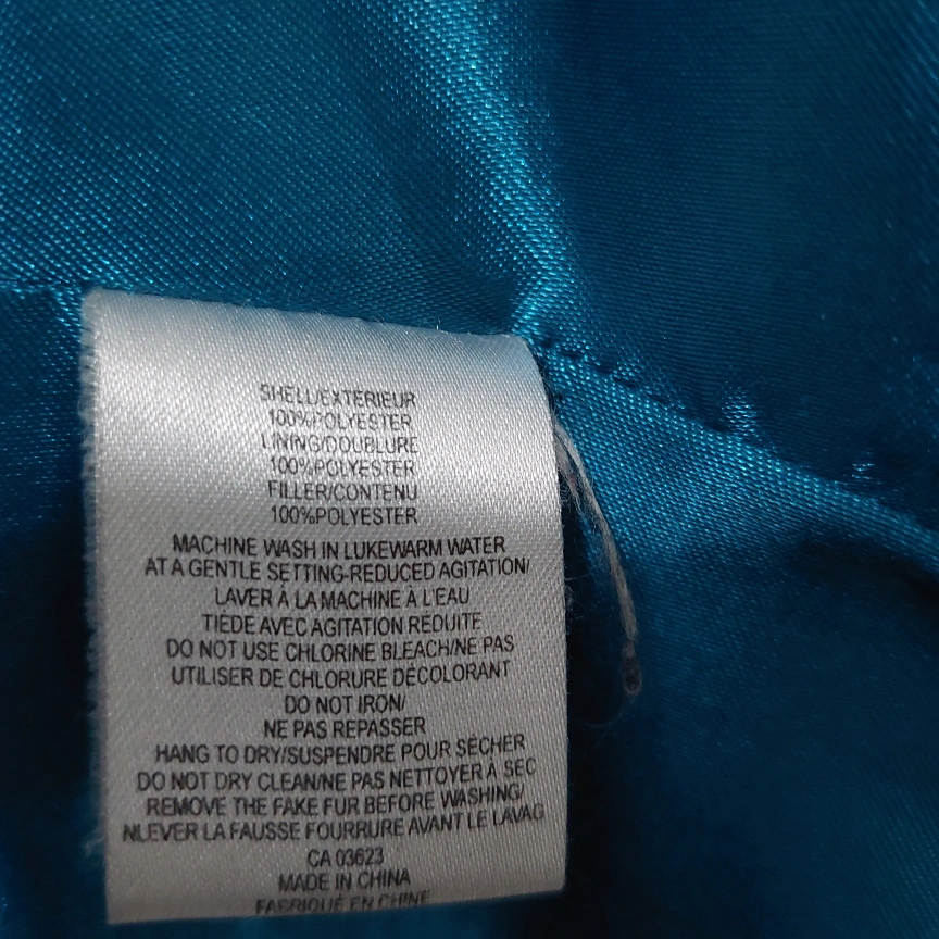 The coat is lined with a beautiful turquoise color and 2 shoulder straps inside.