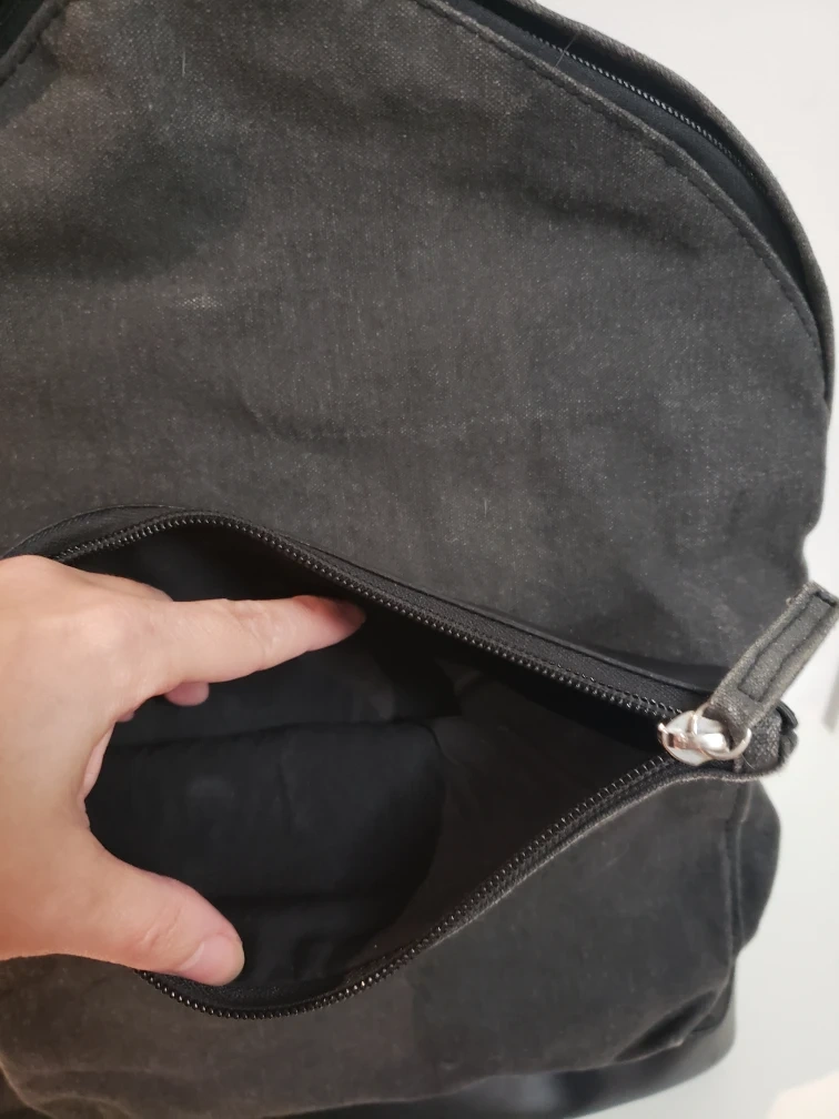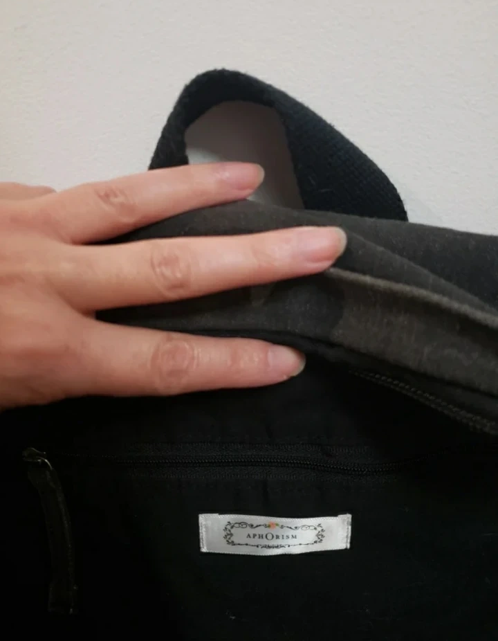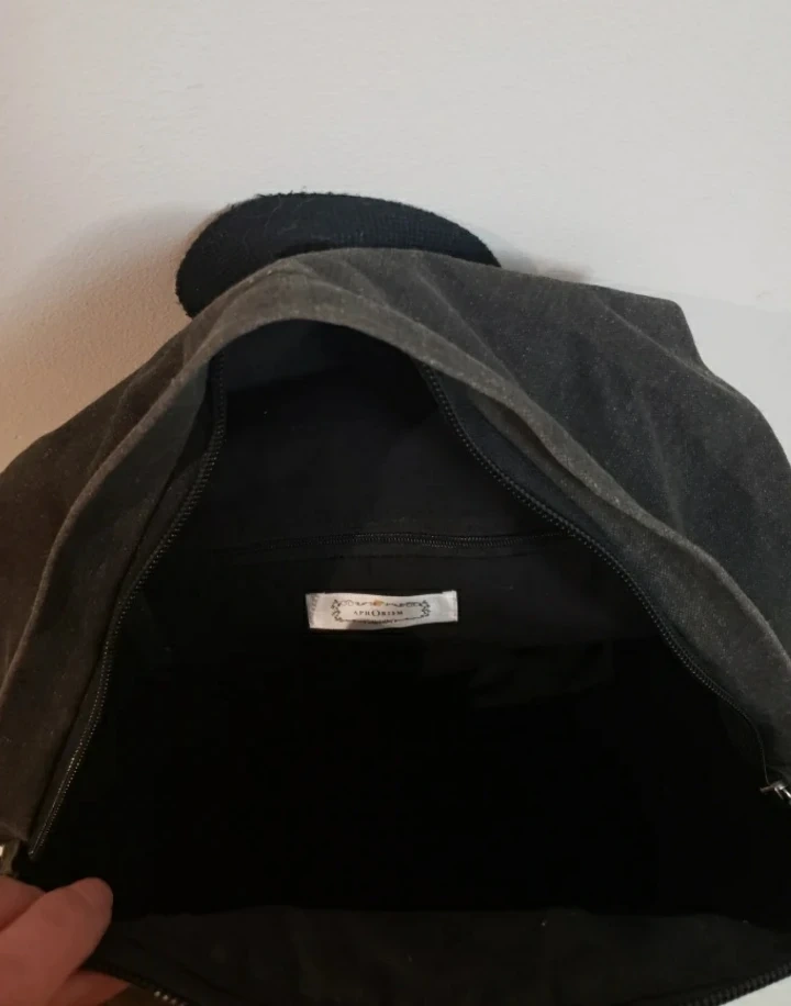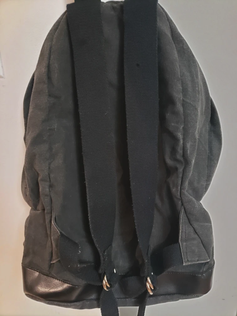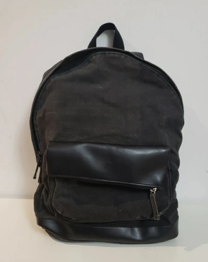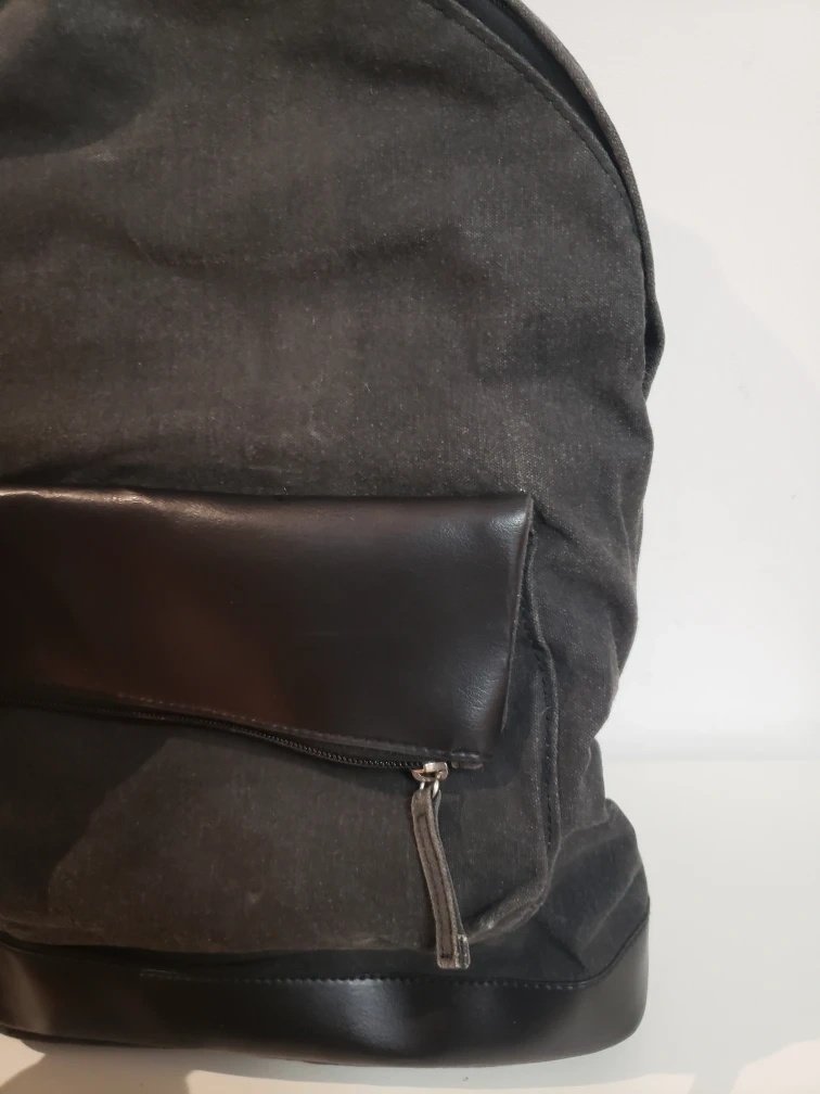 Aphorism grey canvas backpack with black faux leather accents. Had large zippered pocket on the front and inside along with adjustable straps.