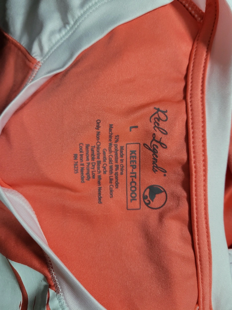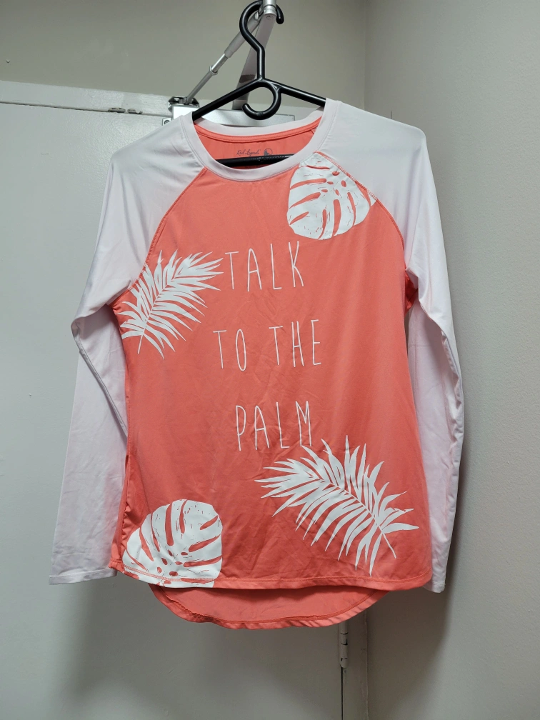 Long sleeve, coral colour, white sleeves and collar, Keep-It-Cool technology. Has white print that says 'Talk to the palm' and includes leaves and palm tree designs.
