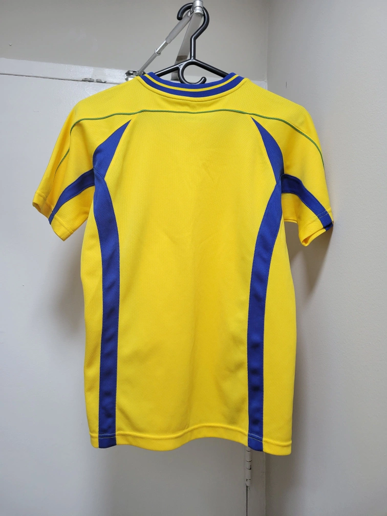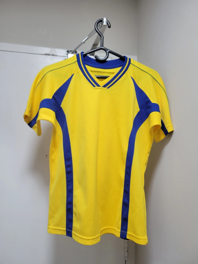Yellow soccer jersey with blue and green accents. Short sleeves and a V-neck.