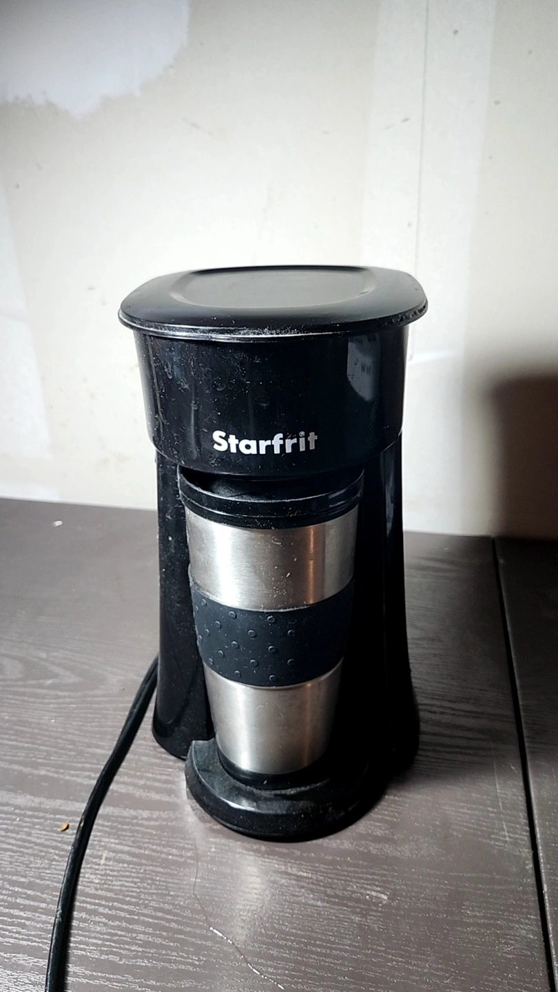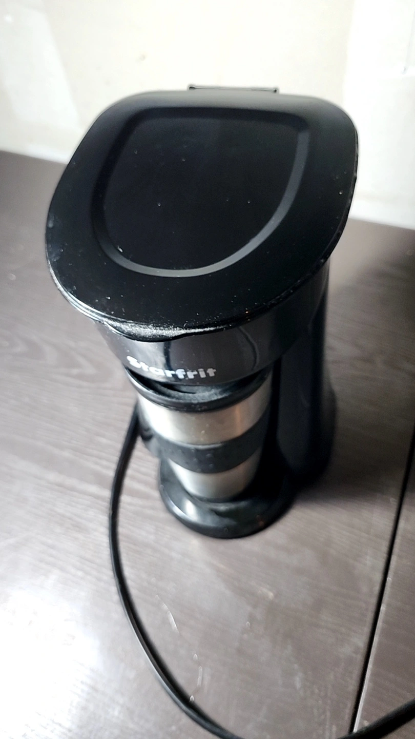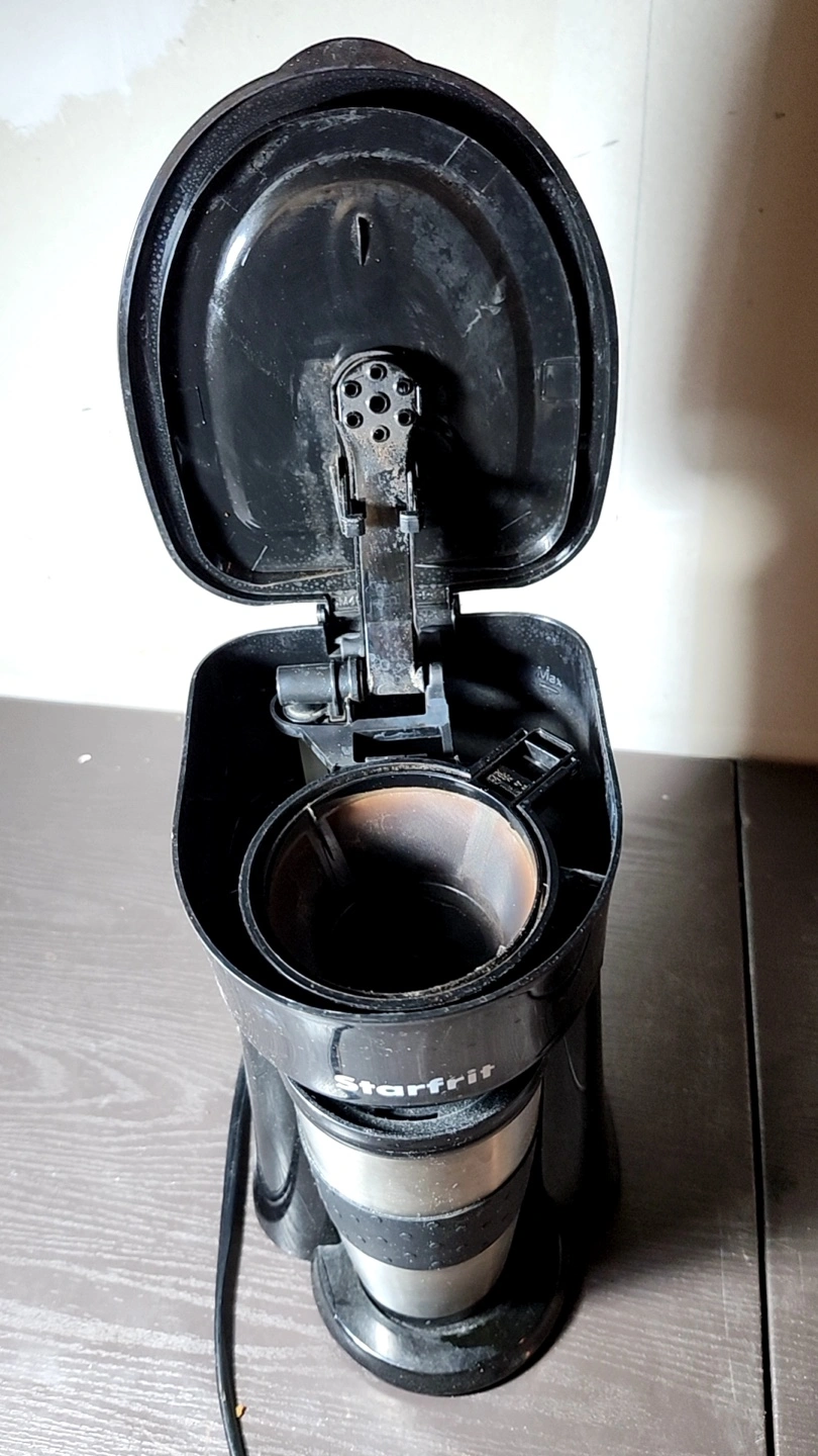 152Black single serve coffee maker with travel mug. Includes a removable filter basket.