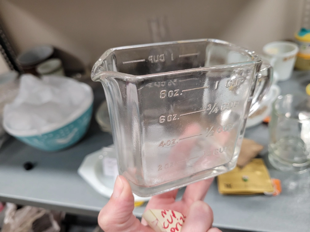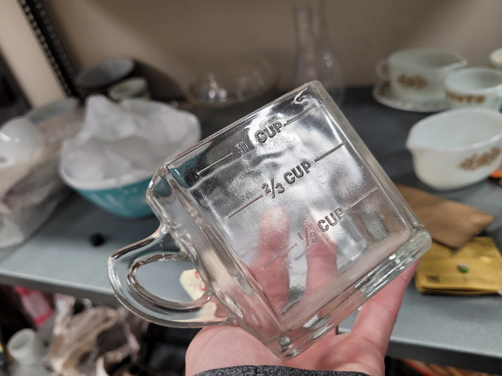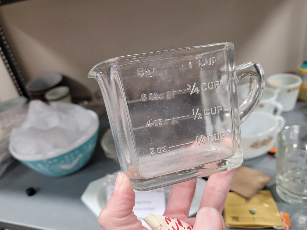 hazel atlas glass measuring cup. unique shape was for a cereals box promotion. Glass measuring cup with a handle. Marked 1 cup, 3/4 cup, 1/2 cup, 1/4 cup, 8 oz, 6 oz, 4 oz, and 2 oz. Must pickup. Please. no etransfer or long holds. this is a cash price. bring cash. This is in storage and I will meet you there. I can access the building during 8 to 430 Monday to Friday. No one is there outside of those times.