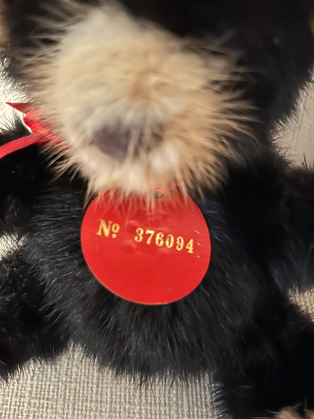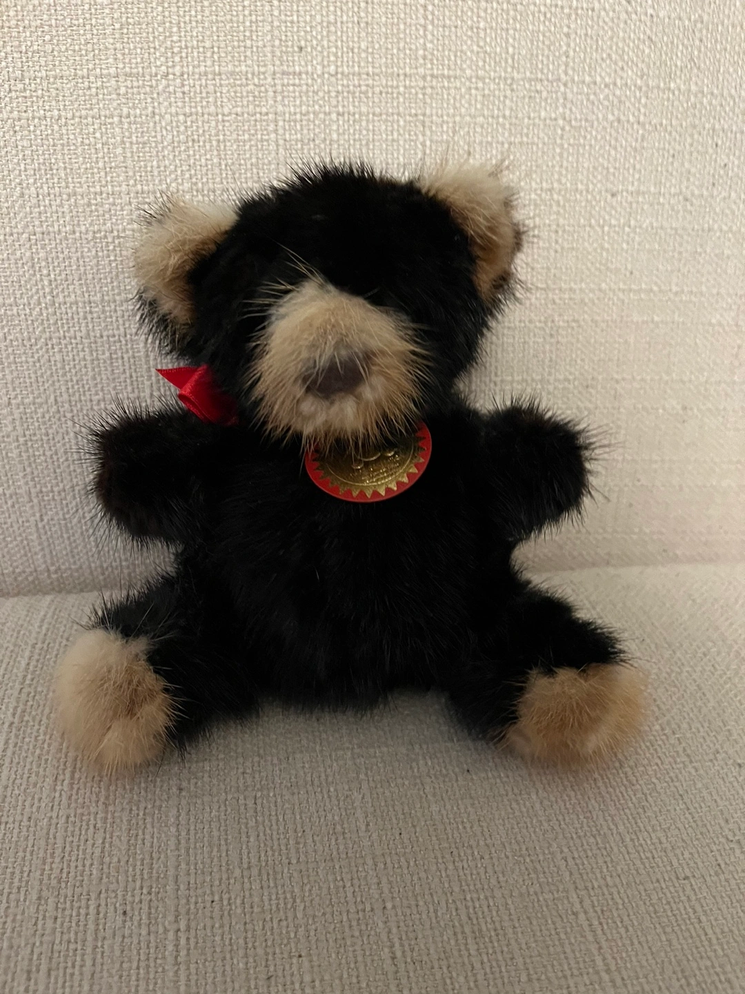 Third Generation Rare Bear Mink teddy bear with a red ribbon. Authentication Tag Ribbon - number 376094.