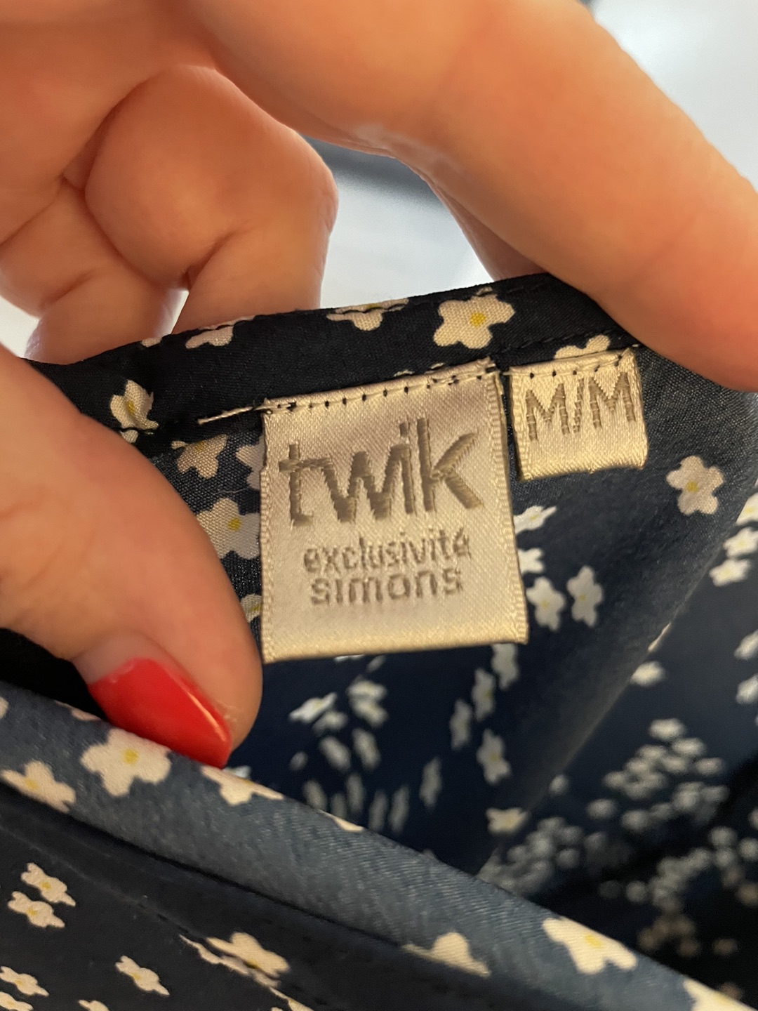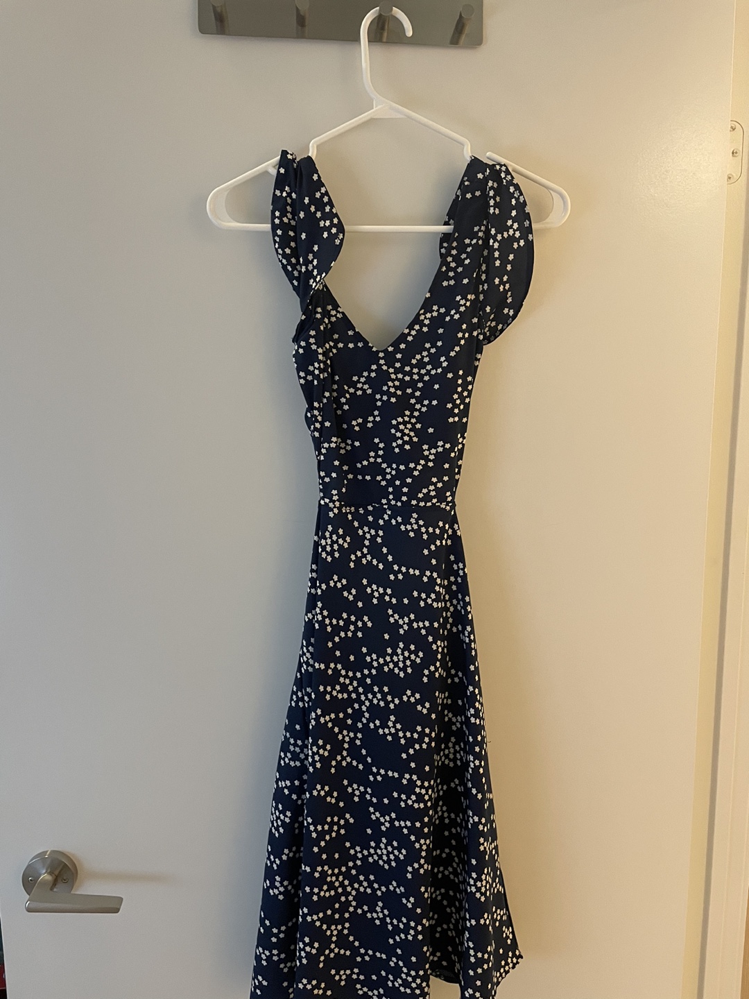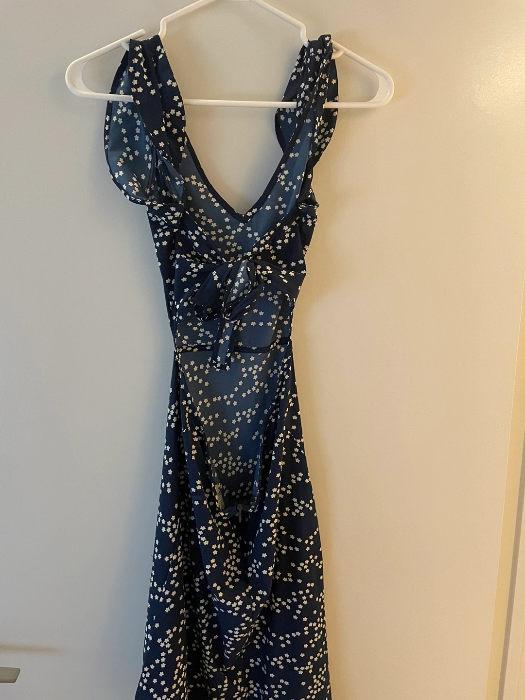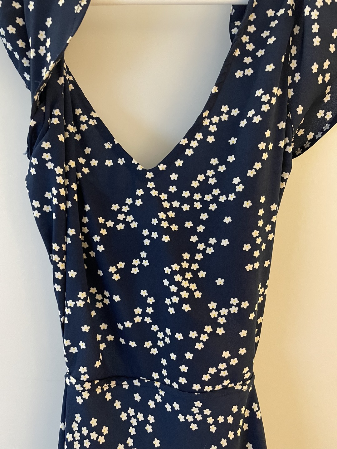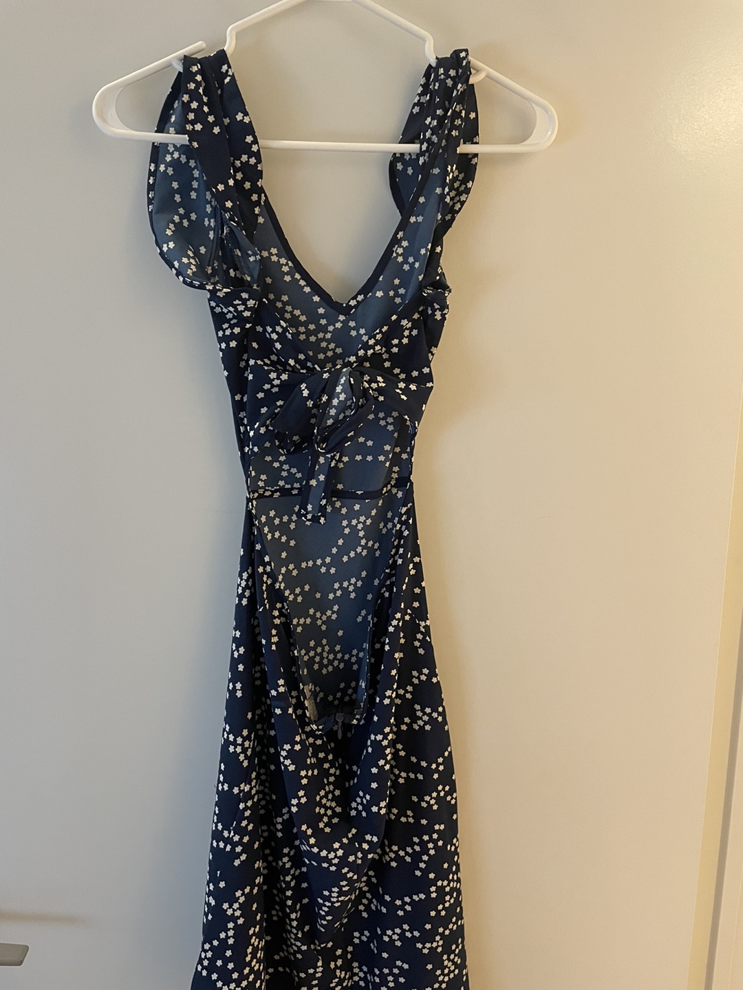 Beautiful Twink dress from Simons. White daisies on navy blue background. Tie back with side cutouts. Worn once