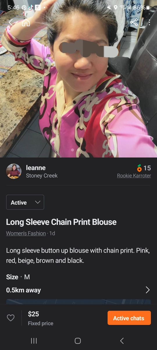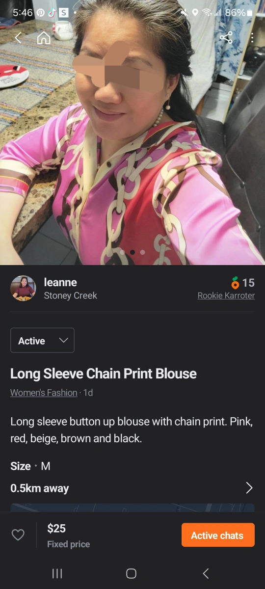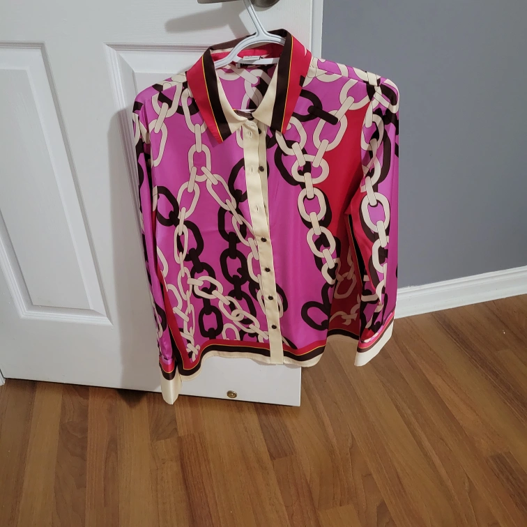 35Long sleeve button up blouse with chain print. Pink, red, beige, brown and black.
