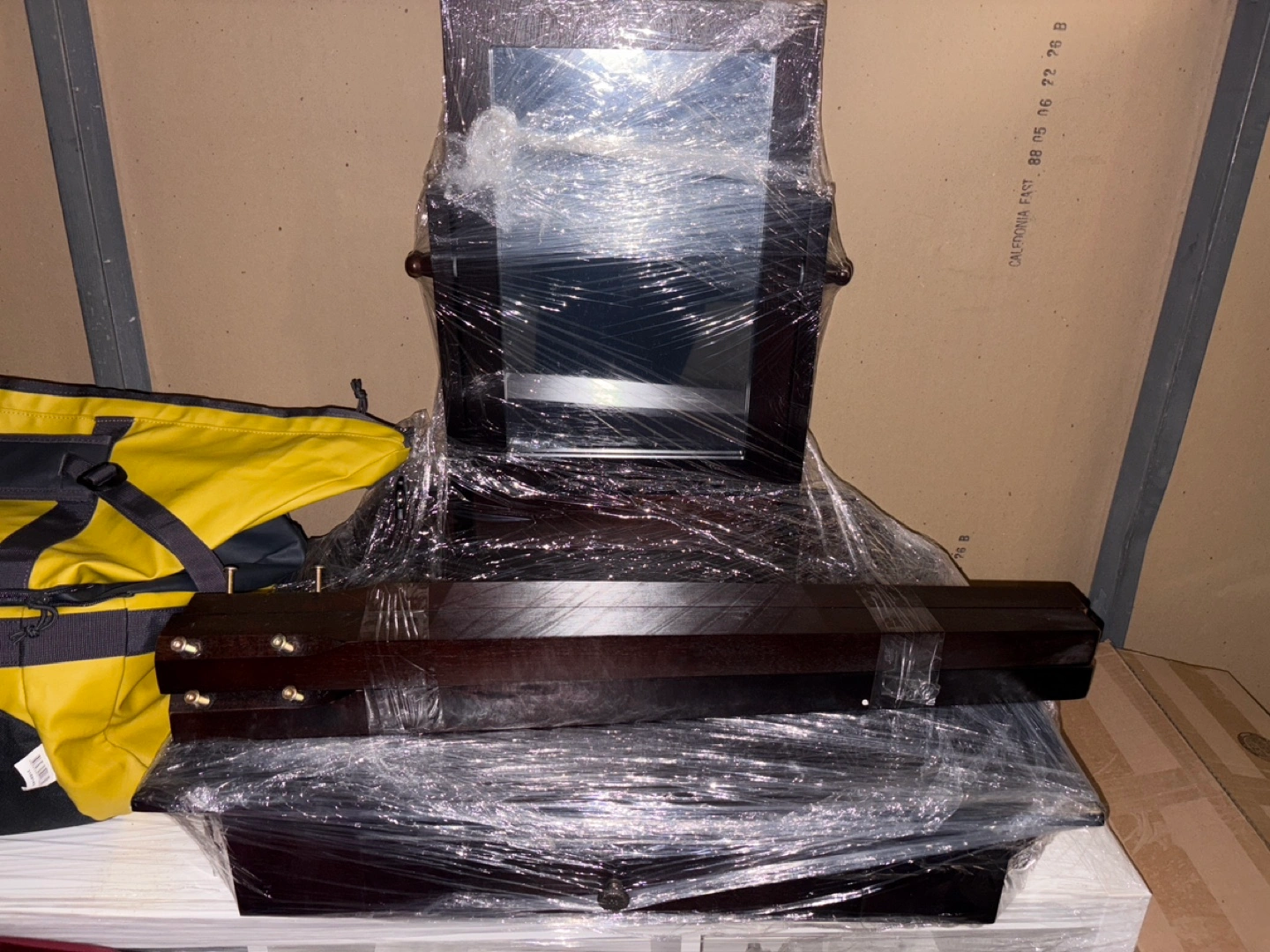 Wooden vanity with mirror. Wrapped in plastic for protection.