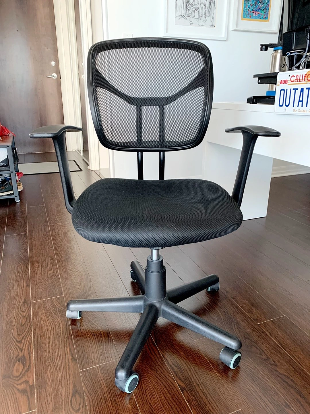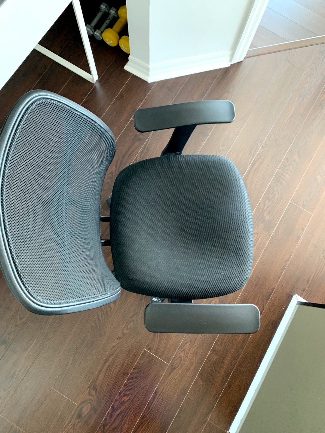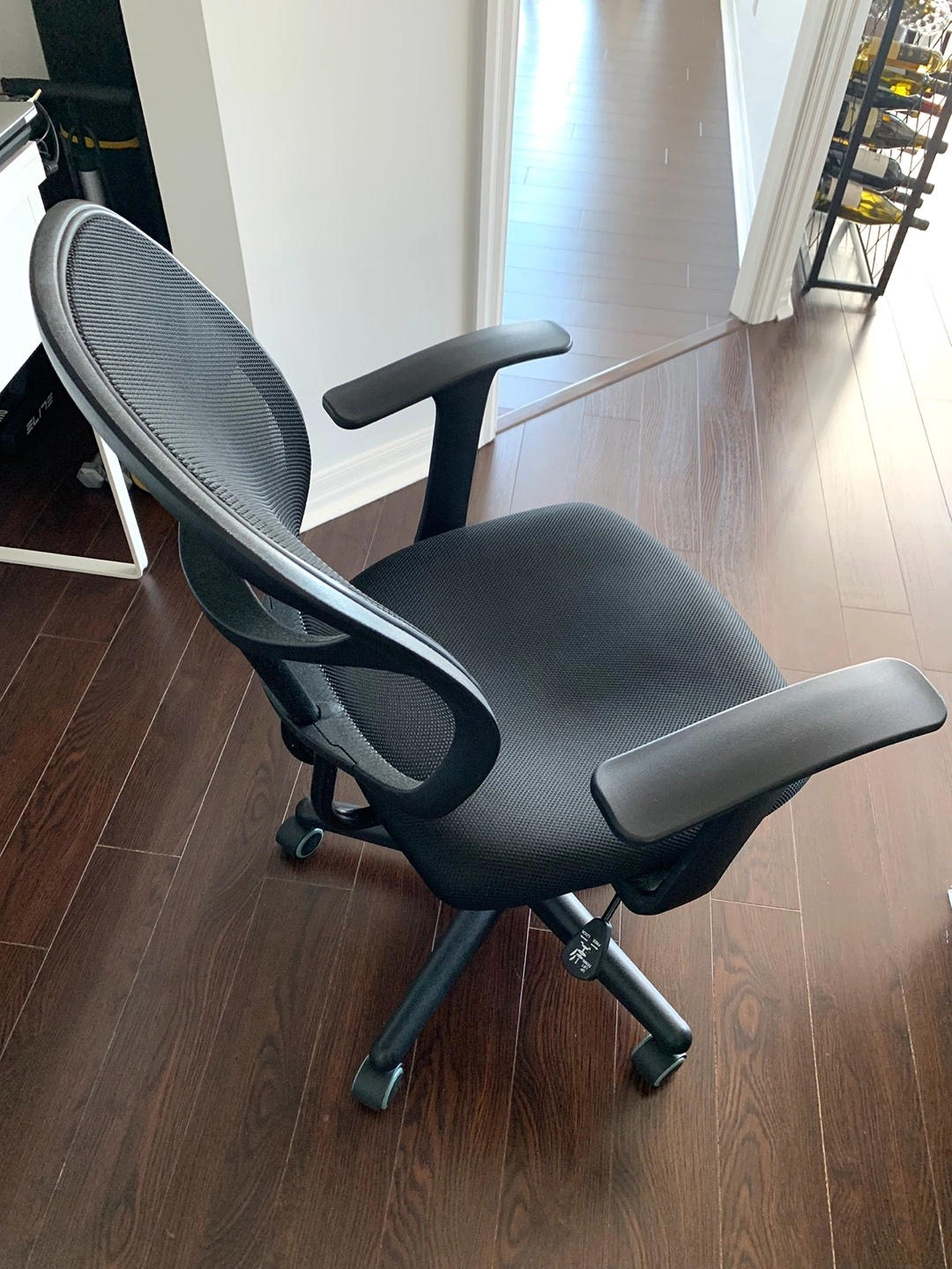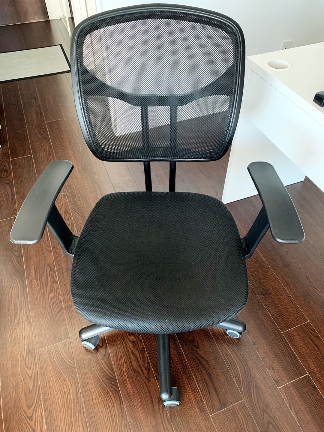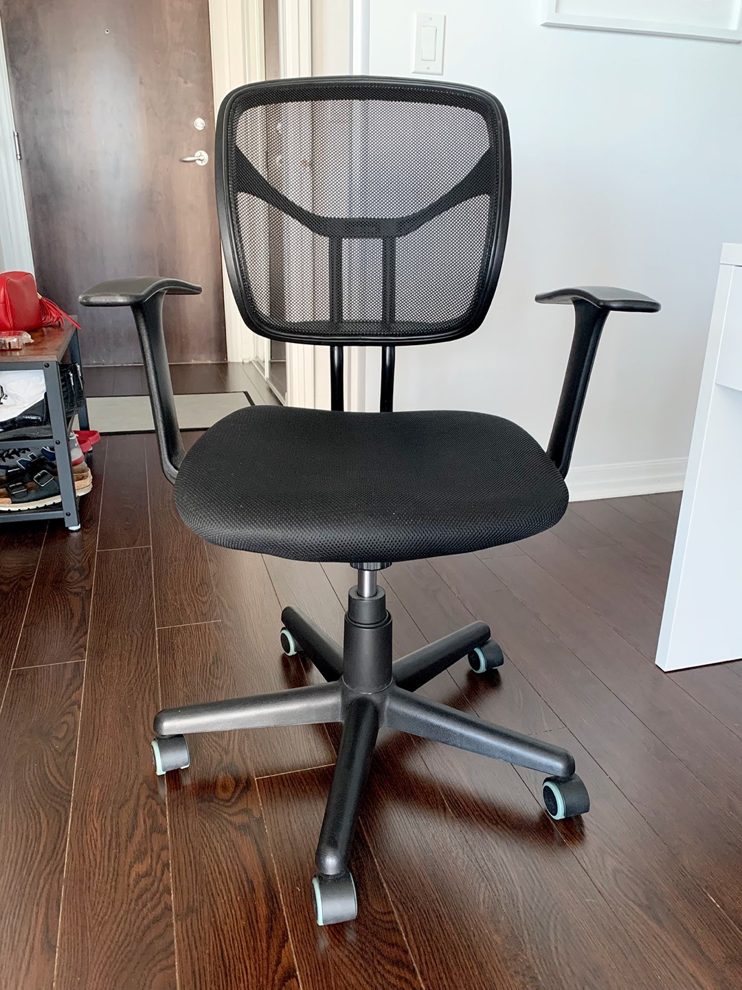 Selling this Amazon Basics Chair in excellent condition. Mesh Back, Swivels - Black. Comfortable office chair with contoured mesh back for breathability. Pneumatic seat-height adjustment; padded seat for comfort. 225-pound maximum weight capacity
