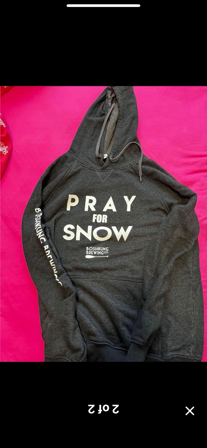 Grey hoodie with a white graphic. The graphic says 'Pray For Snow' and has a small logo for Boshkung Brewing Co. below it. The left sleeve also has Boshkung Brewing Co. written down it.