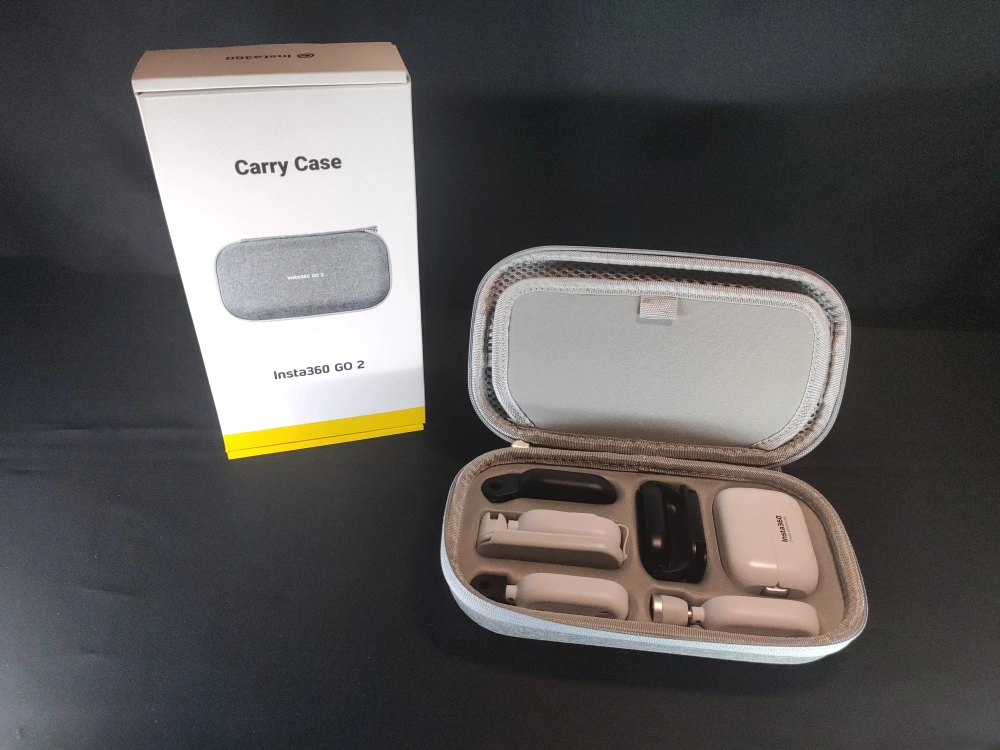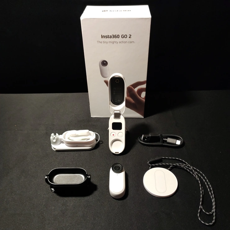 Insta360 GO 2 64GB action camera with all accessories. Includes charging case, mounting accessories, carrying case and lanyard. Selfie stick also included. No box.